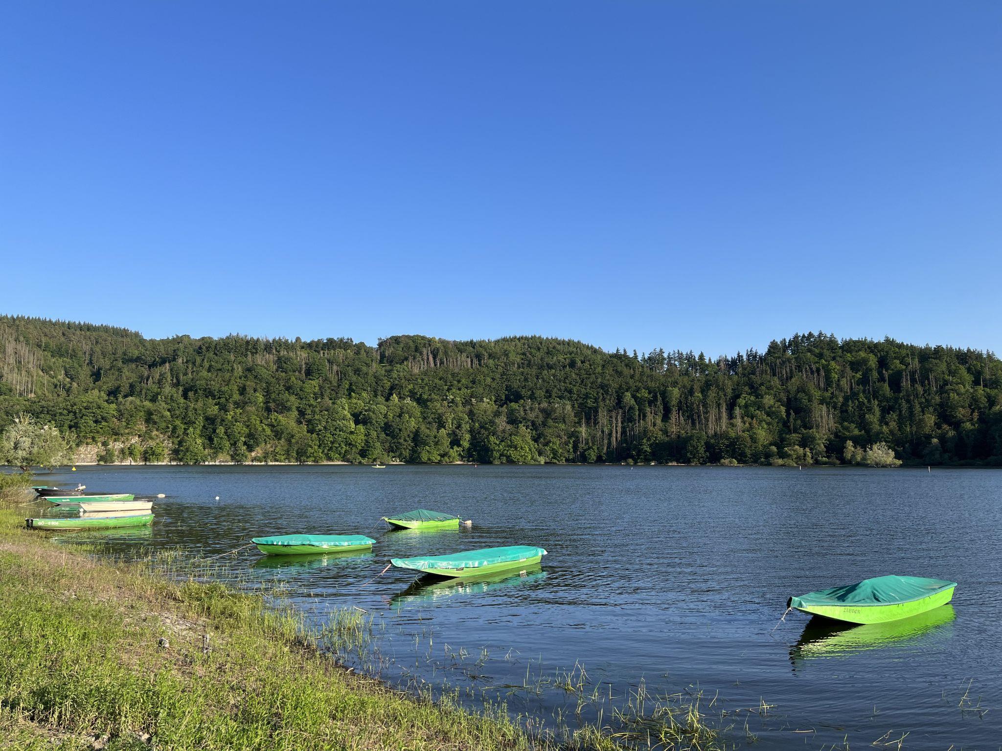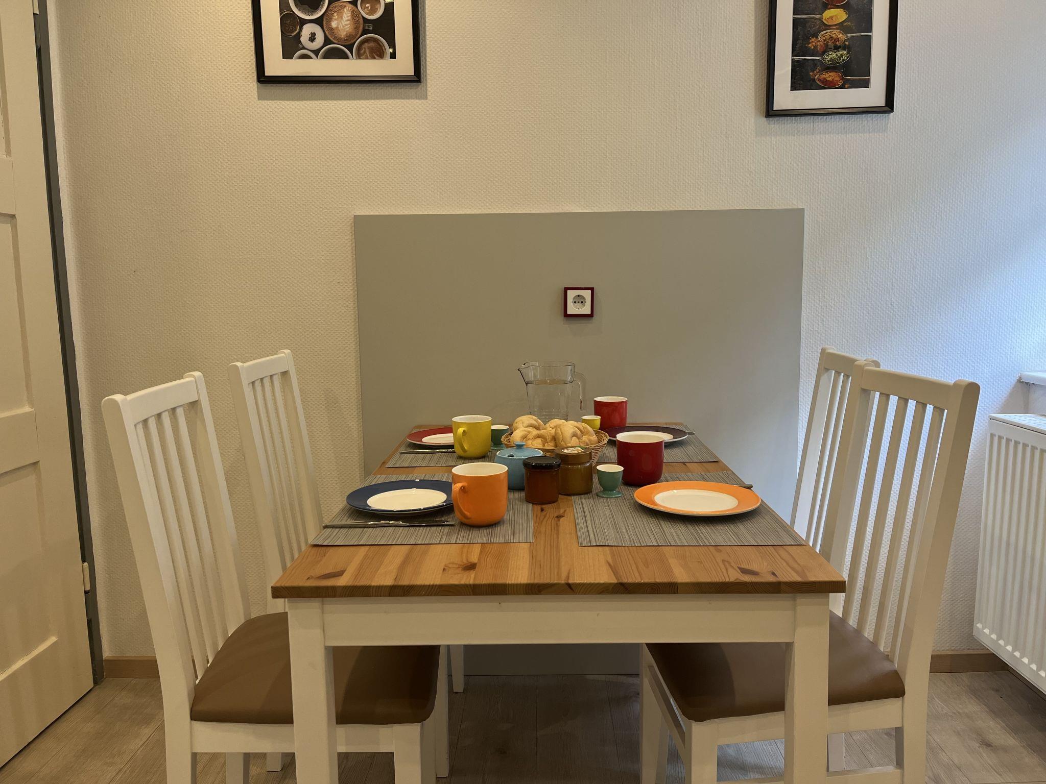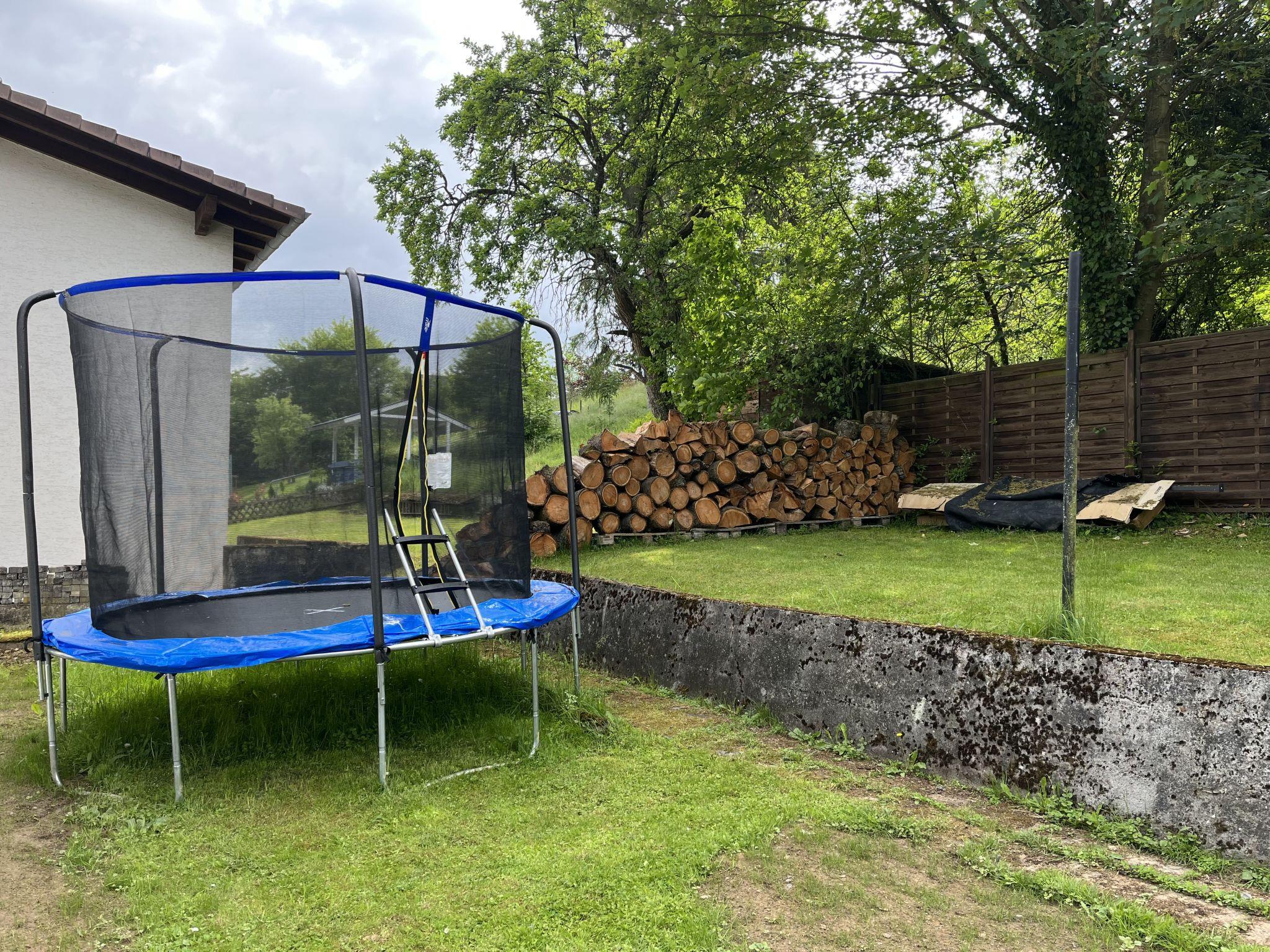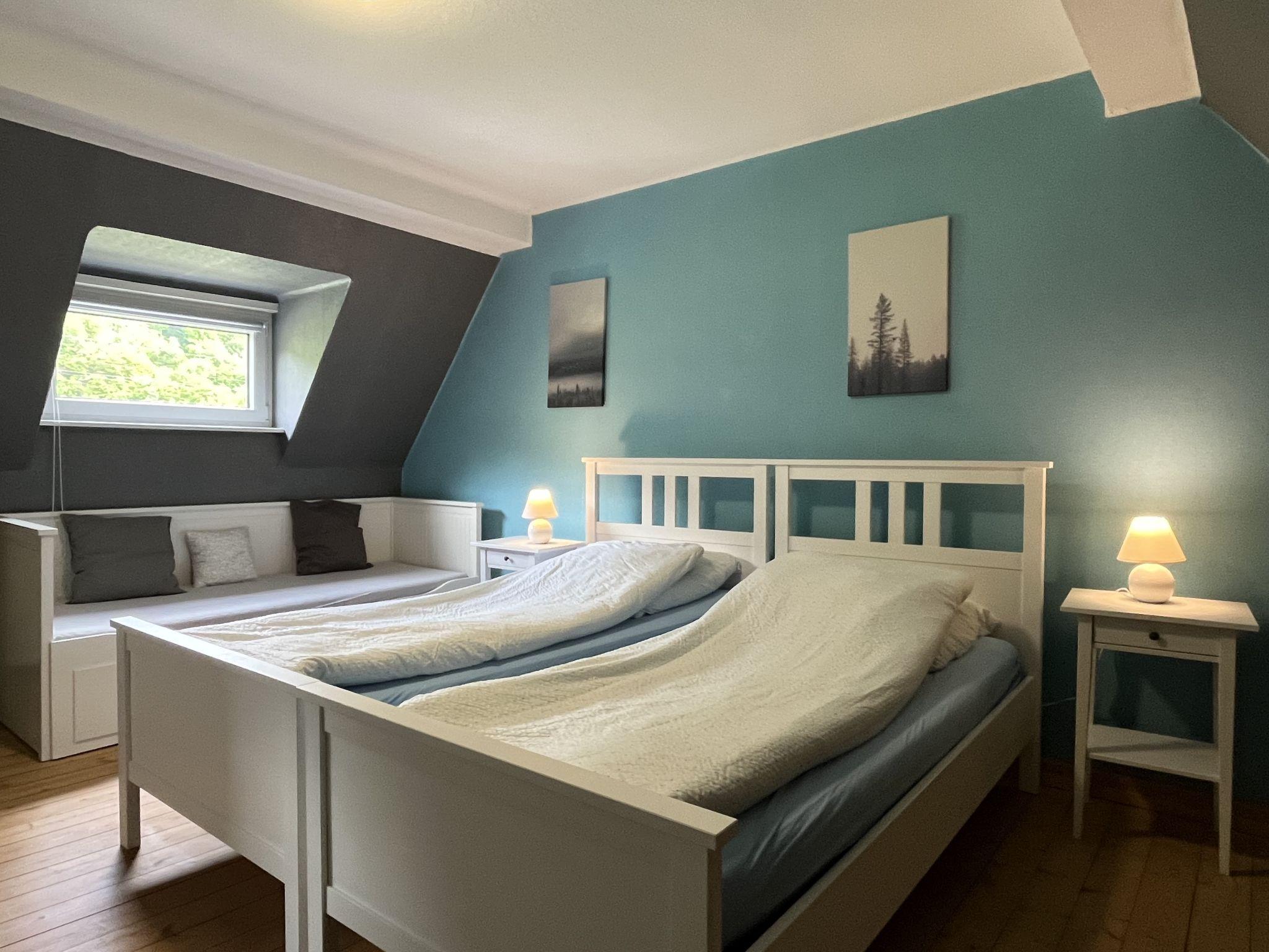 4-room semi-detached house 100 m2. Modern and cosy furnishings: living/dining room with satellite TV. Kitchen (oven, dishwasher, 4 ceramic glass hob hotplates, toaster, kettle, microwave, electric coffee machine) with dining table. Shower/WC. Upper floor: 1 double bedroom with sloping ceilings with satellite TV. 1 room with sloping ceilings with 2 beds. Oil heating. Wooden floors. Large patio partly roofed. Terrace furniture, barbecue (portable) (2). Beautiful view of the forest. Facilities: children's high chair, baby cot for up to 2 year olds, hair dryer. Internet (WiFi, free). Parking (roofed) at the house. Please note: suitable for families. Non-smoking house. Maximum 2 pets/ dogs allowed. Smoke alarm, fire extinguisher.