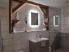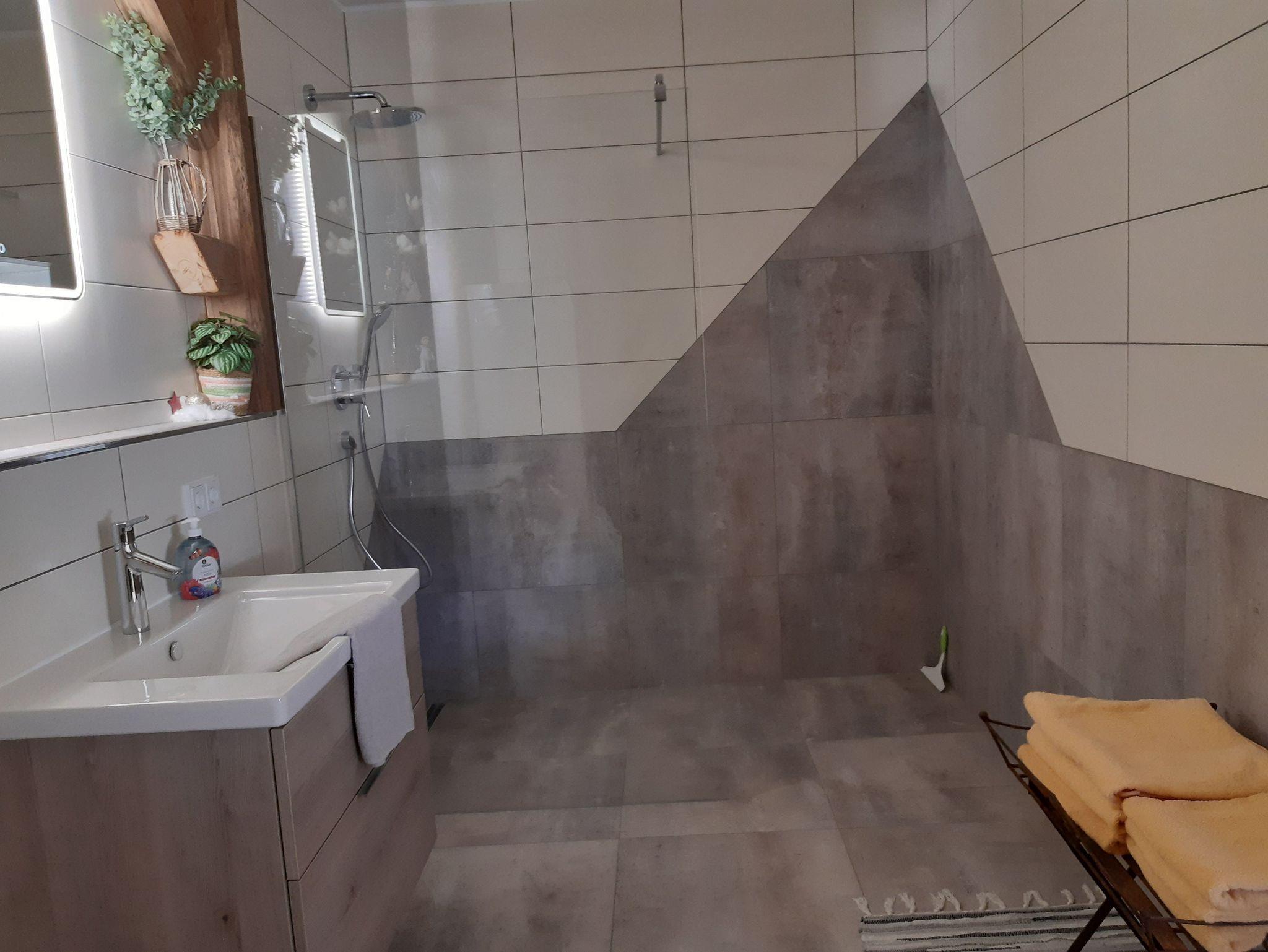 Das Bad ist mit einer geräumigen Dusche, Waschmaschine und Trockner ausgestattet.