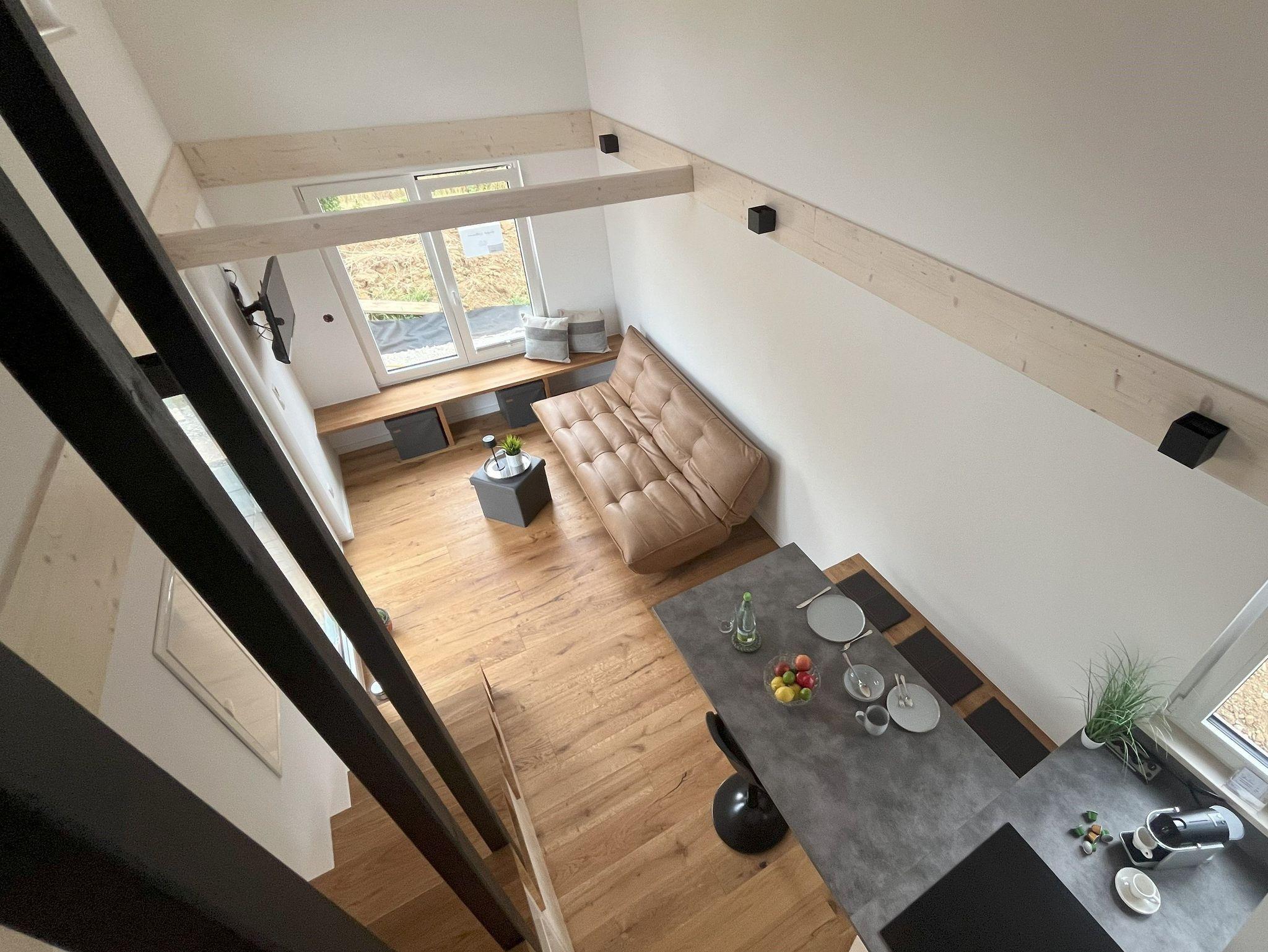 Die Einrichtung des Tinyhauses ist für Allergiker geeignet. Das Haus verfügt über W-LAN, alle Zimmer sind mit einem Eiche Parkett ausgelegt und werden über eine Fußbodenheizung beheizt (außer obere Schlafnische), die individuell regelbar ist.