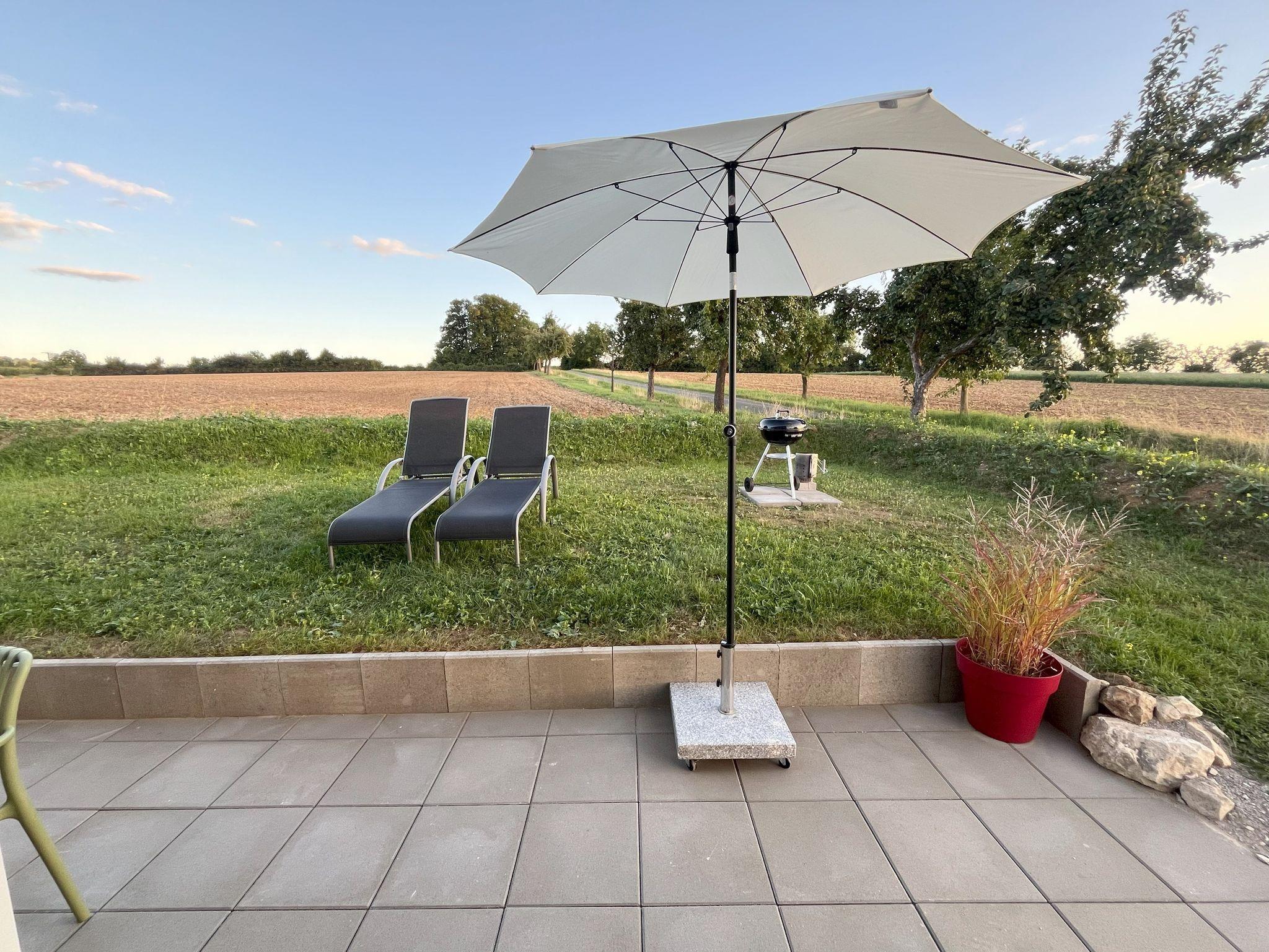 Hier kann man mitten in wunderschöner Natur, umgeben von Feldern, Wiesen und Obstbäumen mit wunderschöner Aussicht auf die lange Meile und nach Eggolsheim, an einem perfekten Ort zum Entspannen und Erholen, Ferien machen.