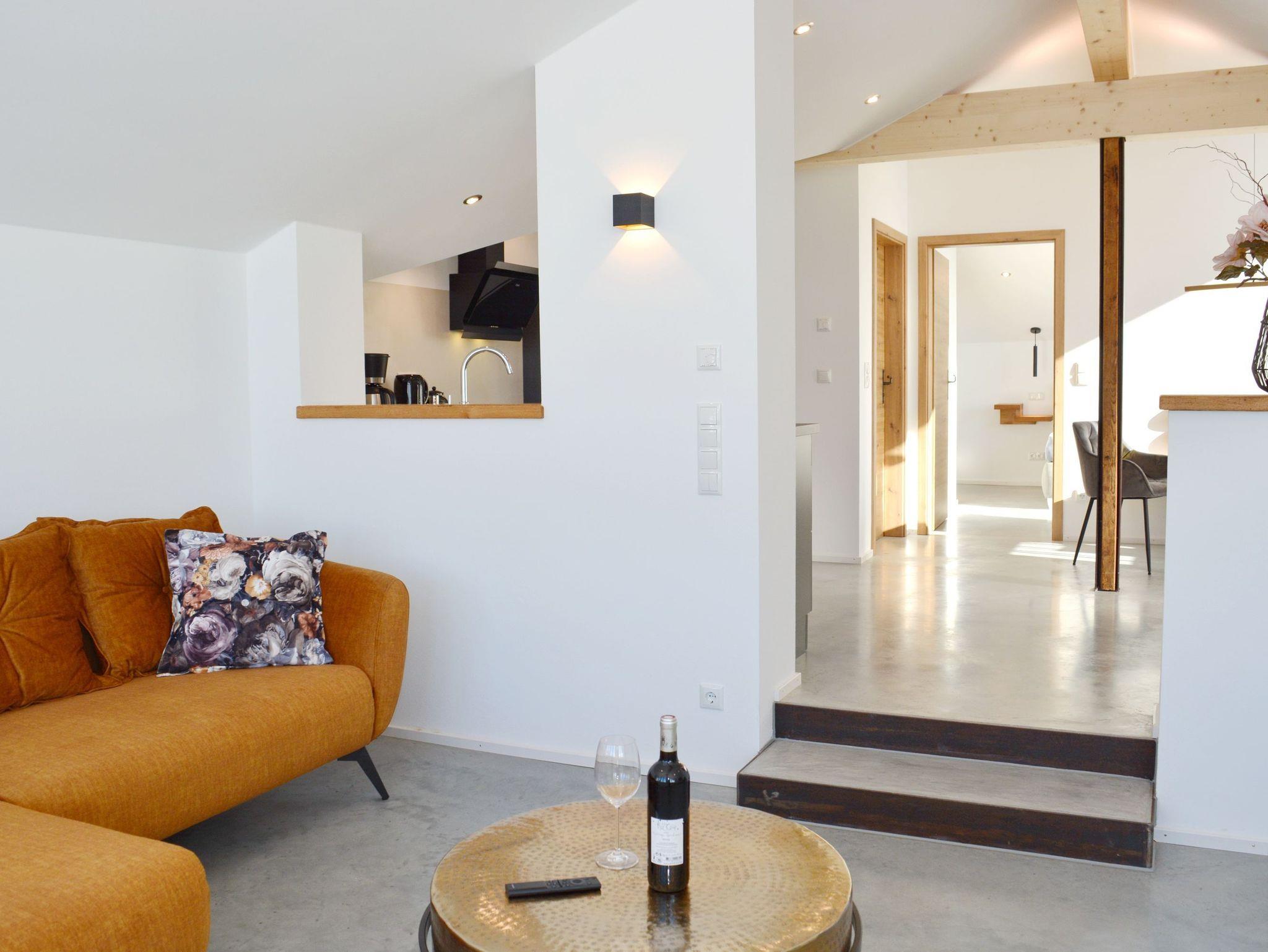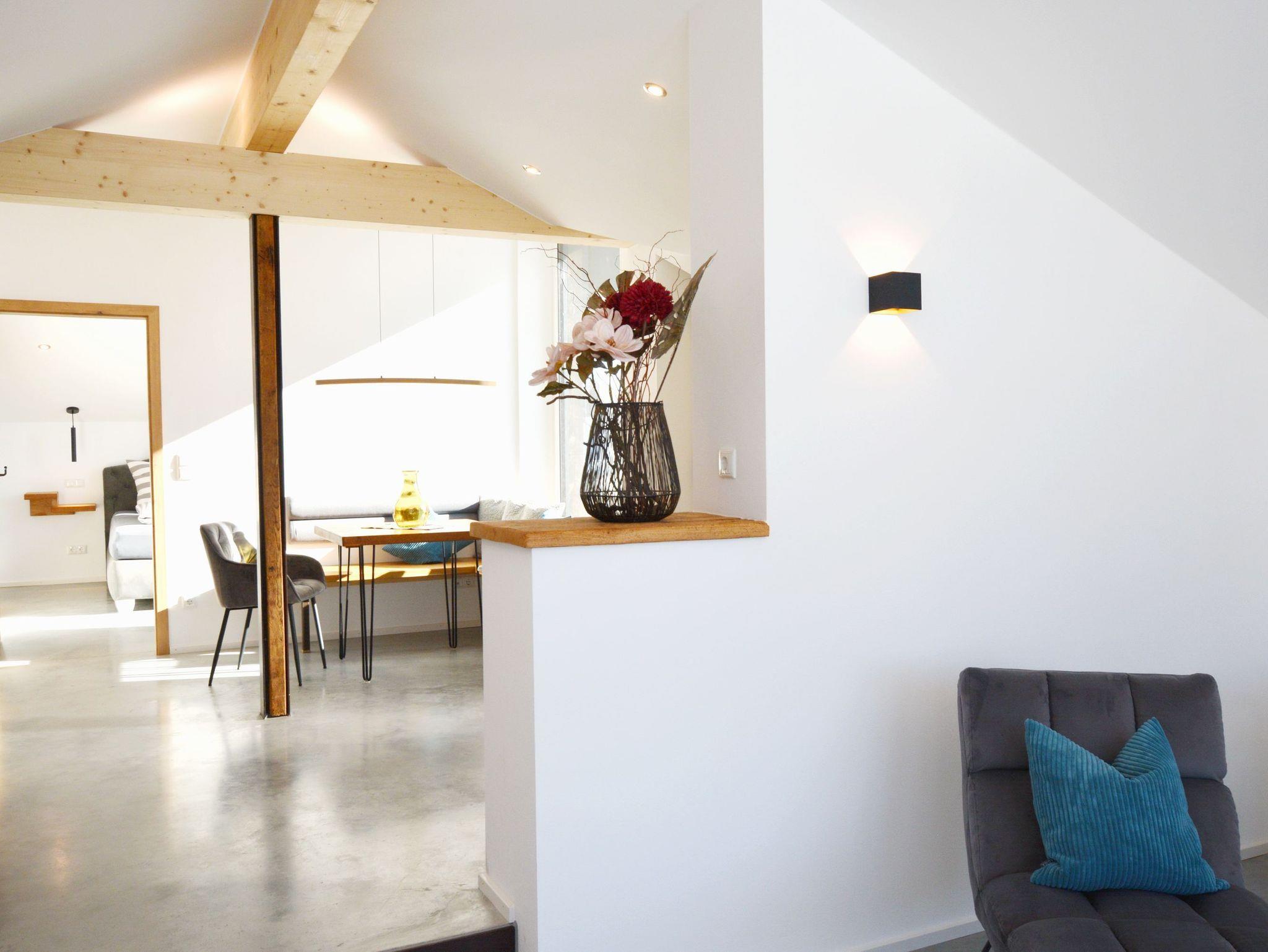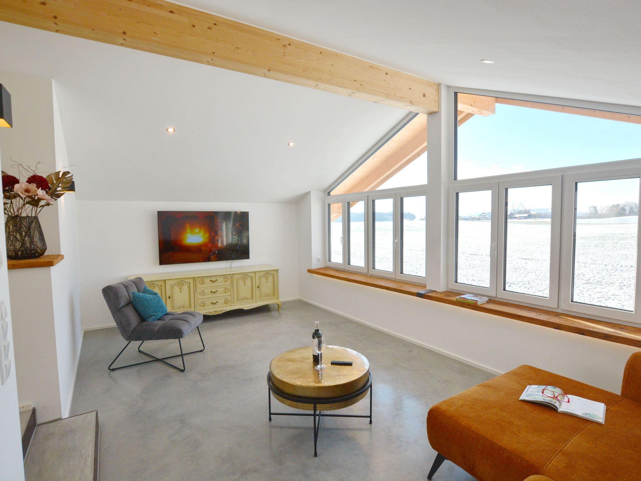 Meisterhof-LichtBlick, ein echtes Juwel im neu ausgebauten Dachgeschoss des Nebengebäudes im Meisterhof, heißt Sie herzlich willkommen. Das luxuriös und modern ausgestattete Loft bietet einen traumhaften Blick auf die Berge des Chiemgaus und des Inntals. Es ist der perfekte Ort zum Abschalten und Entspannen, somit optimal für die Urlaubszeit. Die hochwertige Ausstattung, die vom Eigentümer sorgfältig ausgewählt wurde, wird Sie begeistern. Das offene Wohnkonzept des Wohn- und Essbereiches mit offener Küche ist geschickt durch wenige Stufen und eingebaute Mauern getrennt worden, hier kann man sich nur wohlfühlen. Im Boxspringbett des angrenzenden Schlafzimmers finden Sie sicherlich einen angenehmen Schlaf. Modern ausgestattet präsentiert sich das Badezimmer mit bodengleicher Dusche, einem Waschbecken und einer Toilette. Entspannen auf der großen West-Terrasse - Lichtblick hat Vieles zu bieten.