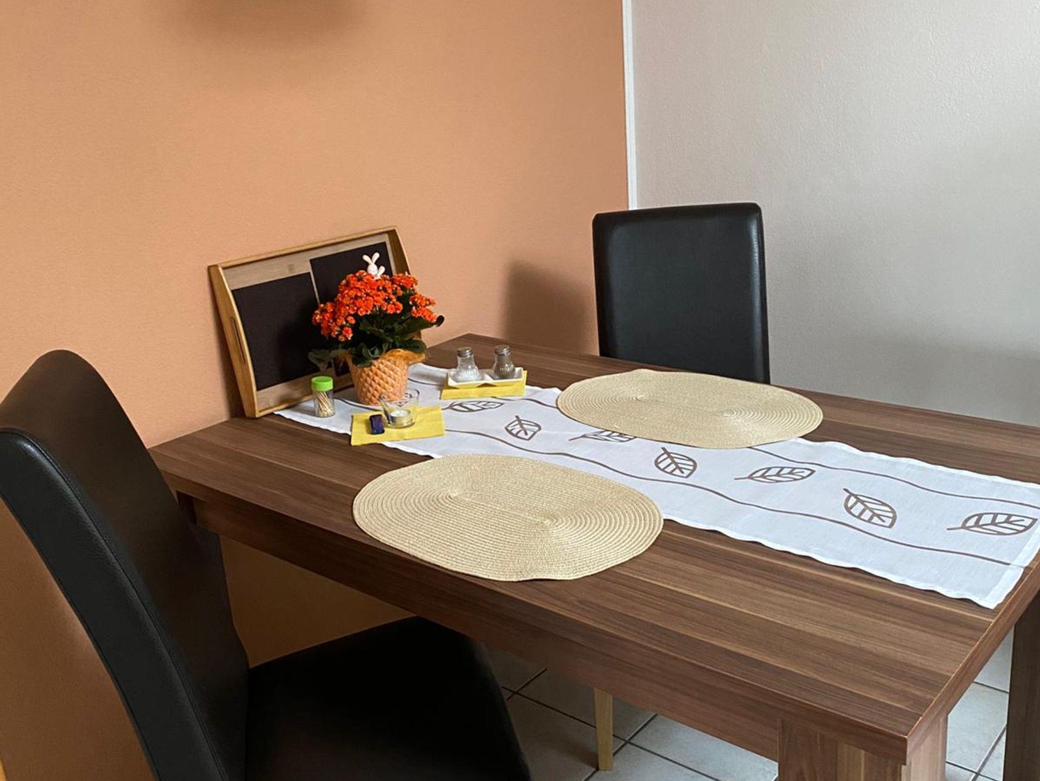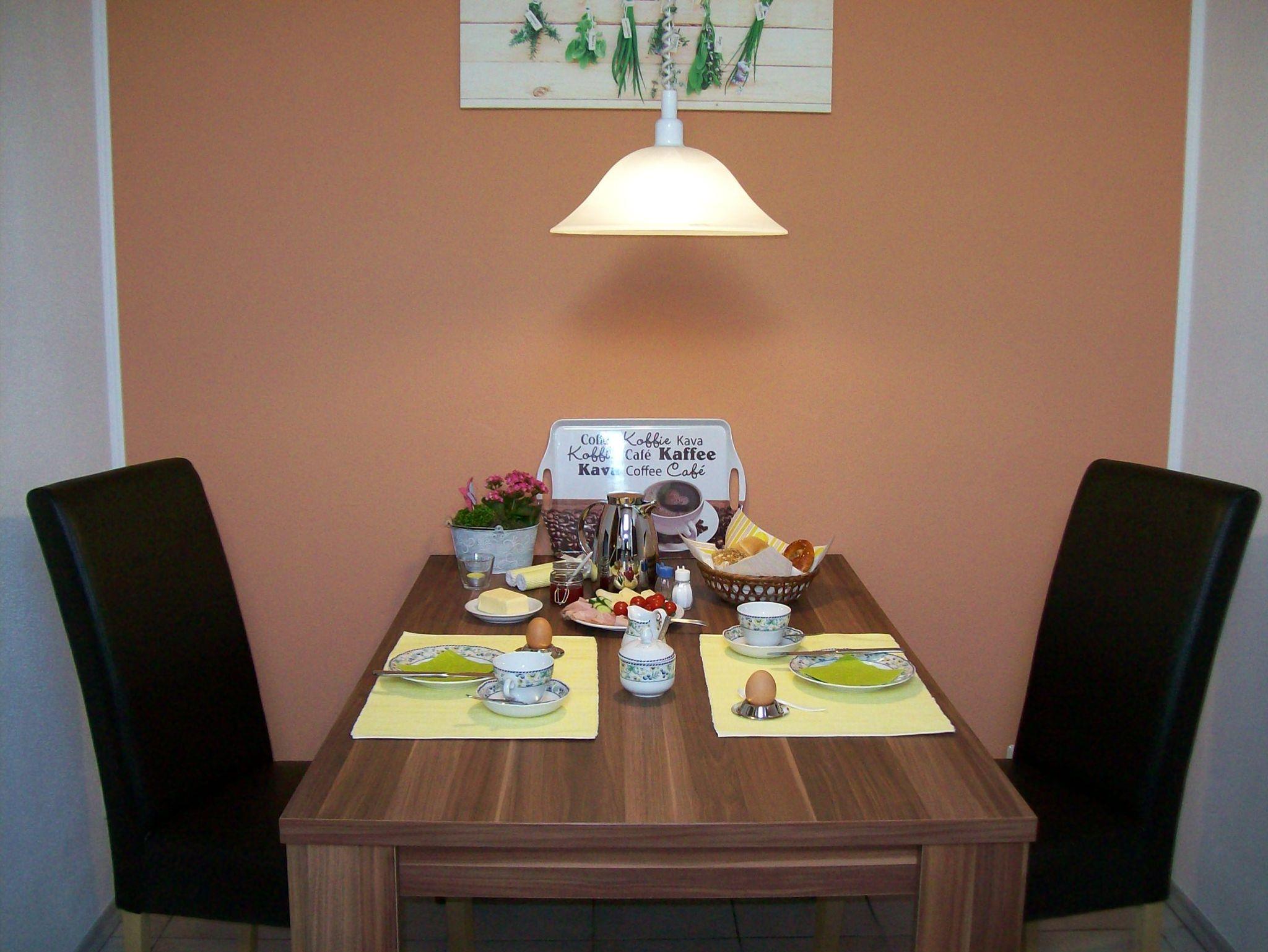 Auch die angrenzende Küche ist hell und freundlich eingerichtet und hat zwei Fenster. Ein großer Esstisch bietet bis zu 5 Personen bequem Platz zum Essen und Ratschen. Die Küche ist gut ausgestattet mit Kühlschrank (3***TK-Fach), Mikrowelle, Cerankochherd und Backofen, Wasserkocher, Kaffeevollautomat und Toaster, sowie großzügig Geschirr, Töpfe, Pfannen und Besteck.