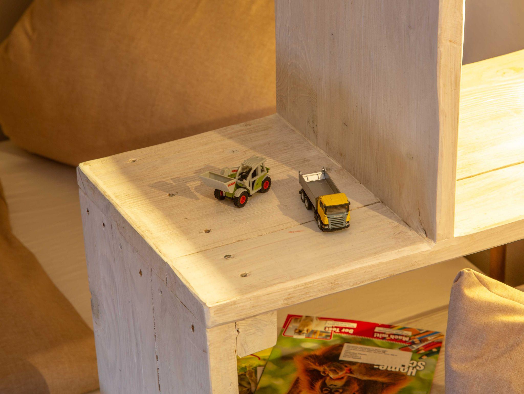 Wenn die Sonne mal nicht mitspielt, können unsere Gäste in unseren großen Aufenthaltsraum ausweichen. Hier warten Spiele und Puzzle, Kaufladen, Puppenecke und Brettspiele, Kicker und reichlich Platz darauf, die Zeit zu vertreiben.