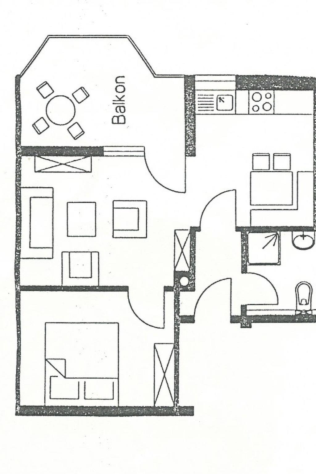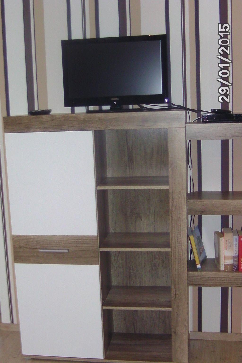 In the bedroom there is a double bed. The sofa in the living room can be converted for the third person. The bathroom has a shower, washbasin and 1 WC. The kitchen is fully equipped and has a dining table with 4 chairs. In the living room there is a living/sleeping sofa with a coffee table. In the wall unit you will find glasses and the satellite TV.