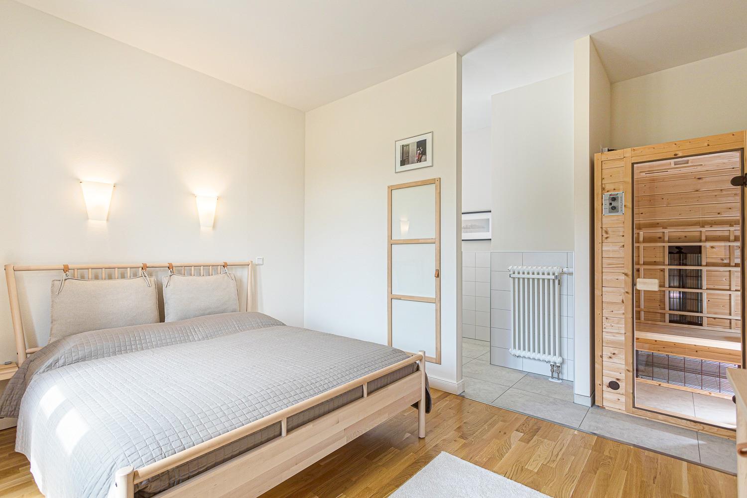Klares Design. Puristisch gut. Genießen Sie das "Forstmeister" - Apartment 2 im Erdgeschoss. Entdecken Sie authentische Details vom alten Förster im großen Wohnraum mit Küche. Das helle Schlafzimmer mit komfortablen Betten und offen angrenzendem Duschbad schließt daran an. Hier verwöhnt Sie eine schnuckelige Infrarot Sauna. Sie können gerne gegen extra Gebühr entspannen.