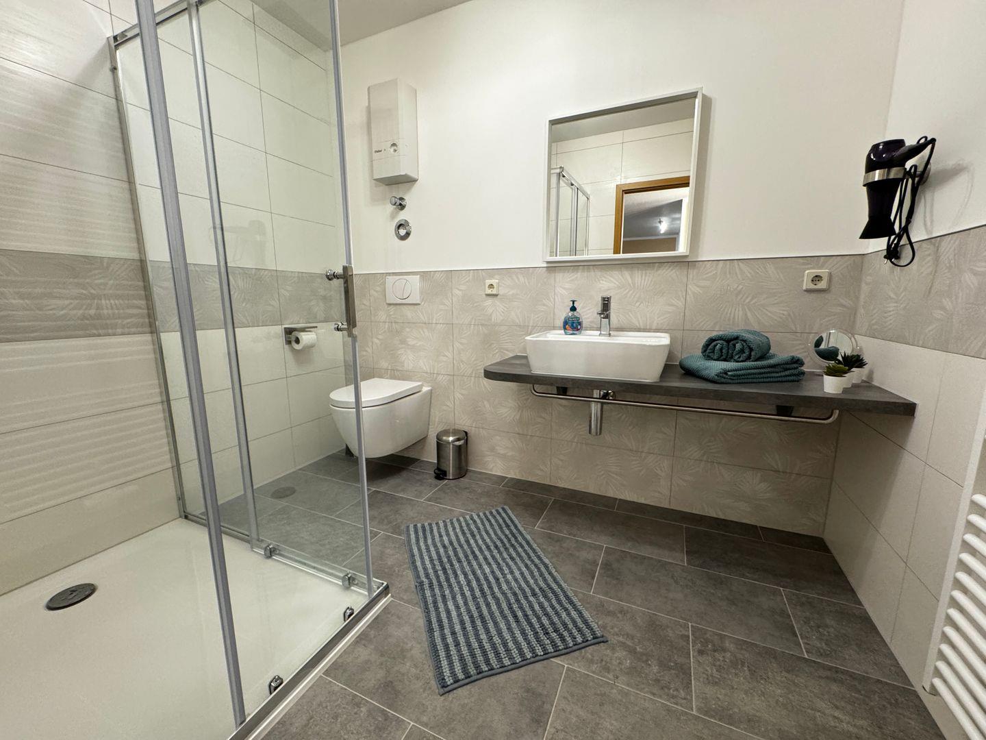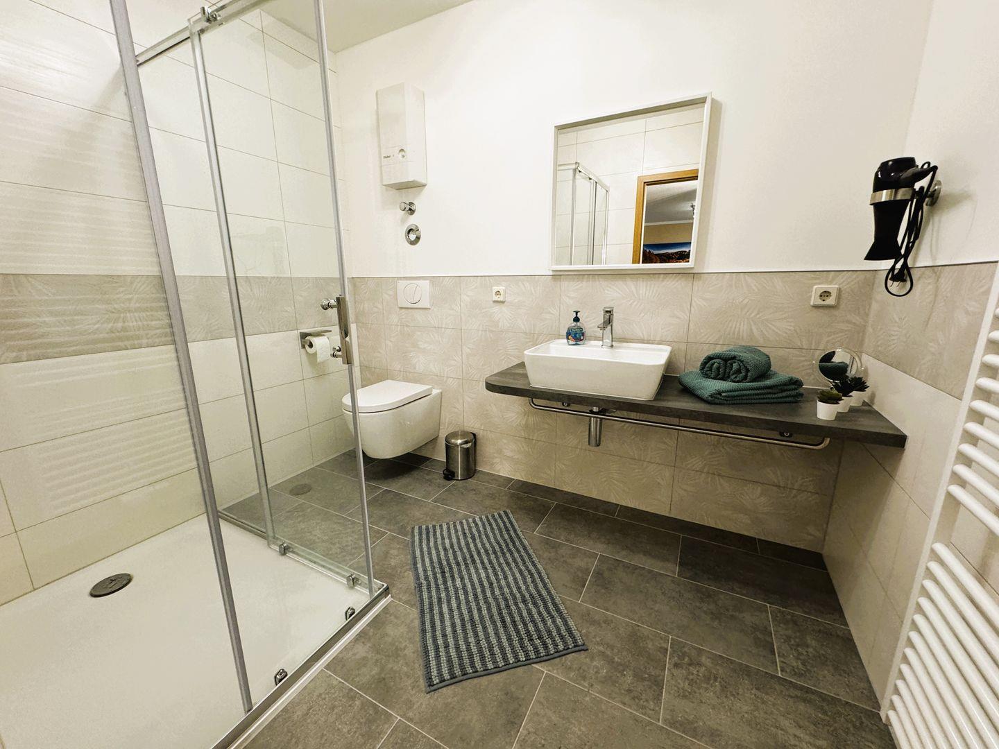 Das moderne Badezimmer besticht durch eine große, bodengleiche Regendusche.