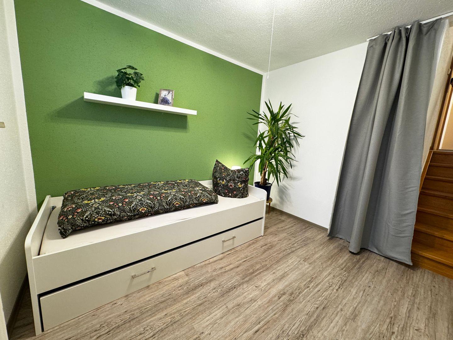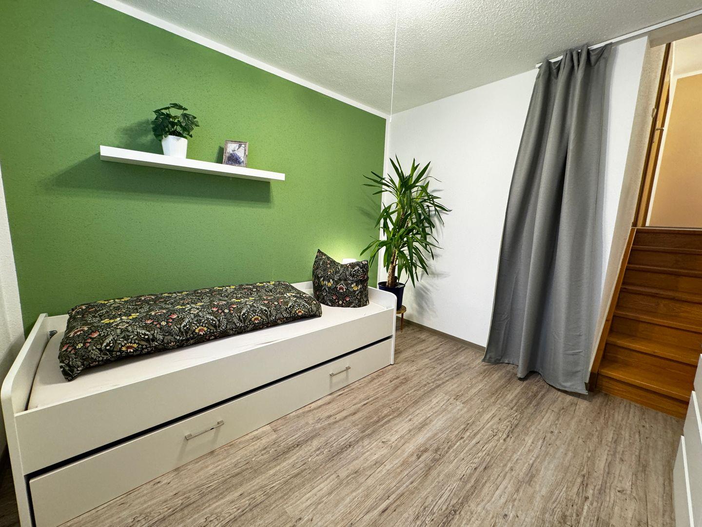 Ins zweite Schlafzimmer mit einem Einzelbett und einem Ausziehbett (ideal für Personen bis 14 Jahre) führt eine Treppe eine halbe Etage tiefer.