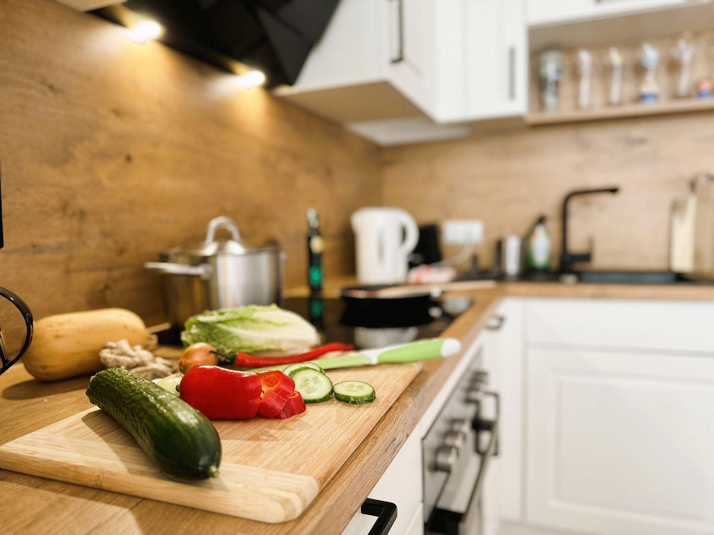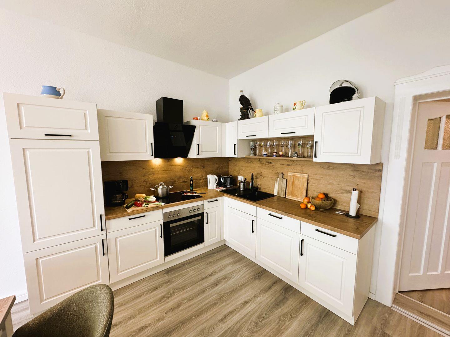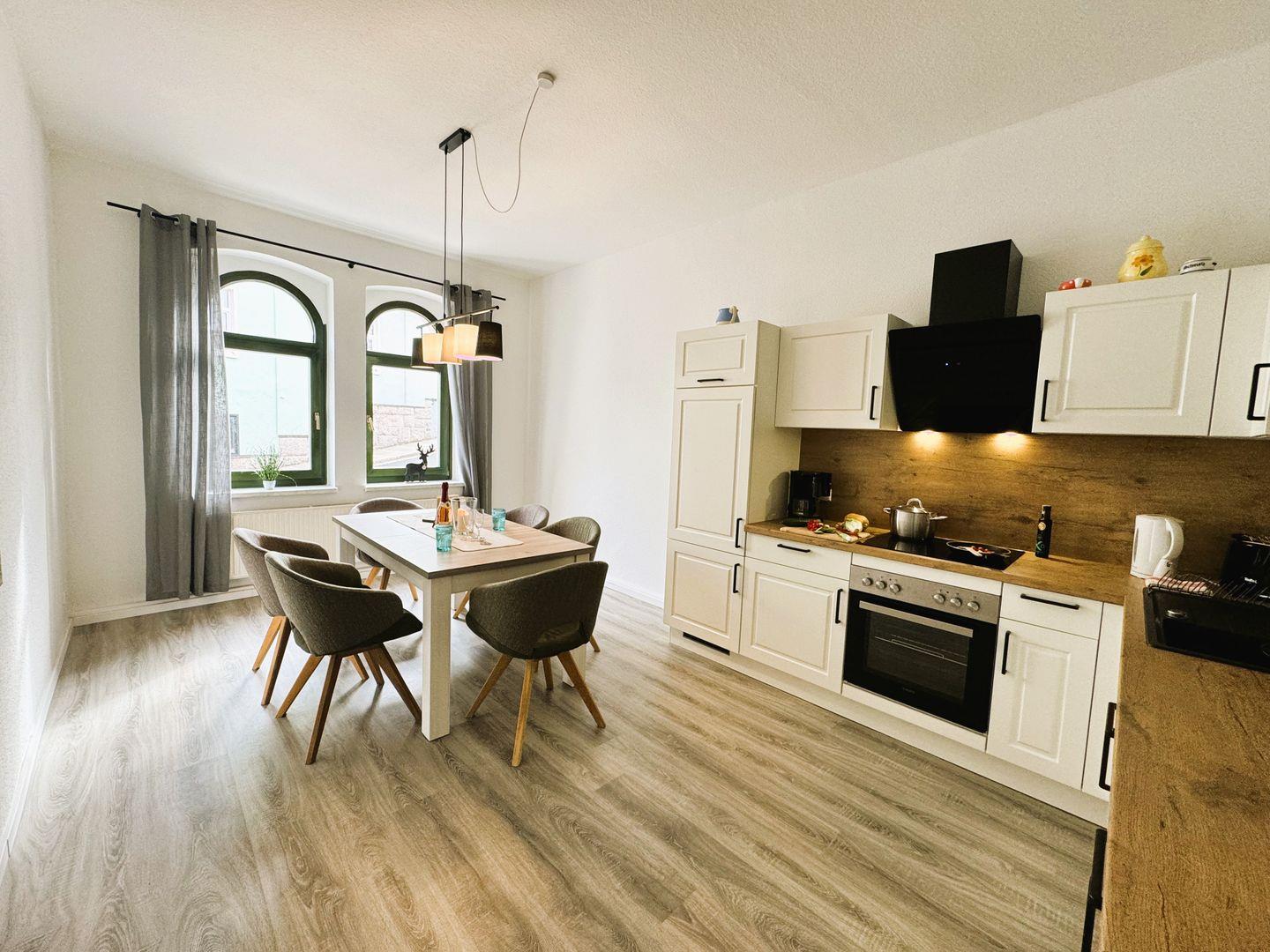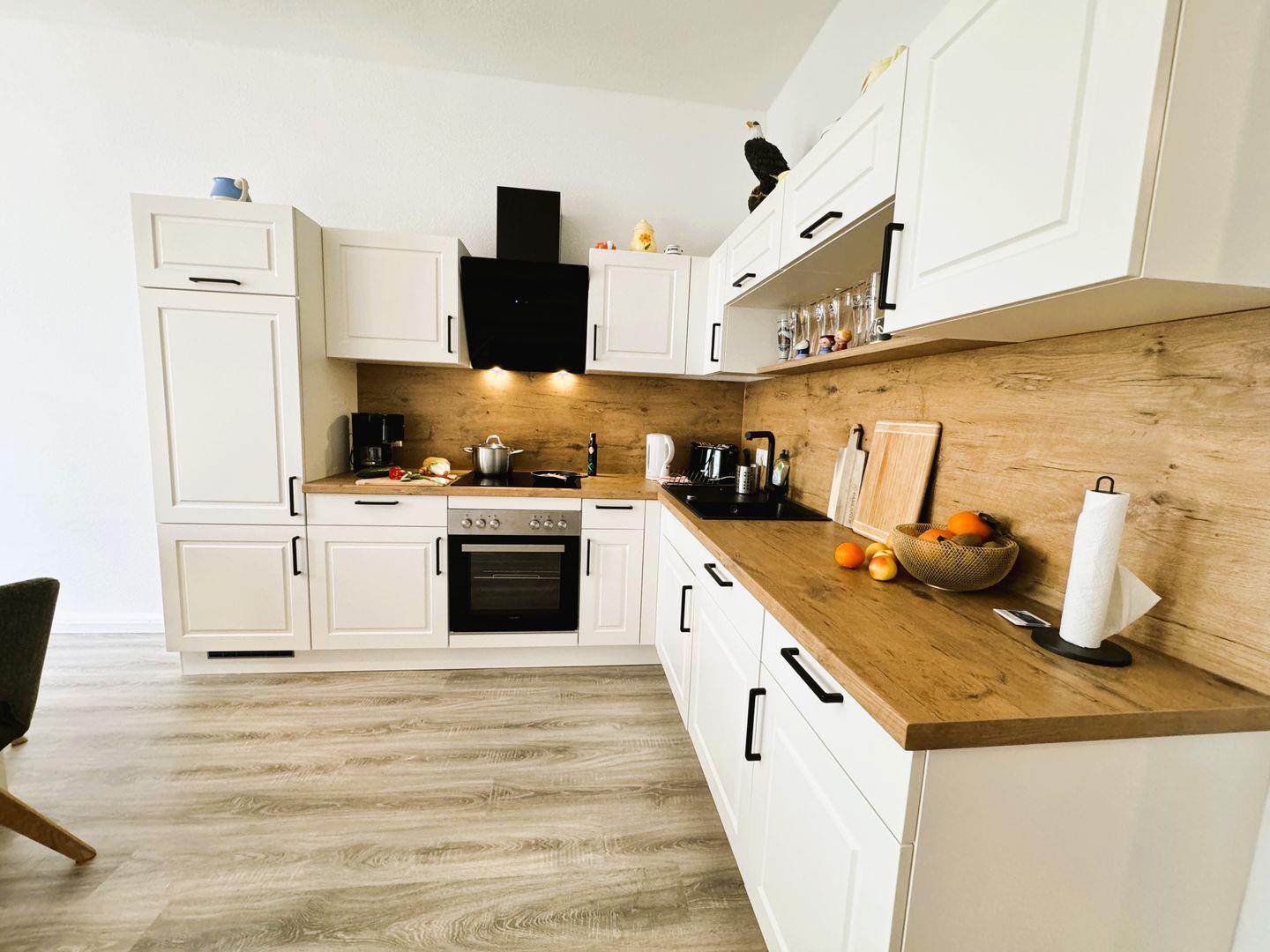 Gemeinsam Kochen, gemütlich Frühstücken oder ein Spieleabend - Die moderne, voll ausgestattete Küche mit großem, ausziehbaren Esstisch ist das Herzstück der Wohnung.