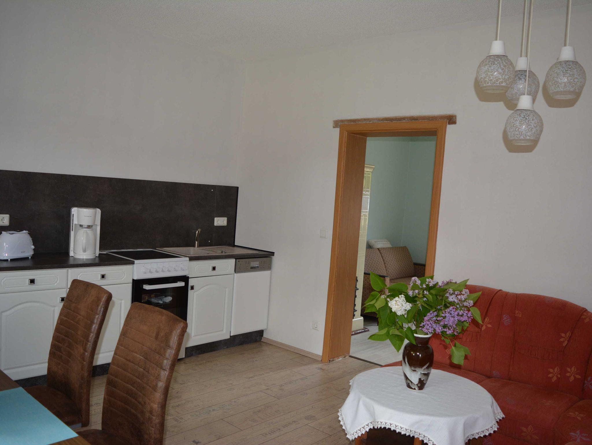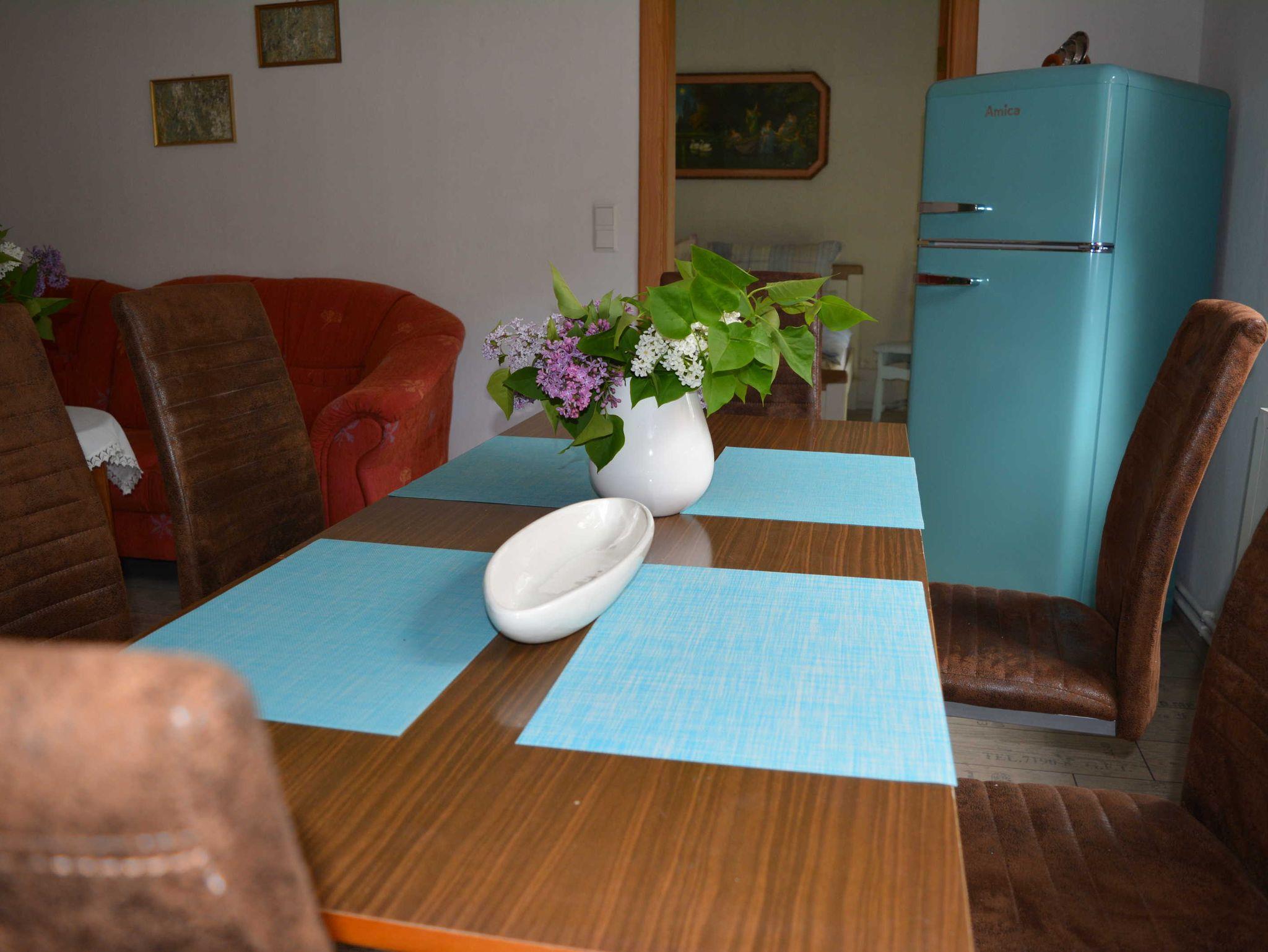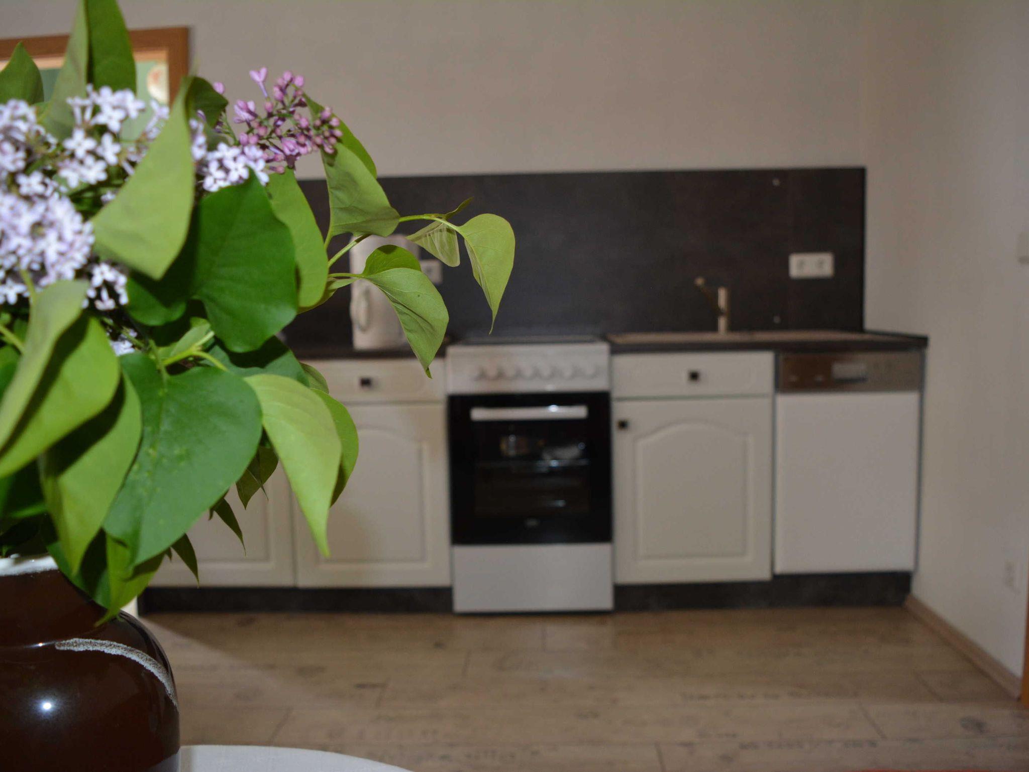 Ferienhaus in ruhiger Ortslage Wohnfläche 73 m² für 1-4 Personen; Büroarbeitsplatz und Kinderspielecke; Wohnküche (Ceranfeld, Backofen, Geschirrspüler, Mikrowelle, Kaffeemaschine, Kaffeevollautomat, Toaster, Kühl-Gefrierkombination, große Couch, Esstisch, WLAN, Satelliten-TV); ein Schlafzimmer mit Doppelbett, anliegend Büroarbeitsplatz; ein weiteres Schlafzimmer für 2 Personen mit 2 Einzelbetten, Kleiderschrank, Bügelbrett und Bügeleisen; Garderobe mit Ottomane; Badezimmer mit WC, Waschmaschine, Waschbecken, Duschkabine und Haartrockner; Baby-Essstuhl; Terrasse mit Sonnenschirm, gemütlichen Gartenmöbeln und Holzkohlegrill; 2 PKW Stellplätze; Zentralheizung