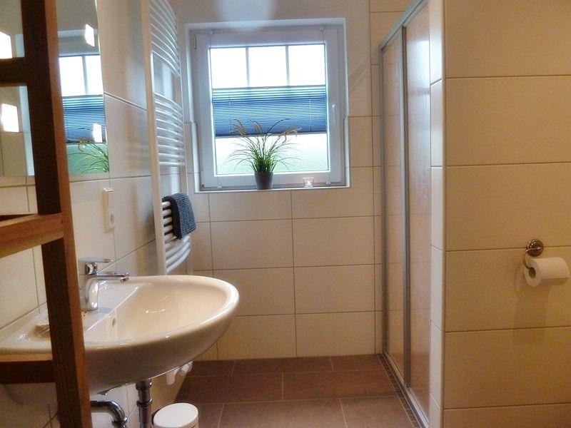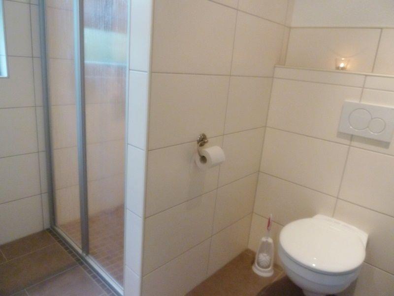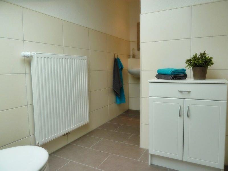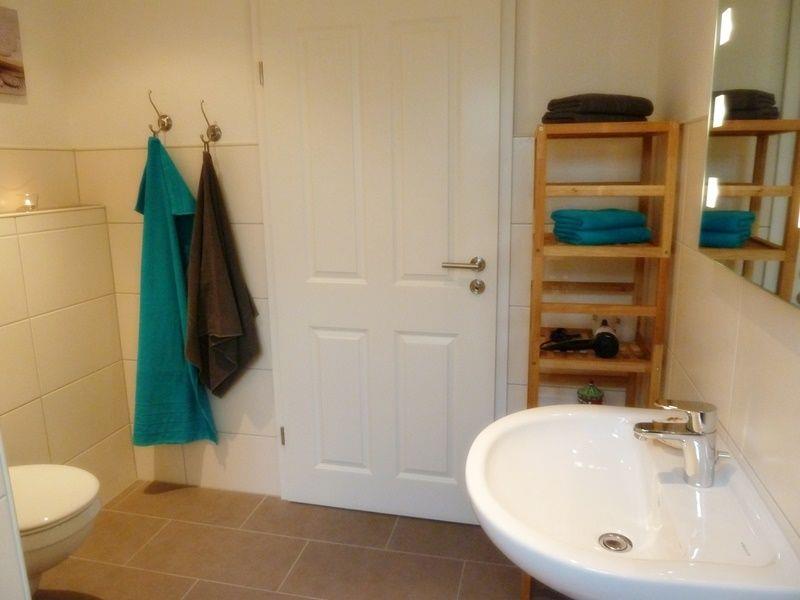 Das moderne Badezimmer im Erdgeschoss verfügt über eine ebenerdige Dusche und angenehme Fußbodenerwärmung, auch ein Föhn ist vorhanden.