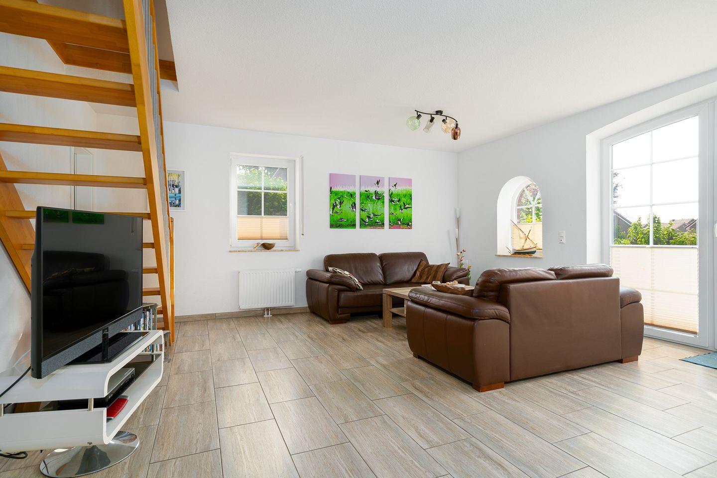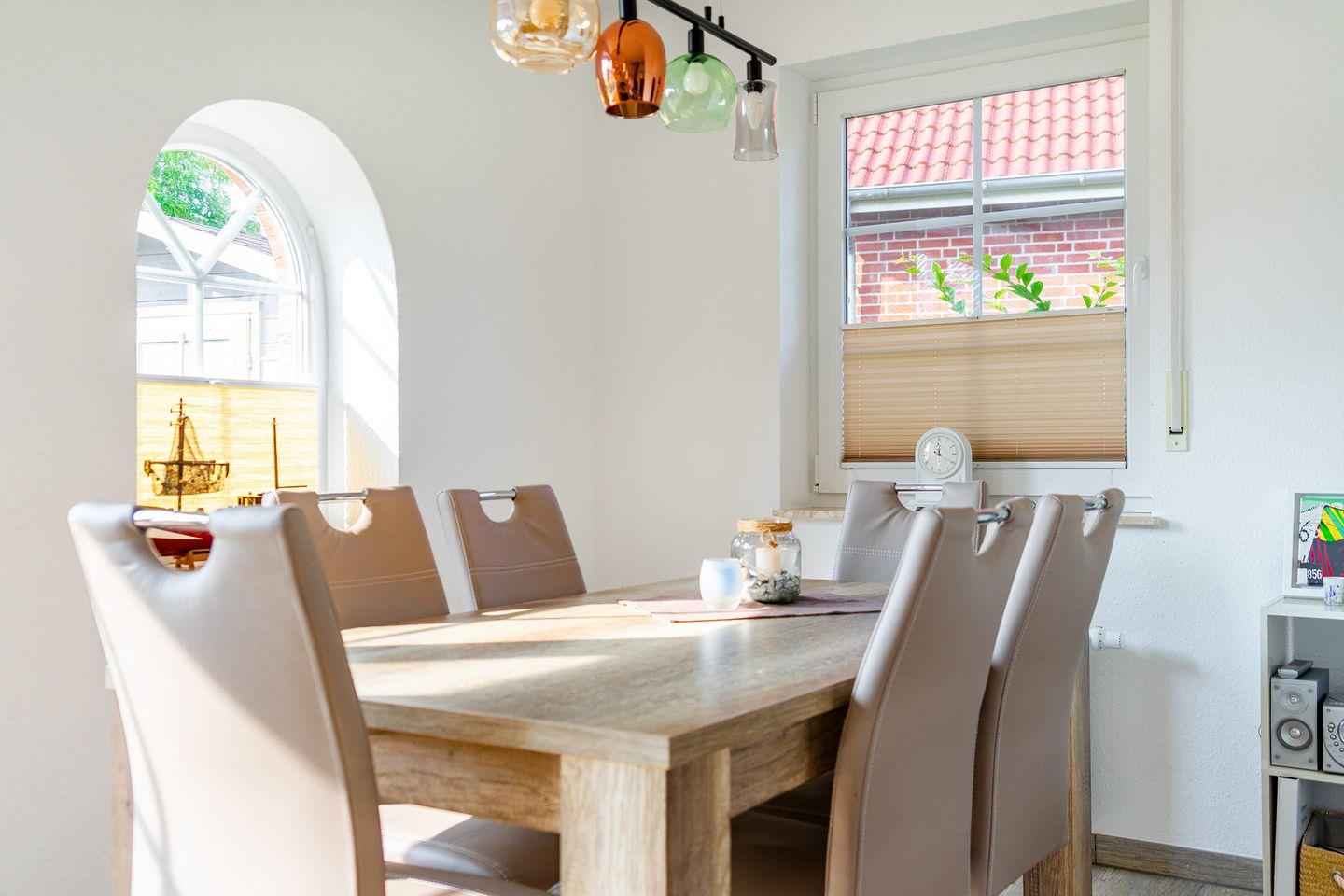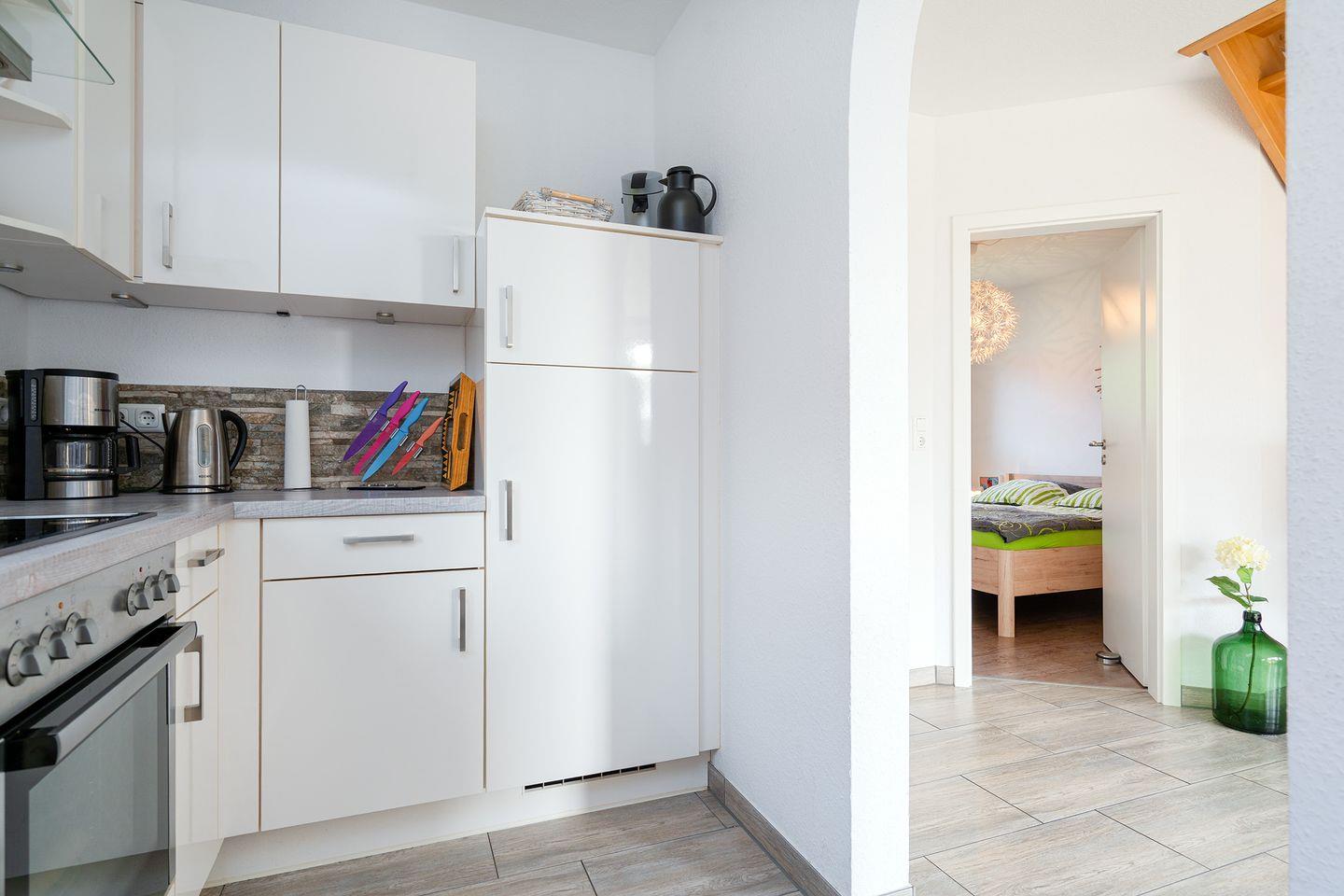 Das Haus ist sehr geschmackvoll und vollständig eingerichtet. Im Erdgeschoss befindet sich der großzügige Wohn-/Essraum (SAT-TV und DVD - einige Filme vorhanden) mit schöner vollausgestatteter Küche inkl. Ceran-Herd, Backofen, Geschirrspüler, Kühlschrank mit Gefrierfach, Kaffeemaschine, Wasserkocher, Eierkocher, Mixer, Kaffeepadmaschine, Radio. Eine Mikrowelle ist nicht vorhanden.