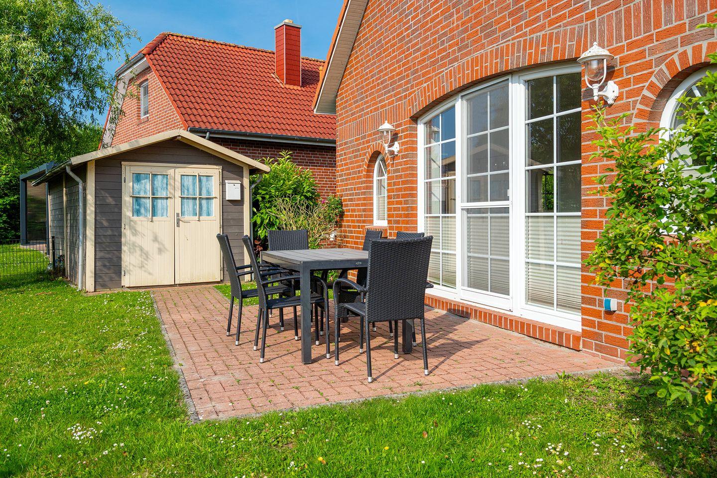 Ein Abstellhaus mit Stromanschluss ist ebenso vorhanden wie Gartenmöbel , Stühle und Tisch, Sonnenschirm und ein Grill.