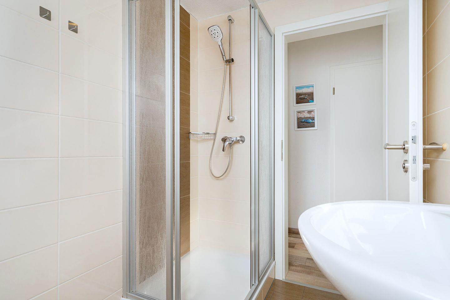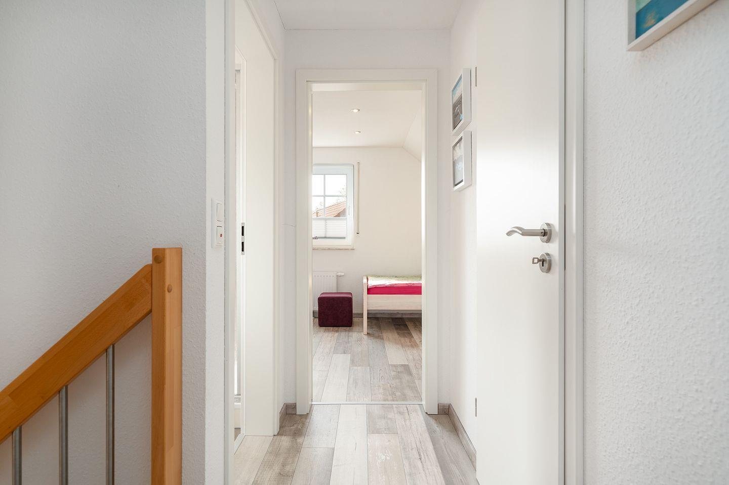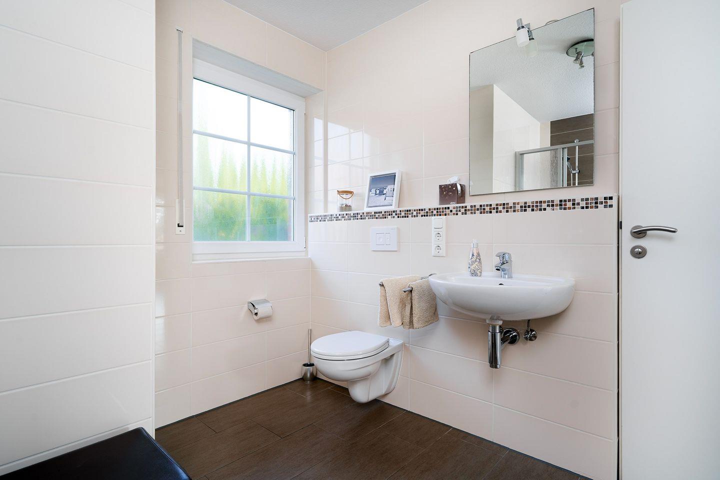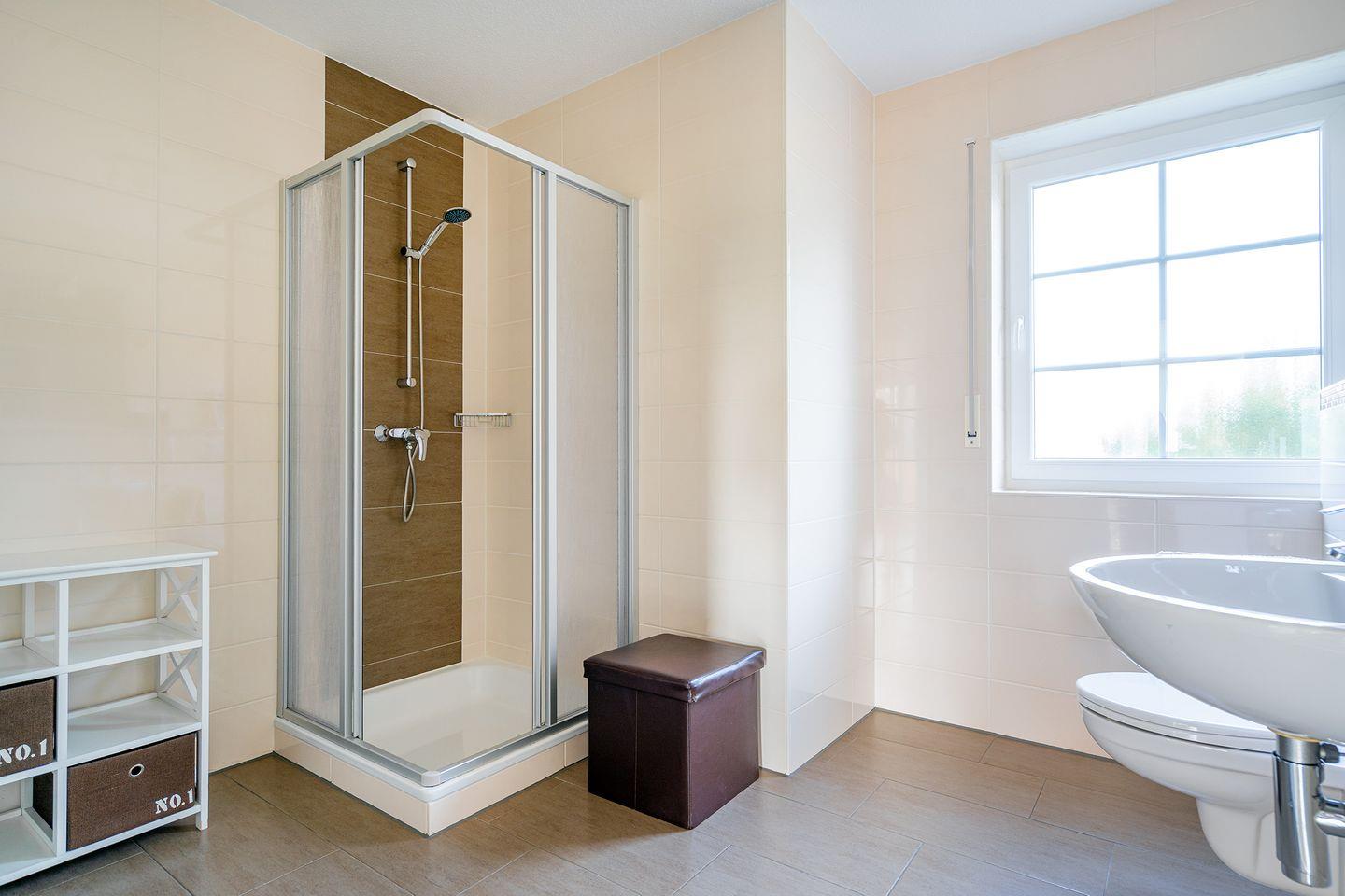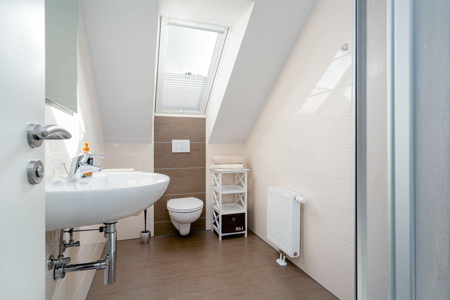 An den Fenstern in den Schlafzimmern sowie im unteren Bad befinden sich Rollläden und Plissees. Die beiden Dusch-Bäder im EG und OG sind hochwertig ausgestattet. Im EG-Bad sorgt eine Fußbodenerwärmung für warme Füße.