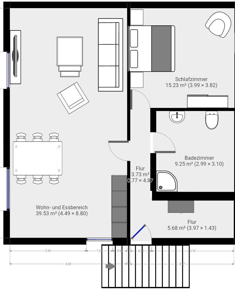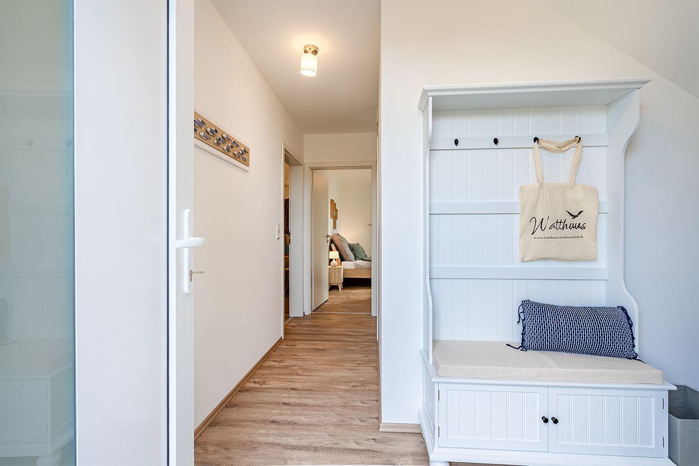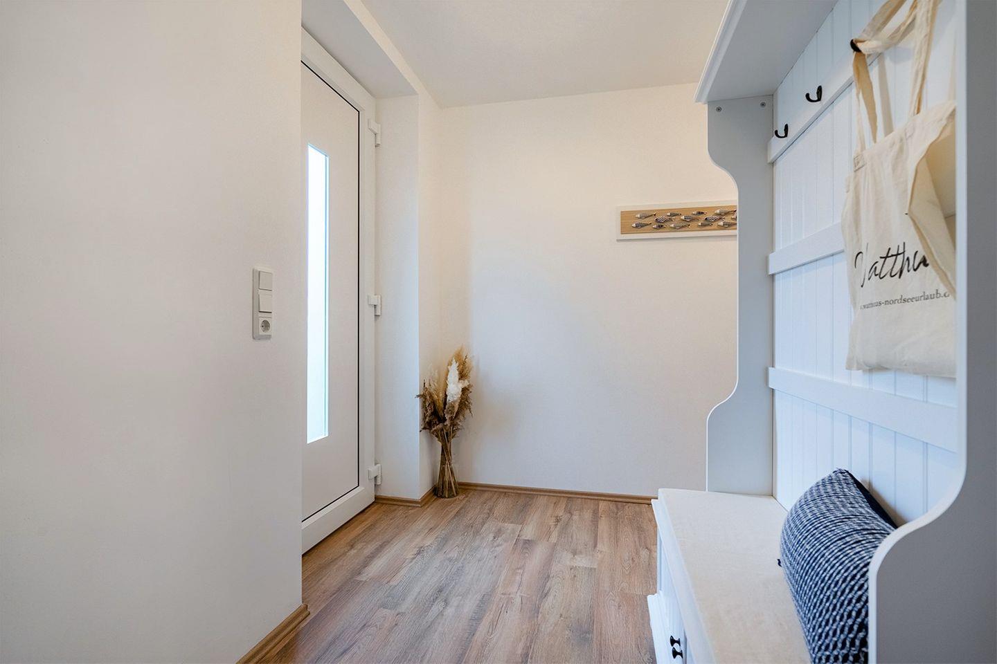 Die ruhige Lage nicht weit vom Greetsieler Sieltief, macht dieses Domizil als Urlaubsaufenthalt besonders reizvoll. Über einen separaten Hauseingang (Stahltreppe an der Hausseite) gelangen Sie in den Flur der 70 qm großen, hellen Ferienwohnung.