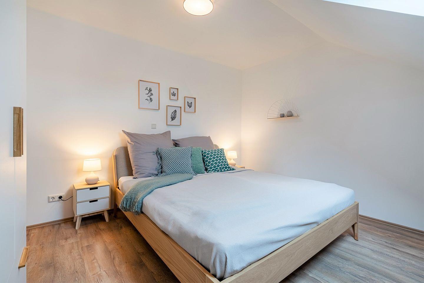 Alle Dachfenster im Haus lassen sich abdunkeln. In allen Wohnräumen ist ein hochwertiges Eichenlaminat verlegt.