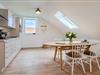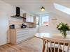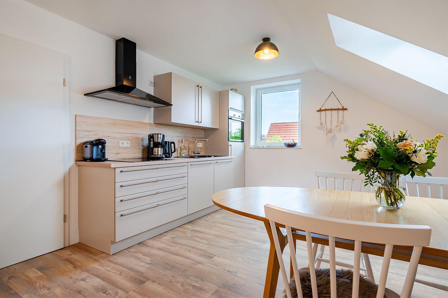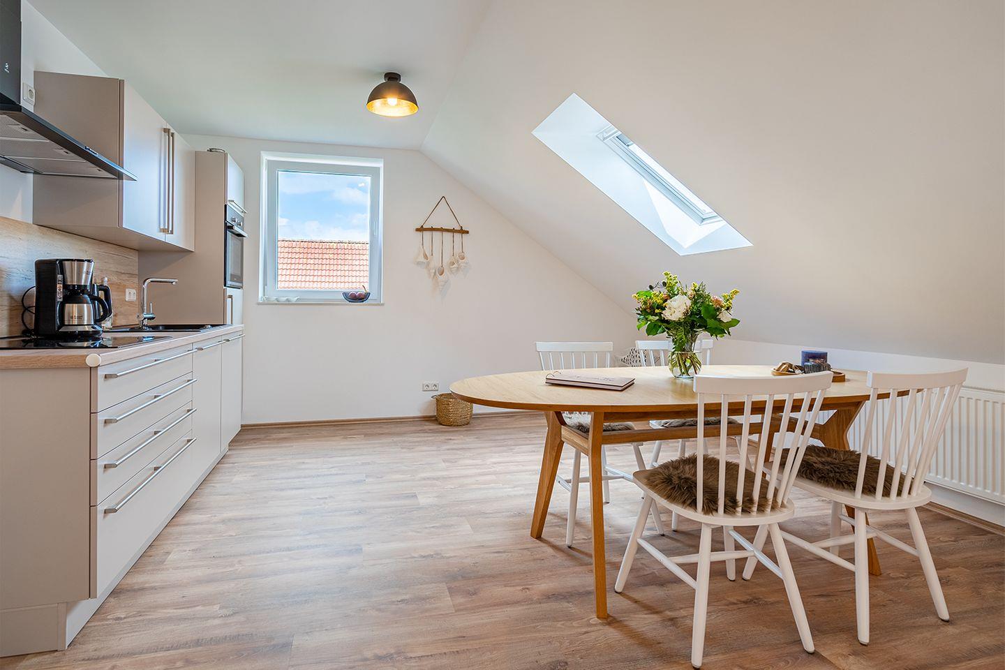 Vom Flur aus gelangen Sie in alle Räume der Wohnung. Im Eingangsbereich finden Sie genug Platz für Jacken und Schuhe. Vorne links treten Sie in den großen Ess- und Wohnbereich ein. Eine helle Schlafcouch (3-Sitzer) lädt zum Verweilen ein und kann bei Bedarf mit wenigen Handgriffen weiter ausgezogen werden (Liegefläche 188 x 140). Die Schlafcouch wird für Kinder und Jugendliche als zusätzliche Schlafgelegenheit empfohlen. Die sehr gut ausgestattete helle Einbauküche mit Kühl-/Gefrierkombination, Backofen, Geschirrspüler, Kochfeld, Kaffeemaschine (Filter & Tassimo), Toaster, Wasserkocher und vielen weiteren Extras macht das Kochen im Urlaub zu einem Erlebnis. Ein schöner heller Esstisch mit Platz für vier Personen verbindet den Koch- und Wohnbereich.