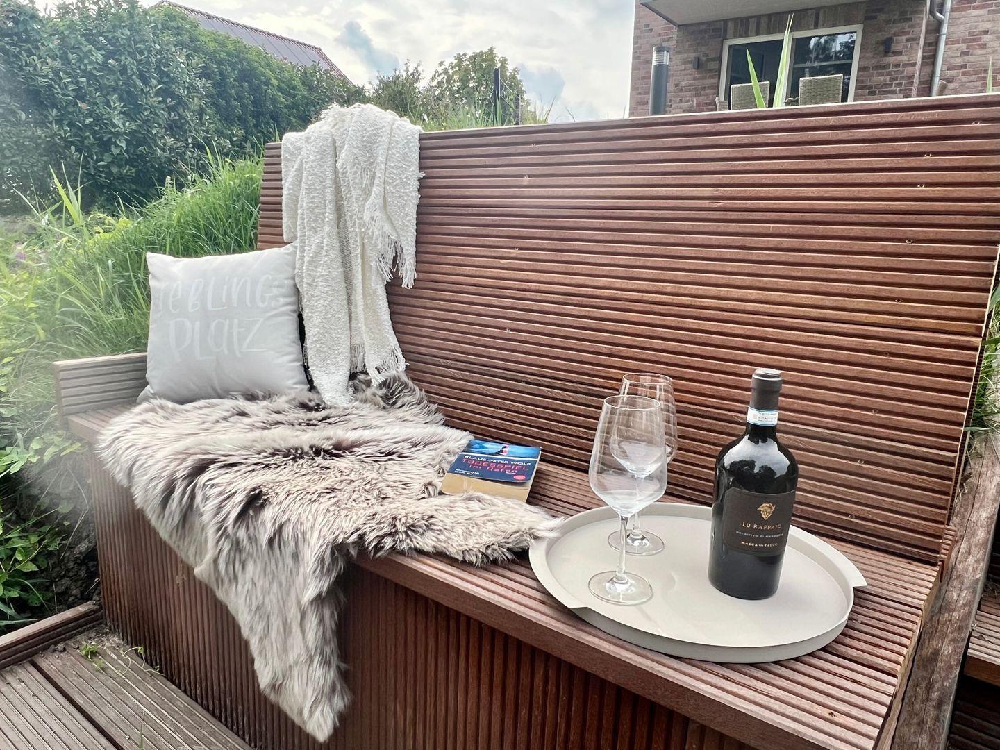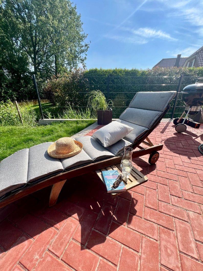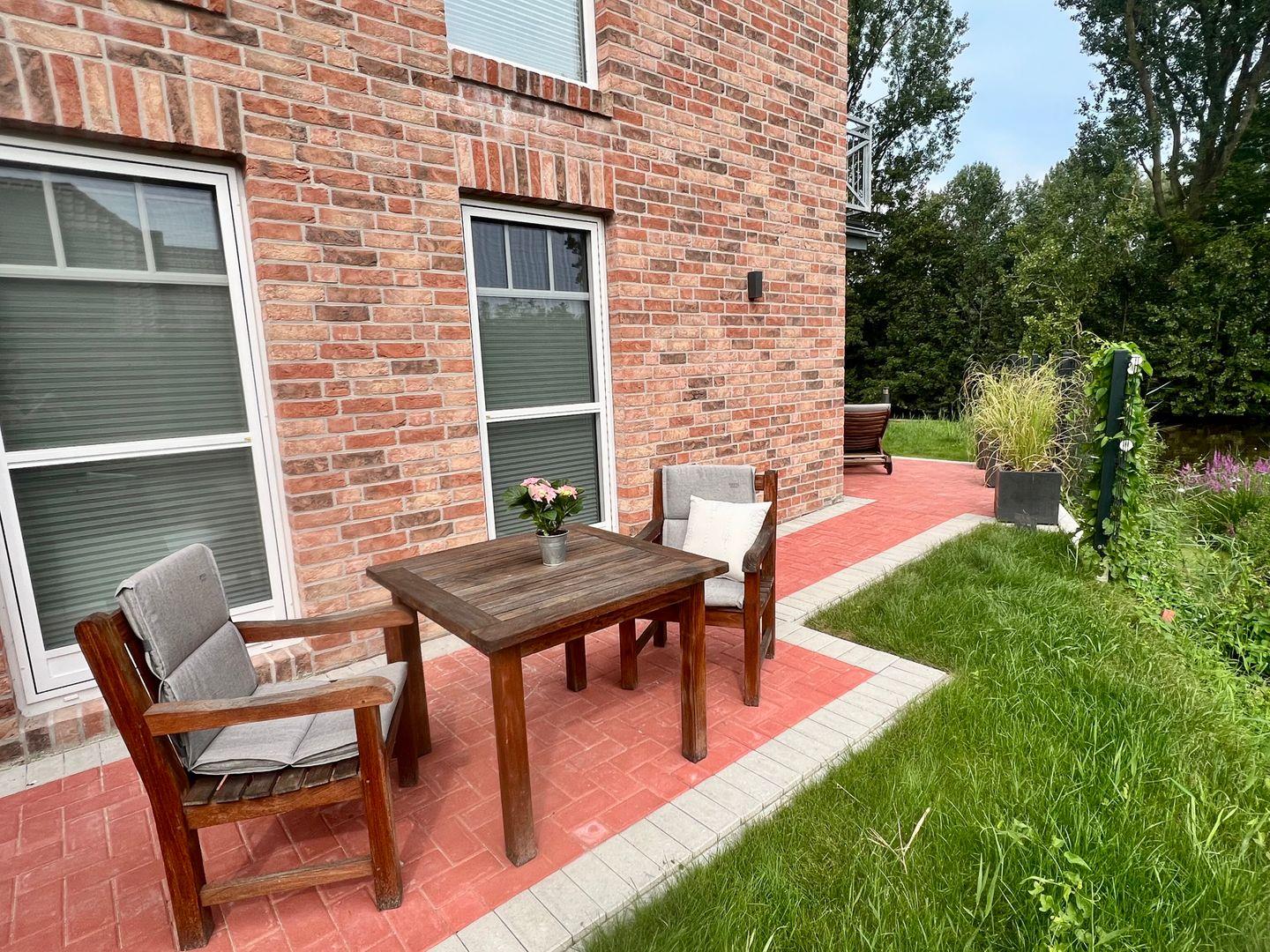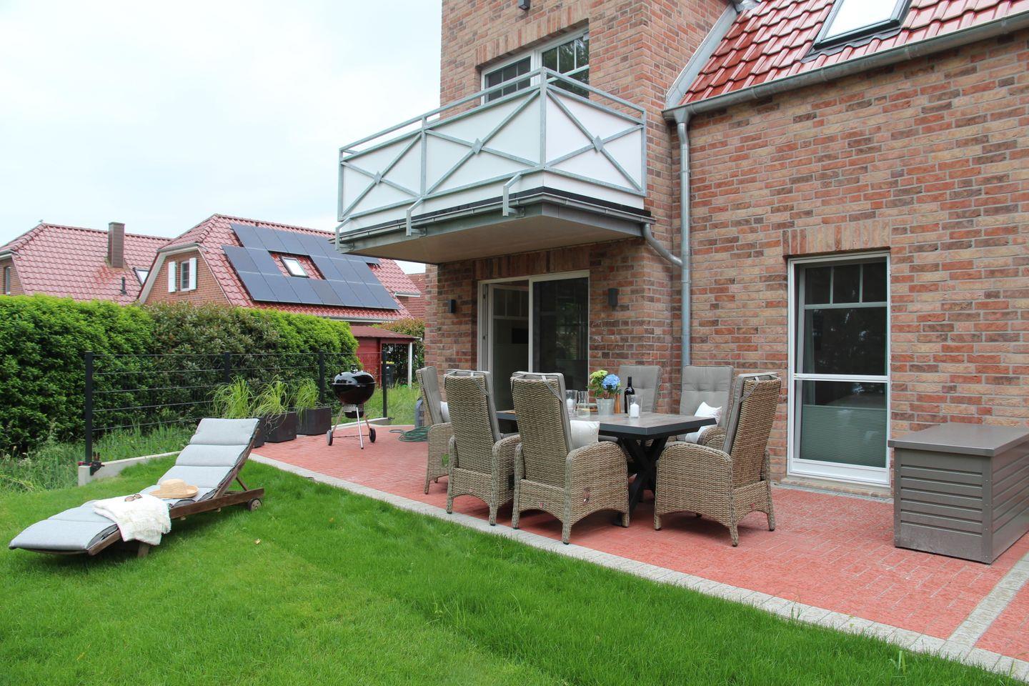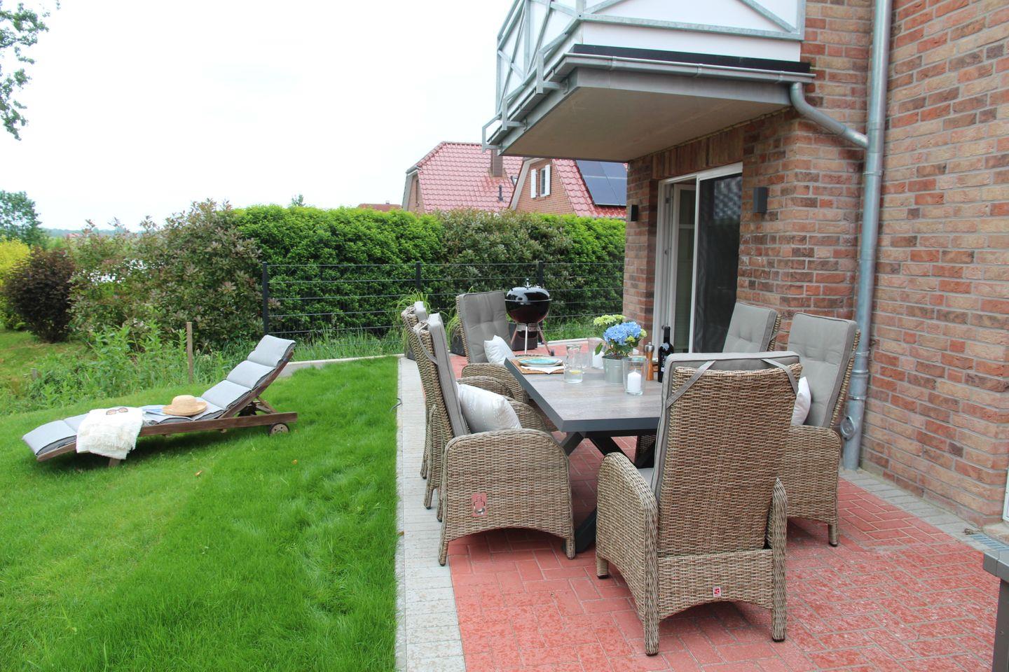 Die Terrasse wurde großzügig und um die gesamte Wohnung umlaufend angelegt. Auf der Hauptterrasse können Sie den direkten Ausblick auf das Siel genießen. Nehmen Sie hier an dem hochwertigen großen und ausziehbaren Esstisch mit bequemen Gartensesseln Platz. Ein Weber-Kugelgrill steht mit Zubehör für einen gemütlichen Grillabend ebenfalls zur Verfügung. Nehmen Sie in den hochwertigen Teakholzsesseln auf der kleinen Terrasse mit Ost-Ausrichtung Platz. Genießen Sie hier die Morgensonne bei einer Tasse Tee oder Kaffee. Ein Sonnenbad können Sie auf der Teakliege nehmen. Vor einem Sonnenbrand schützt Sie ein großer Sonnenschirm.