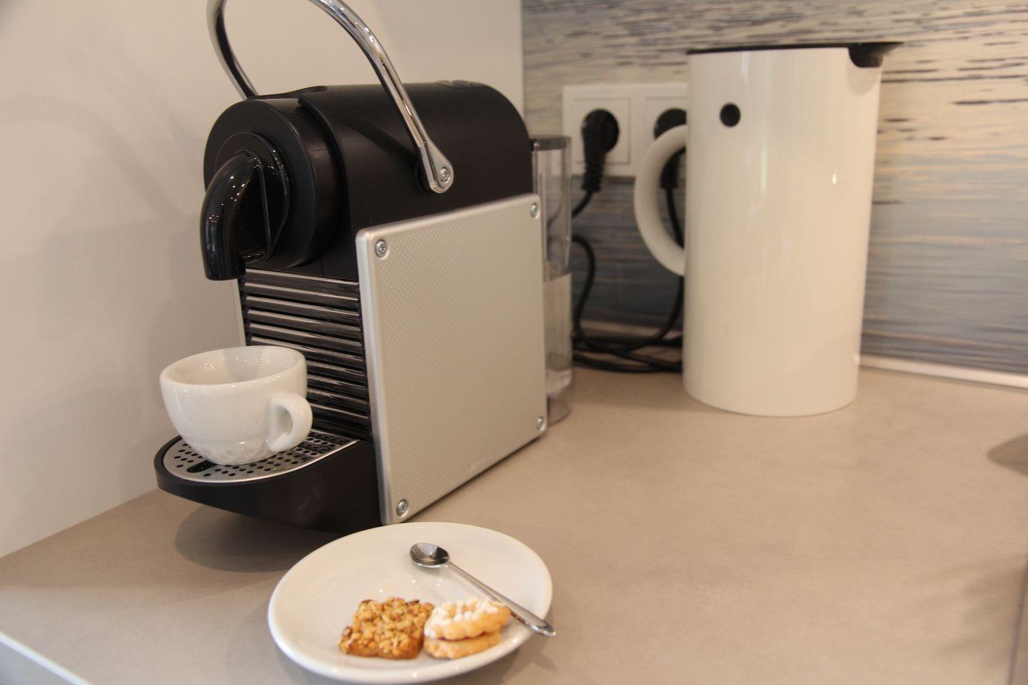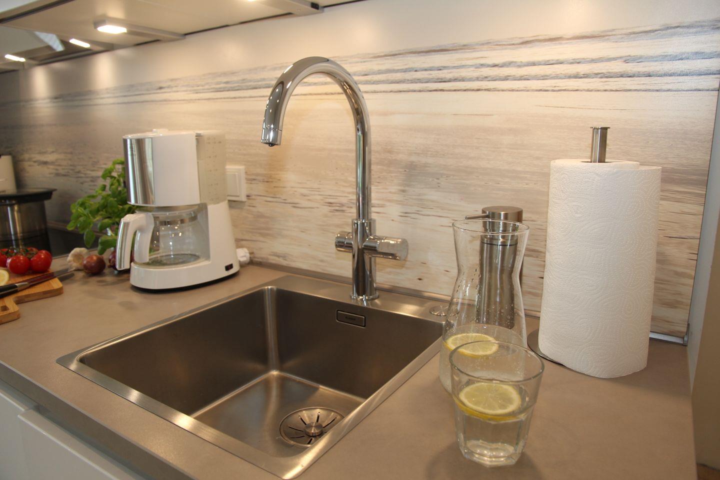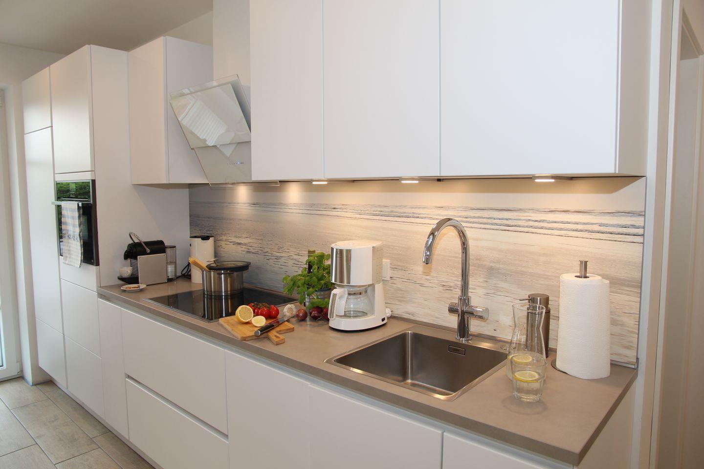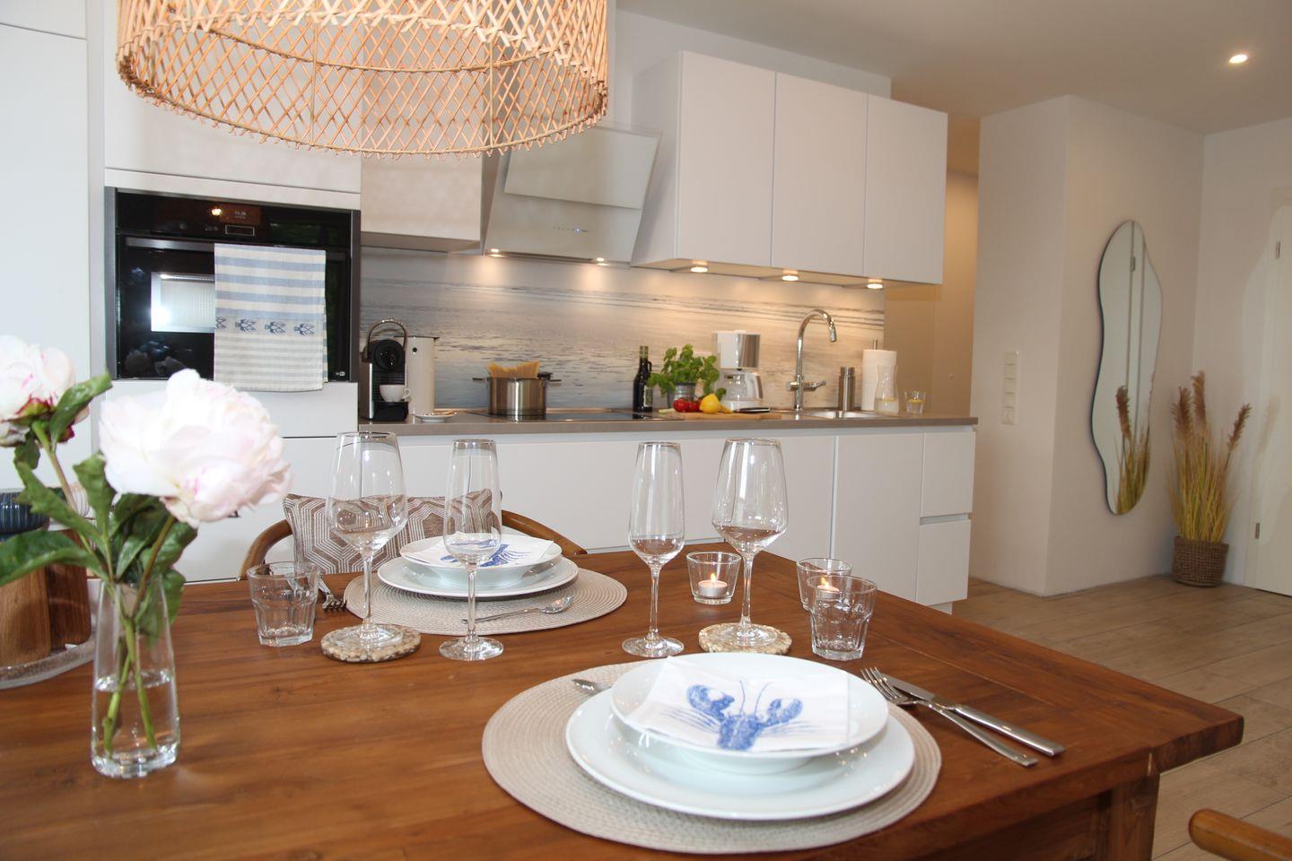 Den Mittelpunkt der Wohnung bildet der offen und hell gestaltete Wohn- und Essbereich mit den bodentiefen Fenstern. Die voll ausgestattete Küchenzeile verfügt über Spülmaschine, Induktionskochfeld mit Dunstabzugshaube, Kühlschrank mit Gefrierfach sowie eine Backofen-Mikrowellen-Kombination. Darüber hinaus stehen viele weitere Küchengerätschaften zur Verfügung wie Wasserkocher, Toaster, Melitta-Filterkaffeemaschine, Senseo-Kaffepad-Maschine, Nespresso-Kapselmaschine, Kaffee-Handfilter, Thermoskanne, Waffeleisen, Sandwichmaker, Raclette, Multitool von Braun zum Mixen, Pürieren, Stampfen, Rühren, Zerkleinern, Eis-Crushen sowie ein Fondue-Gerät neben verschiedenen Back- und Auflaufformen und Mikrowellengeschirr. Wir möchten Ihnen Ihren Aufenthalt so komfortabel wie möglich gestalten. Sie brauchen bei uns keine schweren Wasserkästen oder Plastik-Wasserflaschen kaufen und schleppen. Genießen Sie gefiltertes und gekühltes Trinkwasser still, medium oder sprudelnd mit der Küchenarmatur Grohe Blue. Wir freuen uns Ihnen diese Annehmlichkeit anbieten zu können.
