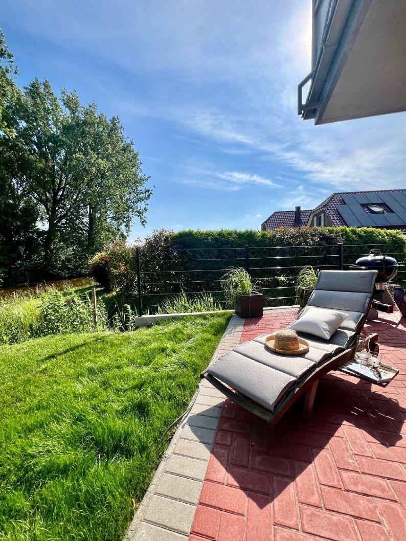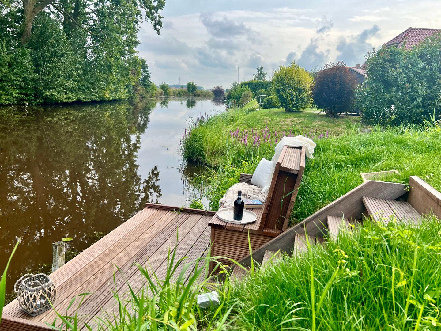 Das Grundstück ist unmittelbar am Siel, dem Alten Greetsieler Sieltief, gelegen und verfügt über einen eigenen Garten sowie einen privaten Steg. Mit freiem Blick auf das Sieltief und ins Grüne kann man hier die Seele so richtig baumeln lassen und einfach mal die Füße ins Wasser halten, angeln oder paddeln gehen.