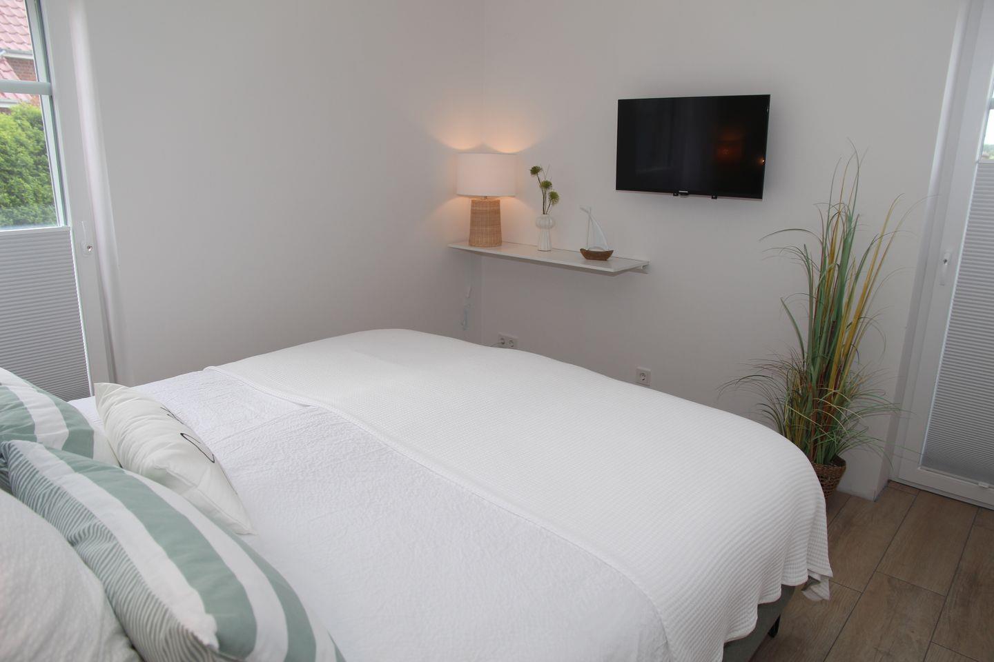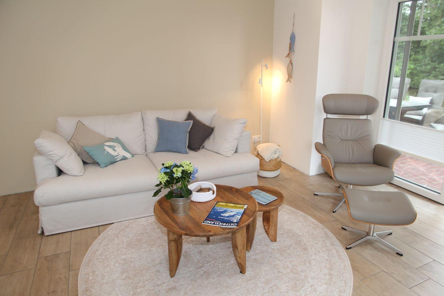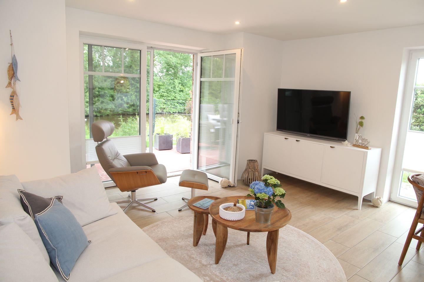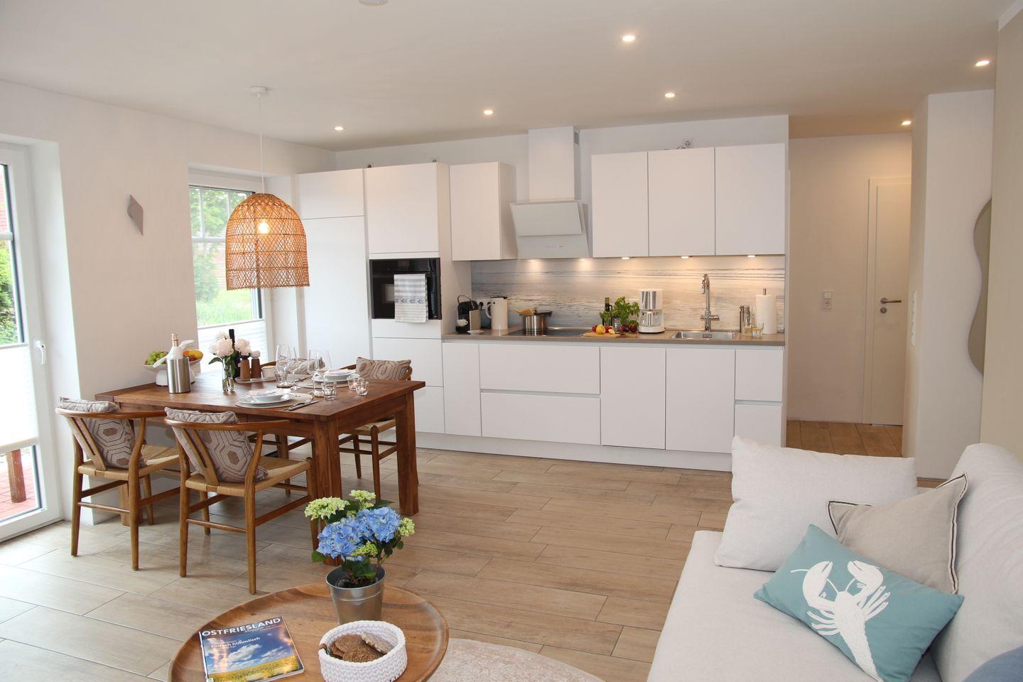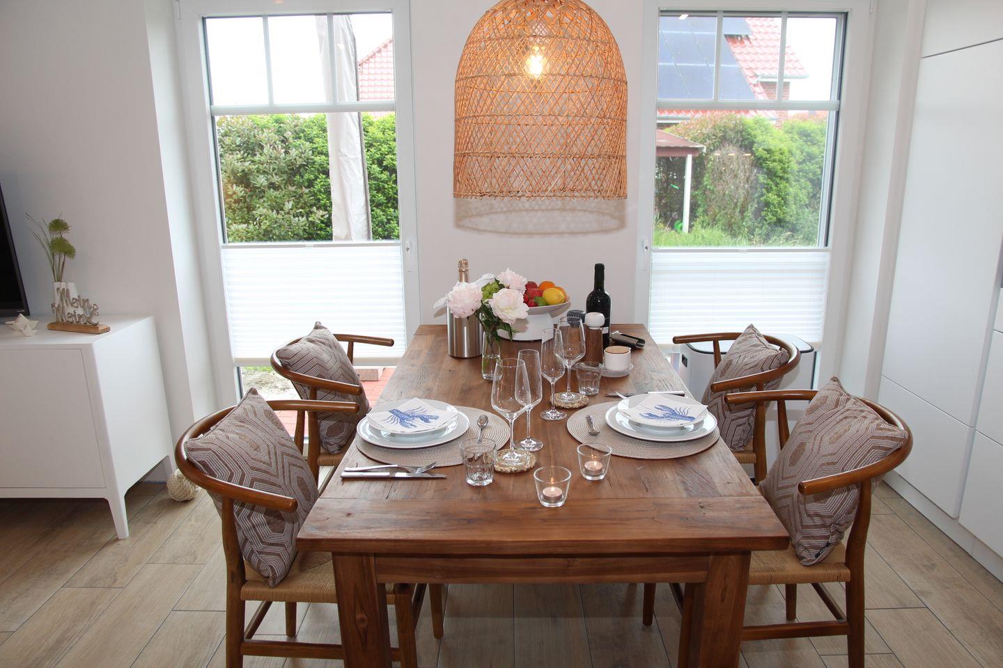 Genießen Sie Ihre Mahlzeiten im direkt angrenzenden Essbereich an dem großen Esstisch aus Teakholz und den Stühlen im nordischen Design. Für Gemütlichkeit zu jeder Jahreszeit sorgen das große komfortable Hussensofa und der bequeme Leder-Relaxsessel mit Ottomane mit direktem Blick auf das Siel. Der große schwenkbare 55-Zoll Smart-TV, eine Soundbar sowie einige Gesellschaftsspiele und Bücher sorgen für ausreichend Unterhaltung. Zeitgemäß erfolgt der Internetempfang über Glasfaser-WLAN (Für uneingeschränkte Verfügbarkeit und ausreichende Geschwindigkeit übernehmen wir keine Gewähr.).
