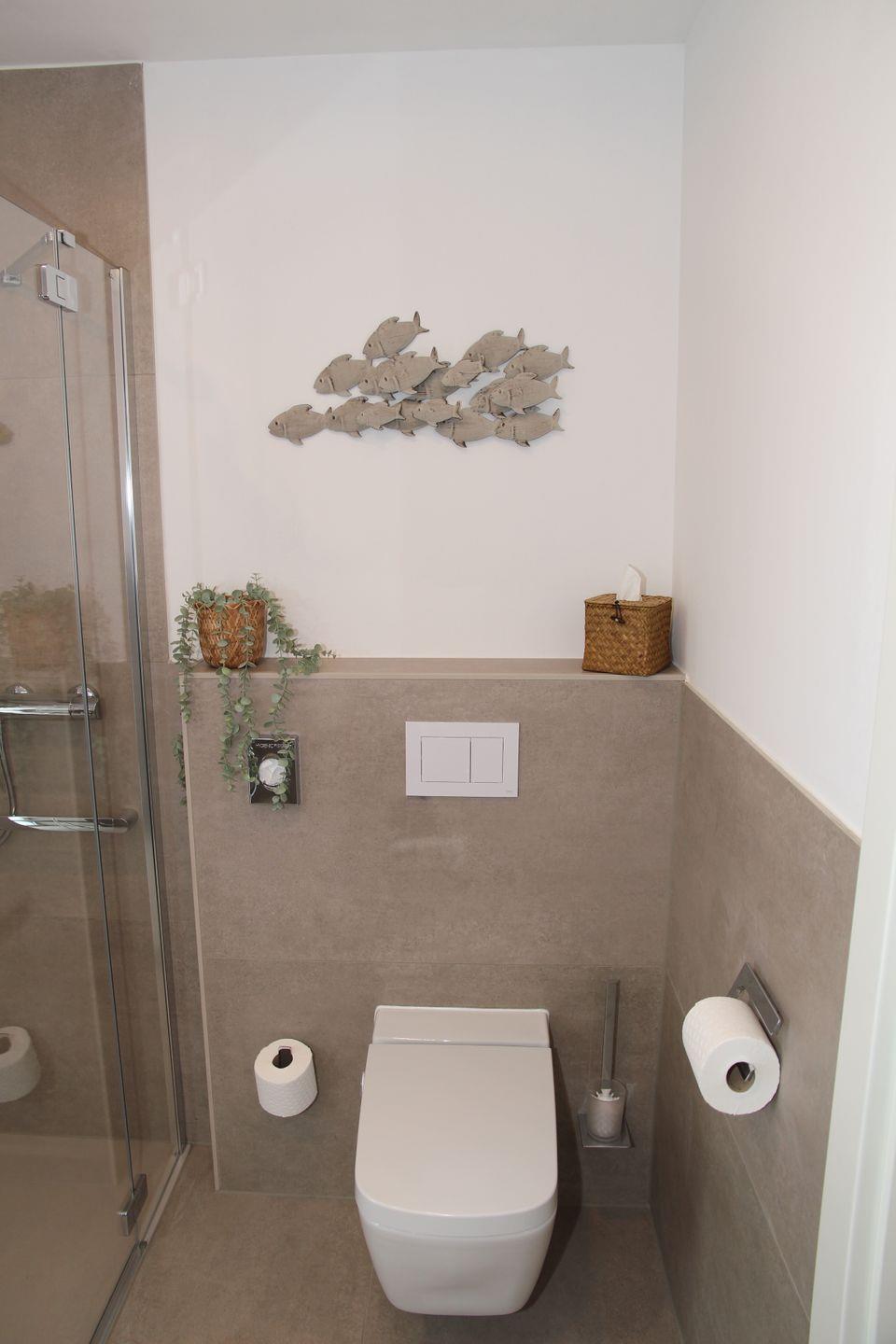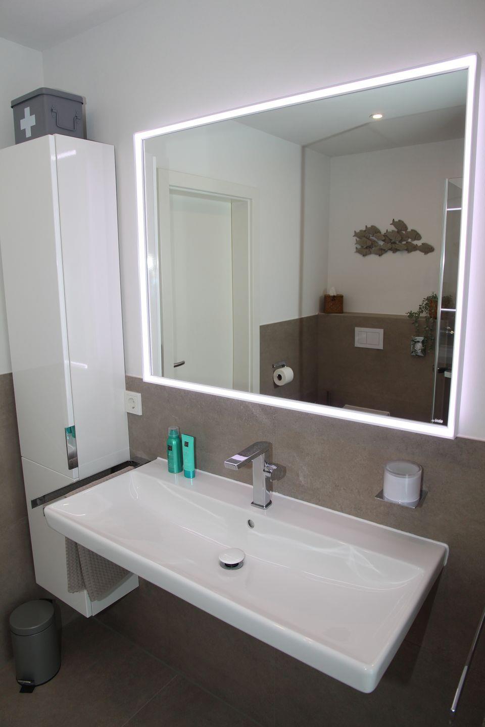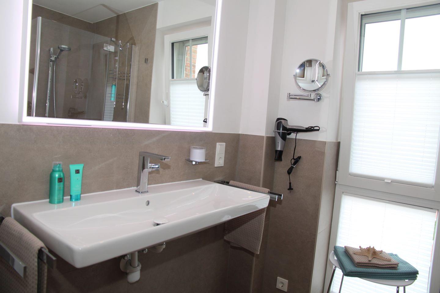 Im hellen und barrierearmen Tageslichtbad mit großer bodengleicher Dusche, Dusch-WC, Duschhocker, Fön und Vergrößerungsspiegel lässt es sich ebenfalls so richtig entspannen und erfrischen.