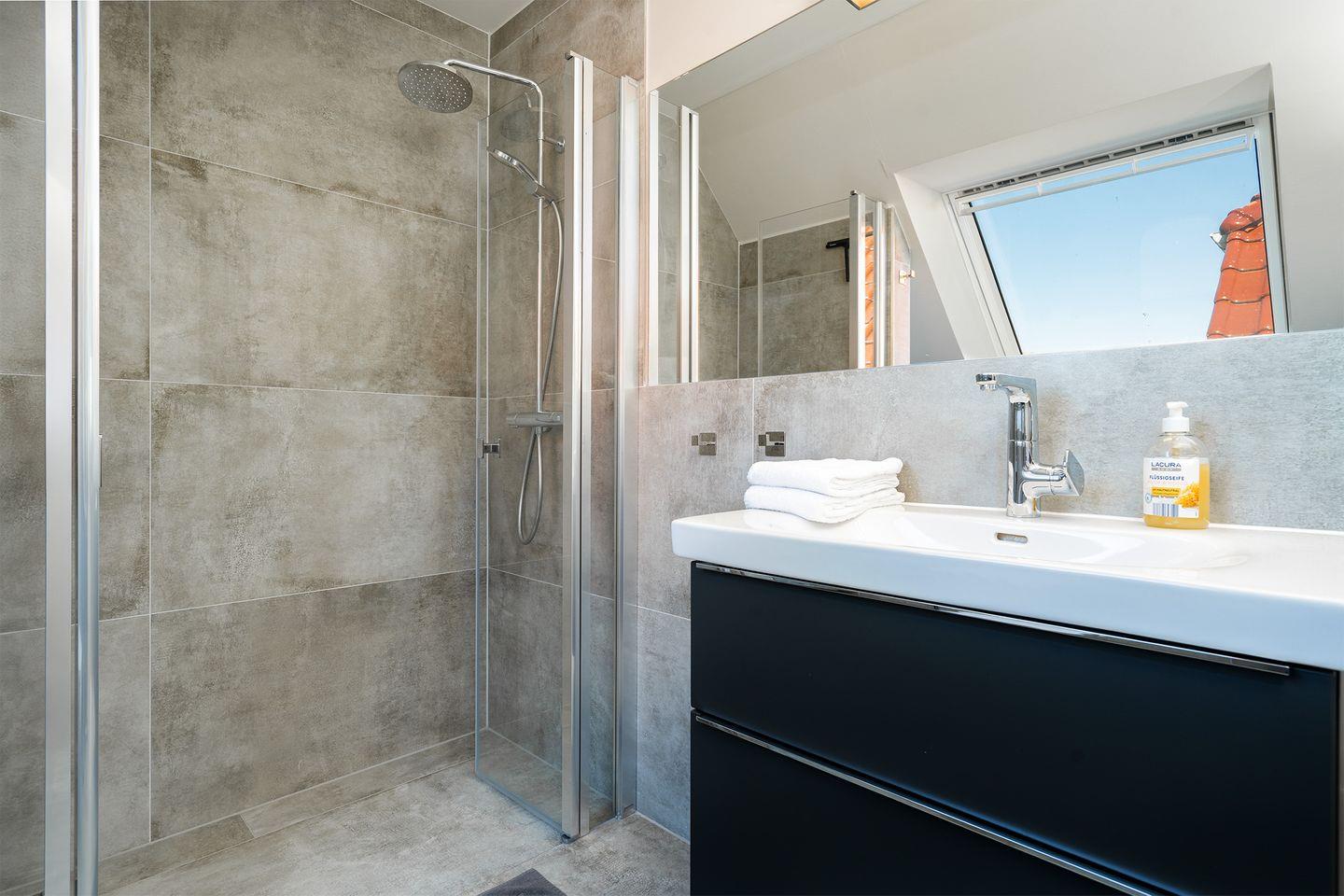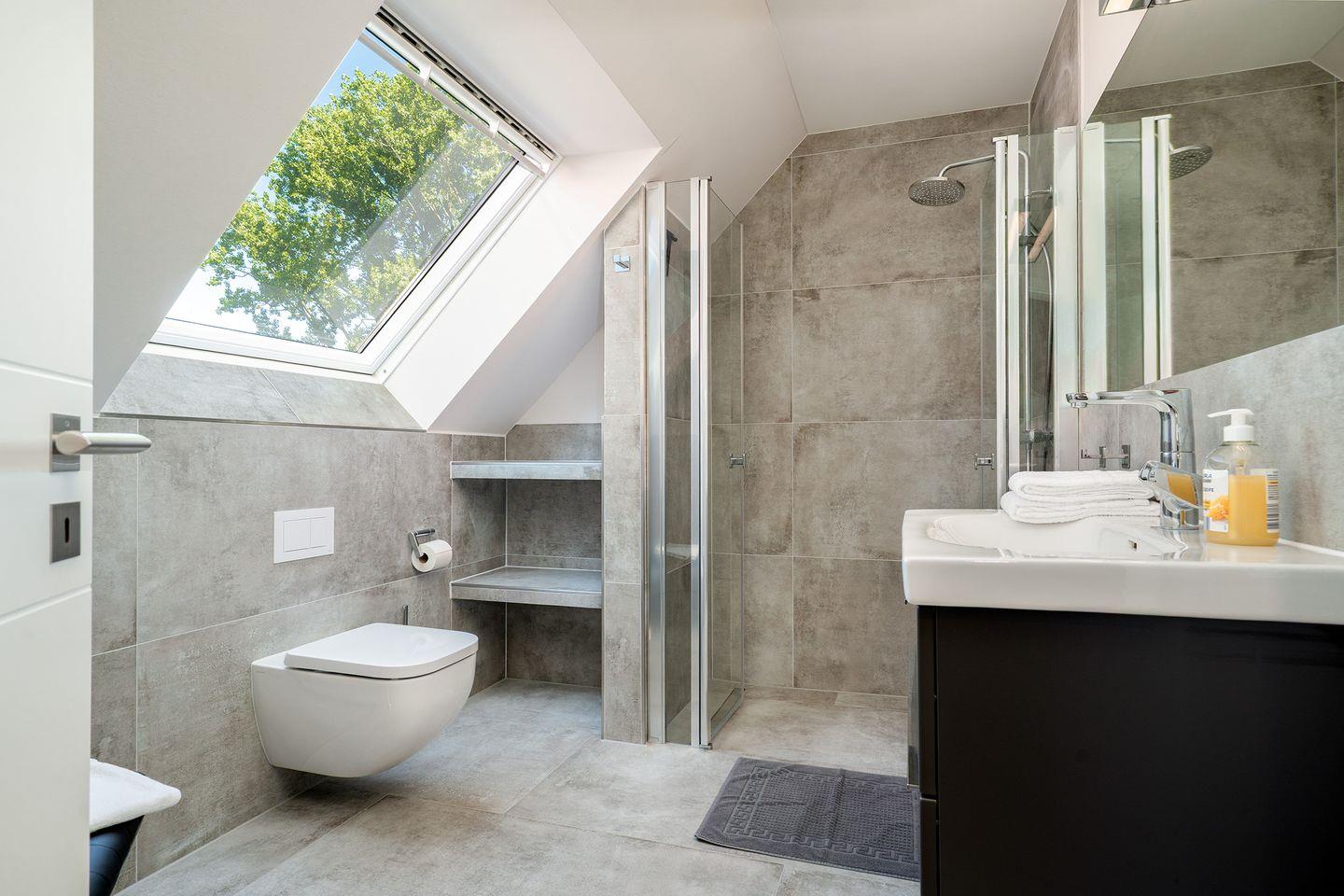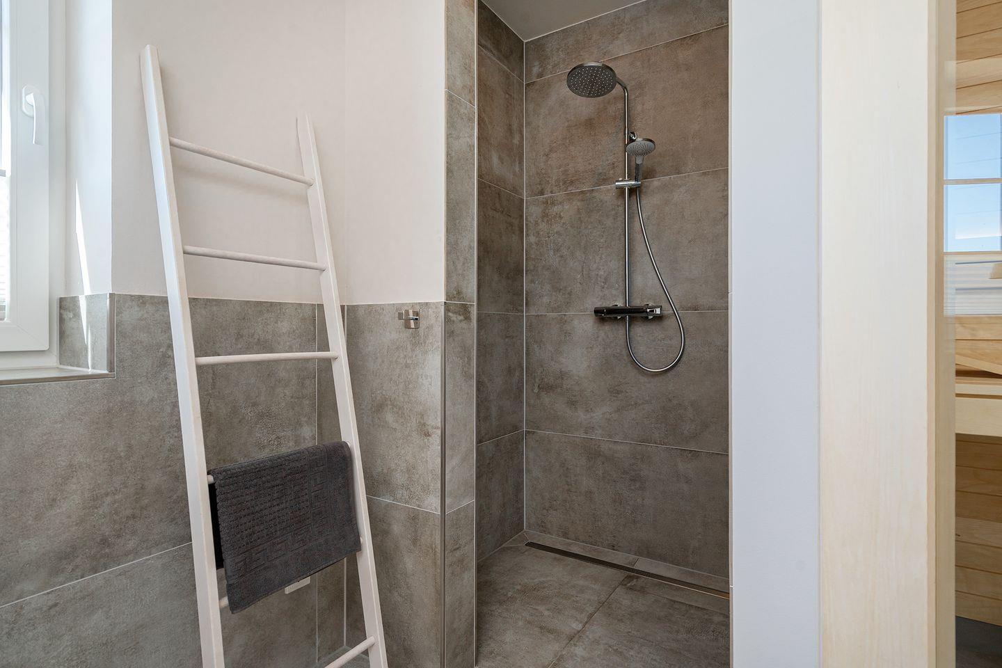 In dem Ferienhaus finden Sie zwei Badezimmer vor, die mit bodengleichen Duschen ausgestattet sind. Das Wellnessbad im Erdgeschoss ist zusätzlich mit einer Badewanne und einer großen Sauna versehen, perfekt zum Entspannen nach einem erlebnisreichen Tag. Das Duschbad im Obergeschoss mit großem Dachflächenfenster bietet mit WC, Waschtisch, Dusche und Fön ebenfalls ausreichend Platz.