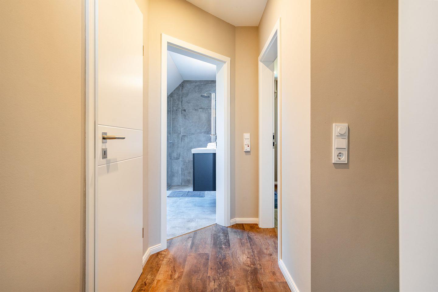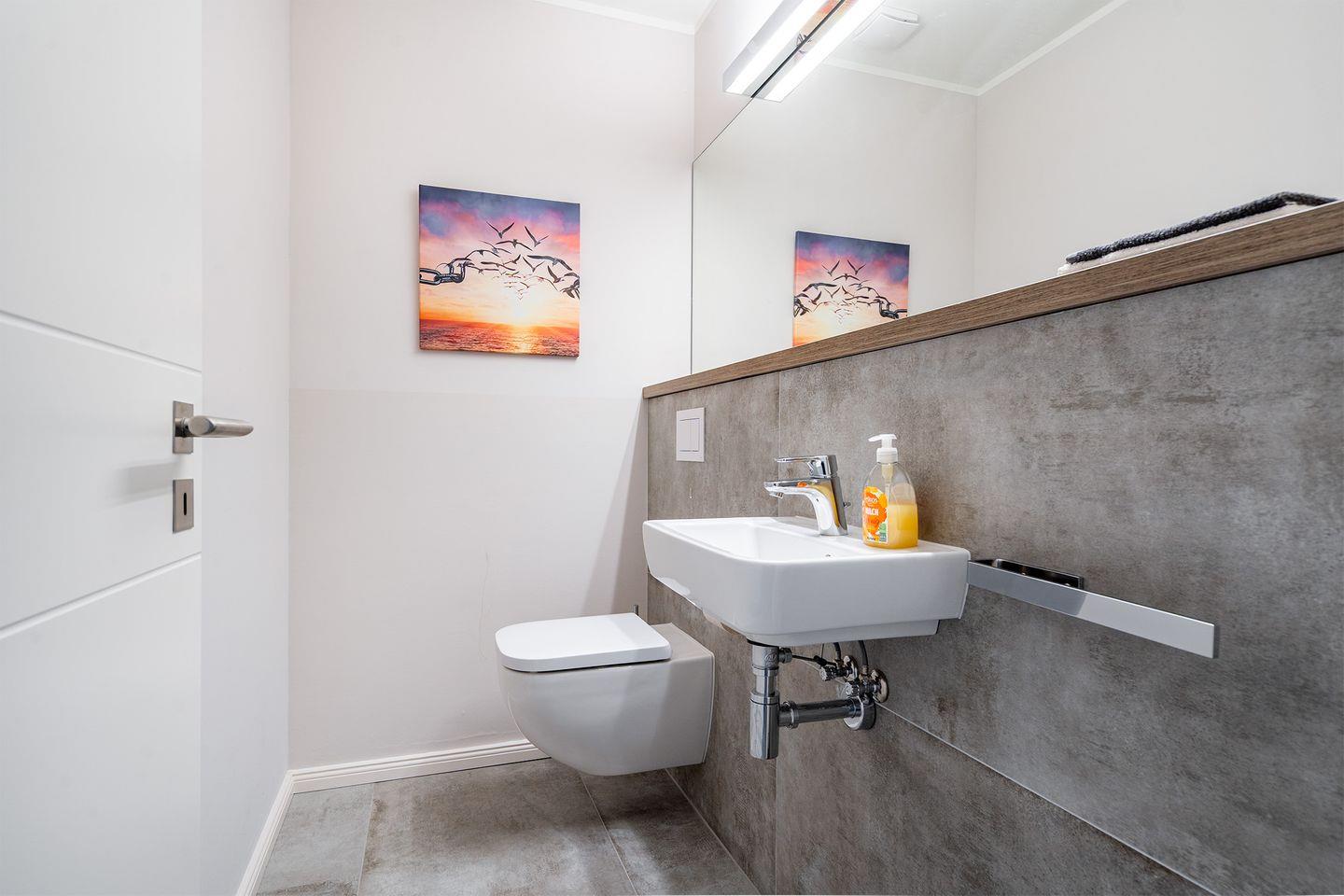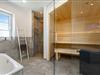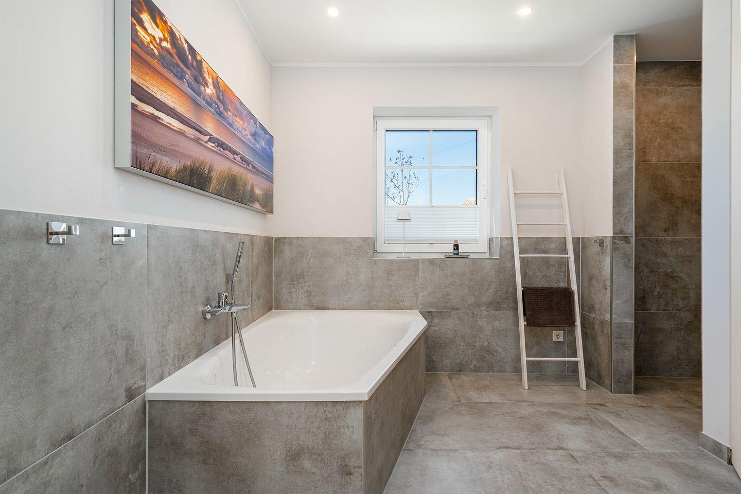 In dem Ferienhaus finden Sie zwei Badezimmer vor, die mit bodengleichen Duschen ausgestattet sind. Das Wellnessbad im Erdgeschoss ist zusätzlich mit einer Badewanne und einer großen Sauna versehen, perfekt zum Entspannen nach einem erlebnisreichen Tag. Das Duschbad im Obergeschoss mit großem Dachflächenfenster bietet mit WC, Waschtisch, Dusche und Fön ebenfalls ausreichend Platz.