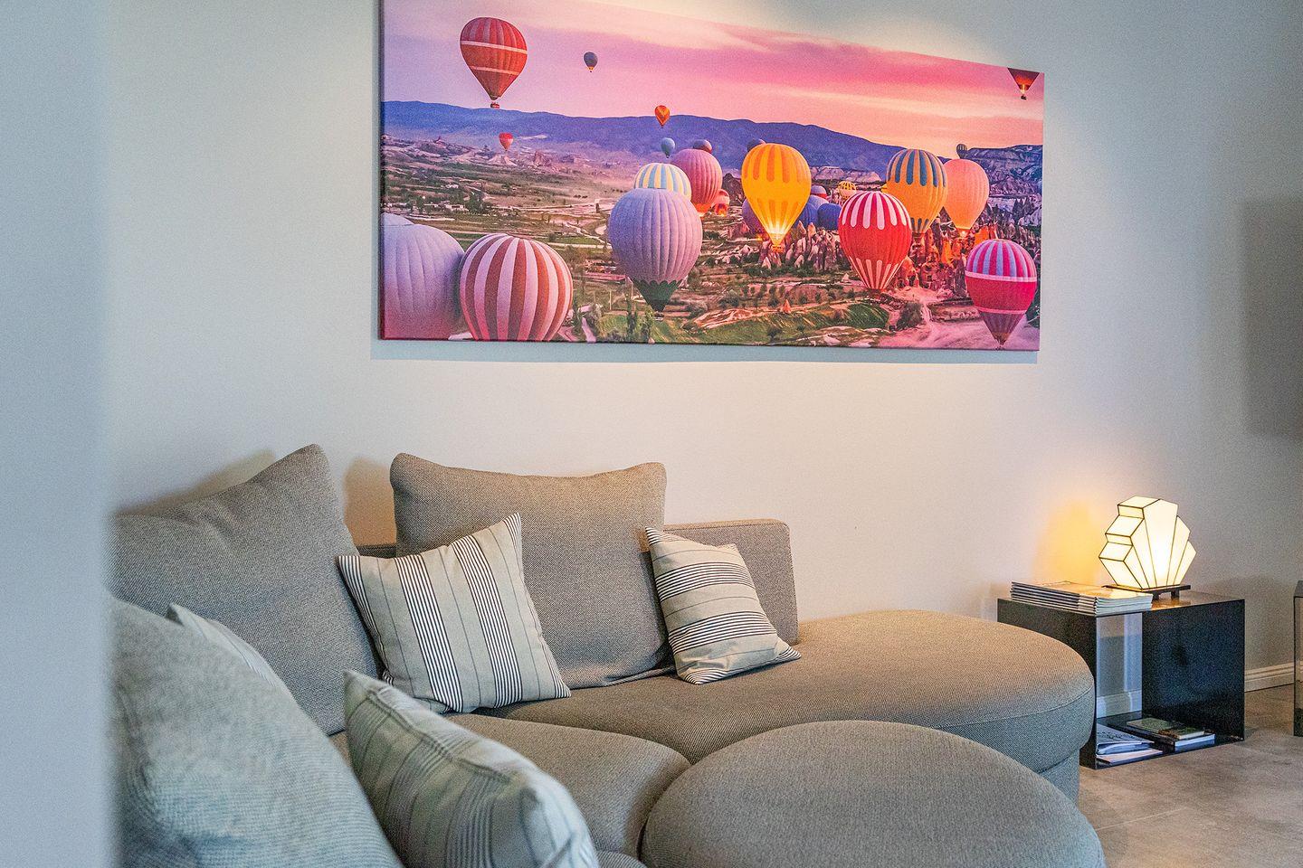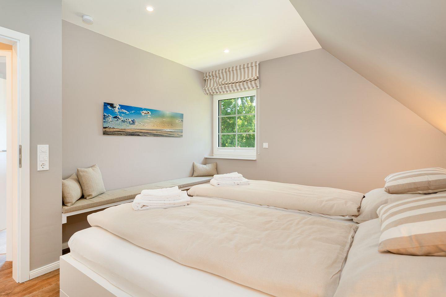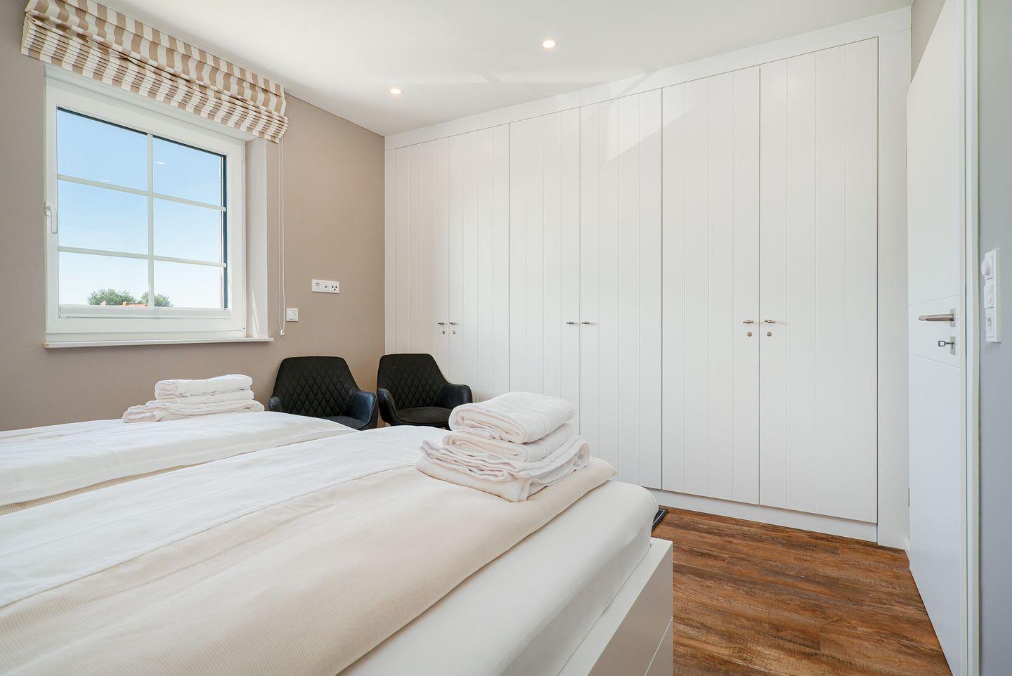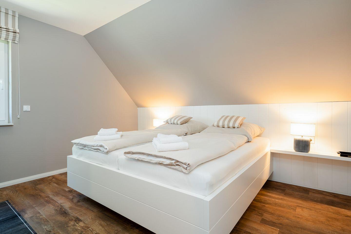 Der Wohnbereich bietet neben einer Sofaecke mit einem bequemen Sofa, auch einen großen TV für entspannte Filmabende. Durch die großen Fenster genießen Sie nicht nur eine helle, freundliche Atmosphäre, sondern auch einen außergewöhnlich guten Landschaftsblick. Dies gilt ebenso für die beiden Schlafzimmer im Obergeschoss, die mit gemütlichen Doppelbetten (einzelne Matratzen), elektrischen Rollläden und Einbauschränken ausgestattet und damit ideal für eine erholsame Nachtruhe sind.