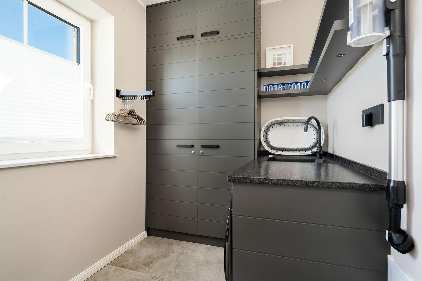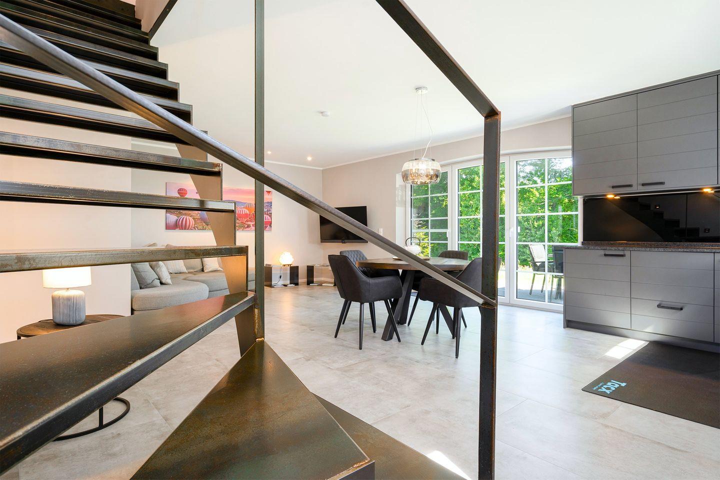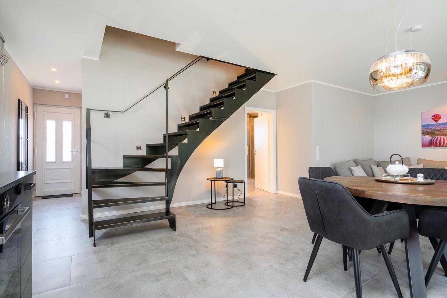 Die behagliche Unterkunft besticht durch ihr offenes Raumkonzept, das eine offene Küche hervorhebt, die zum Wohnzimmer hin geöffnet ist. Hier können Sie köstliche Mahlzeiten zubereiten und gemütliche Abende am runden Esstisch mit Sielblick genießen. Die voll ausgestattete Küche verfügt über moderne Annehmlichkeiten, darunter Induktionsherd, Backofen, Spülmaschine, Kaffeemaschine, Wasserkocher, Toaster, Mixer sowie einen Kühlschrank mit Gefrierfach, um Ihren Aufenthalt so angenehm wie möglich zu gestalten.
