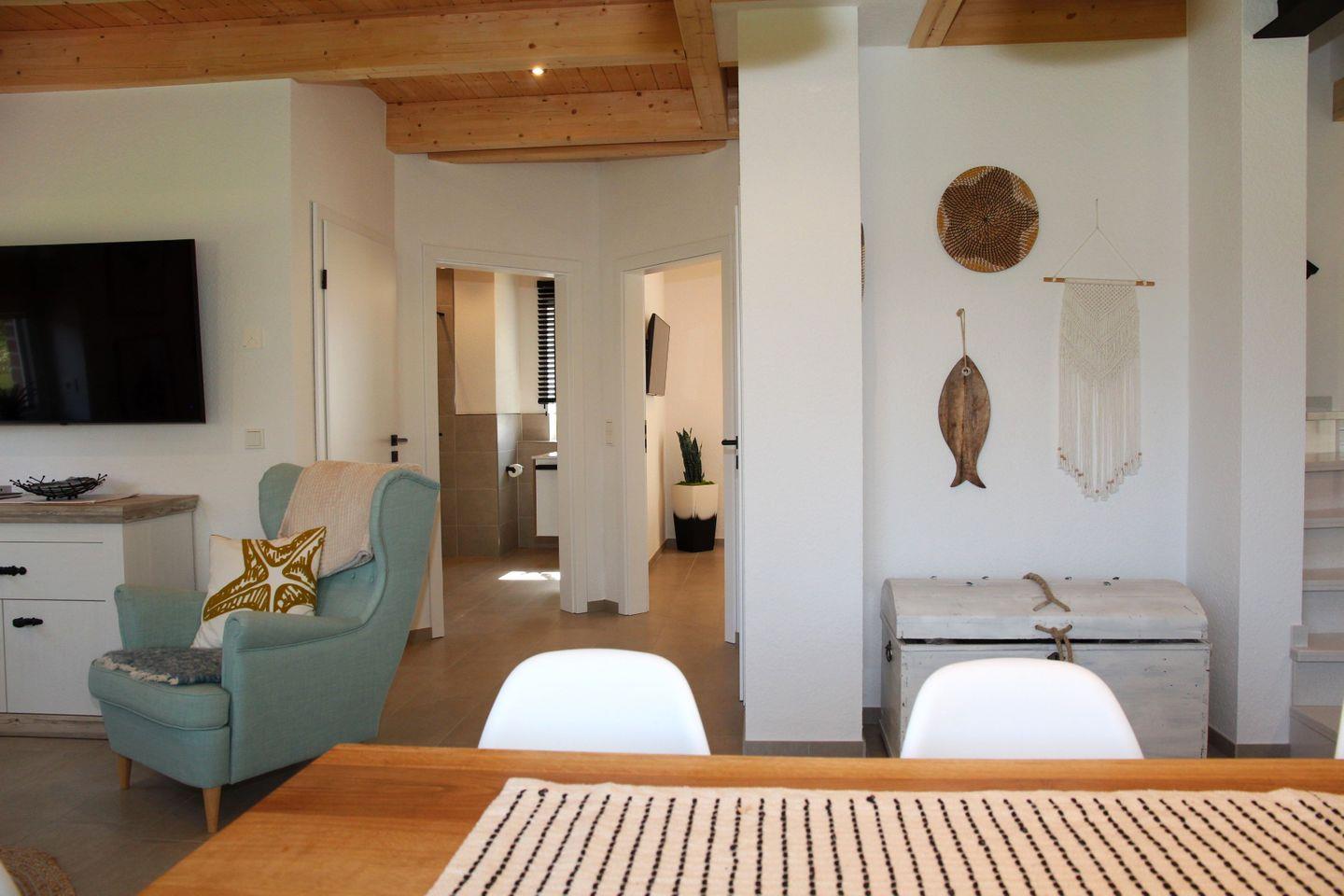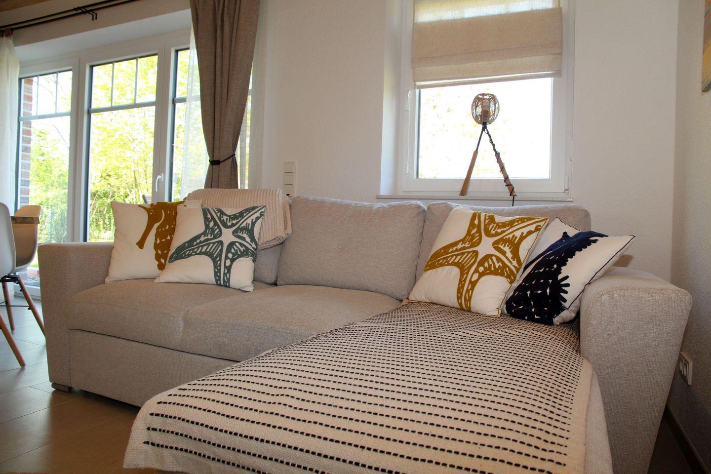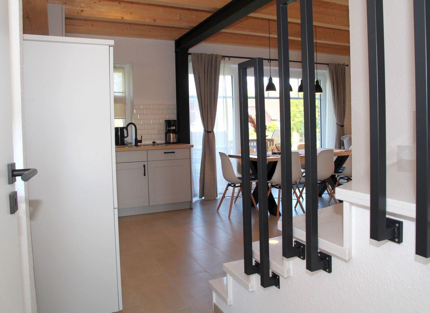 Das Haus begrüßt Sie mit einem modernen und offenen Wohnkonzept im gemütlichen Skandi-Stil. Die Wohnküche, u.a. ausgestattet mit Cerankochfeld, Backofen, Mikrowelle, Spülmaschine, Kühlschrank mit separatem Gefrierschrank, Kaffeemaschine, Senseo-Padmaschine, Wasserkocher, Toaster und Eierkocher, lädt zum gemeinsamen Kochen und Verweilen ein. Genießen Sie Ihre Mahlzeiten im gemütlichen Essbereich mit Blick durch die raumhohen Fenster auf das Siel oder im Freien auf der Terrasse, die mit Gartenmöbeln ausgestattet ist. Das Wohnzimmer bietet eine komfortable Sofaecke mit Sessel und TV (Zattoo Premium, kostenfrei) für entspannte Abende. Hier können Sie gemütliche Stunden verbringen und die Zeit mit Ihren Liebsten genießen.