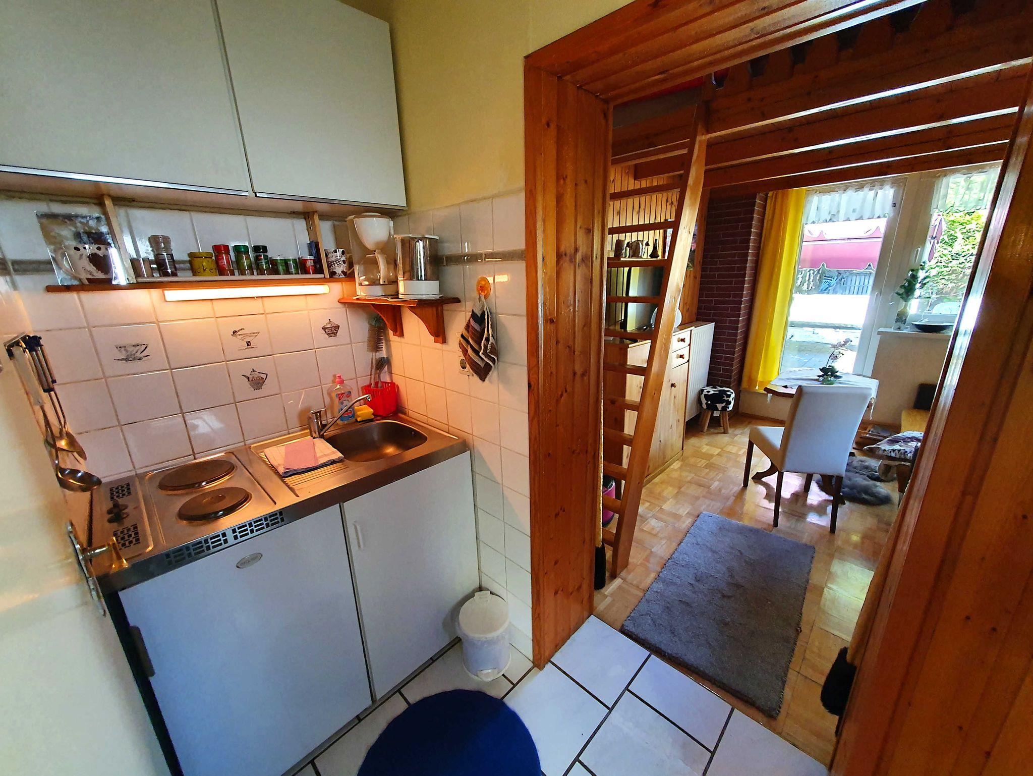 Das Ferienhaus ist schlicht und zweckmäßig eingerichtet und teilt sich in eine kleine Wohnküche und ein Wohnzimmer mit Zugang zur Terrasse auf. Das Bett befindet sich als Hochbett im Wohnbereich und ist über eine Leiter erreichbar. In der Wohnküche steht Ihnen eine kleine Singleküche mit Kühlschrank und 2 Plattenherd, eine Kaffeemaschine, ein Wasserkocher, ein Esstisch mit Couch und Stühlen zur Verfügung. Es wird empfohlen, Bettwäsche und Handtücher mitzubringen. Alternativ können Sie das Wäschepaket gegen Gebühr zu buchen. Hinweis: Bei dem Bett handelt es sich um eine Matratze von 2,00 x 2,00 m. Bitte bedenken Sie bei der Mitnahme, dass das Laken eine entsprechende Größe haben muss.
