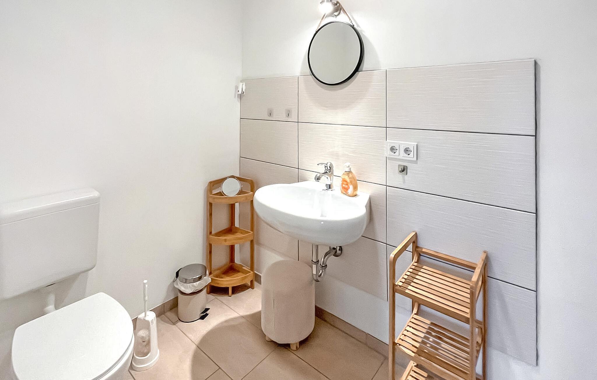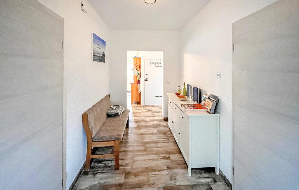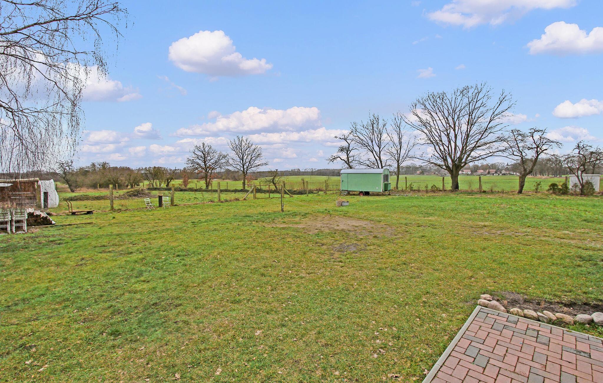 En af tre ferielejligheder beliggende i stueetagen i et tidligere dobbelthus på en 10.000 kvm stor grund i udkanten af en landsby. Den enorme ejendom byder på masser af plads til sport, leg og kæledyr. Fra ejendommen har man udsigt til den store natur, som gør det muligt at observere de lokale havørne og vilde dyr som rådyr og ræve. Hele ejendommen blev fuldstændig renoveret og nydesignet i 2021. Den cirka 90 kvm 4-værelses lejlighed til maks. 6 personer og 2 babyer har en stue (polstrede møbler, fladskærms-tv, stereoanlæg), tre soveværelser (2 x dobbeltseng, tv, 1 x køjeseng, tv), en separat køkken (El-komfur med ovn, køleskab med fryser, opvaskemaskine, spisebord, diverse køkkenmaskiner, vaskemaskine), badeværelse med brus/toilet og gæstetoilet. Værelserne er opvarmet med centralvarme. En barneseng og høj stol kan stilles til rådighed for små børn. Internet (W-Lan) er også tilgængelig. Udenfor er der et udendørs opholdsområde med grill. Der er også en parkeringsplads. Den samlede pris inkluderer slutrengøring, sengelinned, håndklæder samt vand- og elforbrug. Wredenhagen er en landsby i et naturskønt område i det sydlige Mecklenburgske sødistrikt på grænsen til Brandenburg. De små byer Röbel an der Müritz og Wittstock ligger hver omkring 15 km væk. Elde-floden løber gennem byen til Mönchsee, et naturreservat, hvor blandt andet havørnen er hjemmehørende. Søen er ikke en badesø på grund af dens sumpede kystområder. Glambecksee, 7 km væk, er dog perfekt til dette, da den har fremragende vandkvalitet. Et par kilometer syd for statsgrænsen strækker et enormt skovområde sig helt til Wittstock.Wredenhagen er kendt for sit slot, der kan dateres tilbage til det 13. århundrede. Engang magtsæde for fyrster, huser det nu en folkeskole, et museum med en udstilling og et 300 år gammelt kobberbøgetræ. Der er også en landsbybutik i landsbyen til små ærinder. Der skulle dog foretages større indkøb i de ovenfor nævnte små byer. Takket være livlig klubaktivitet finder der adskillige arrangementer sted i byen hvert år.