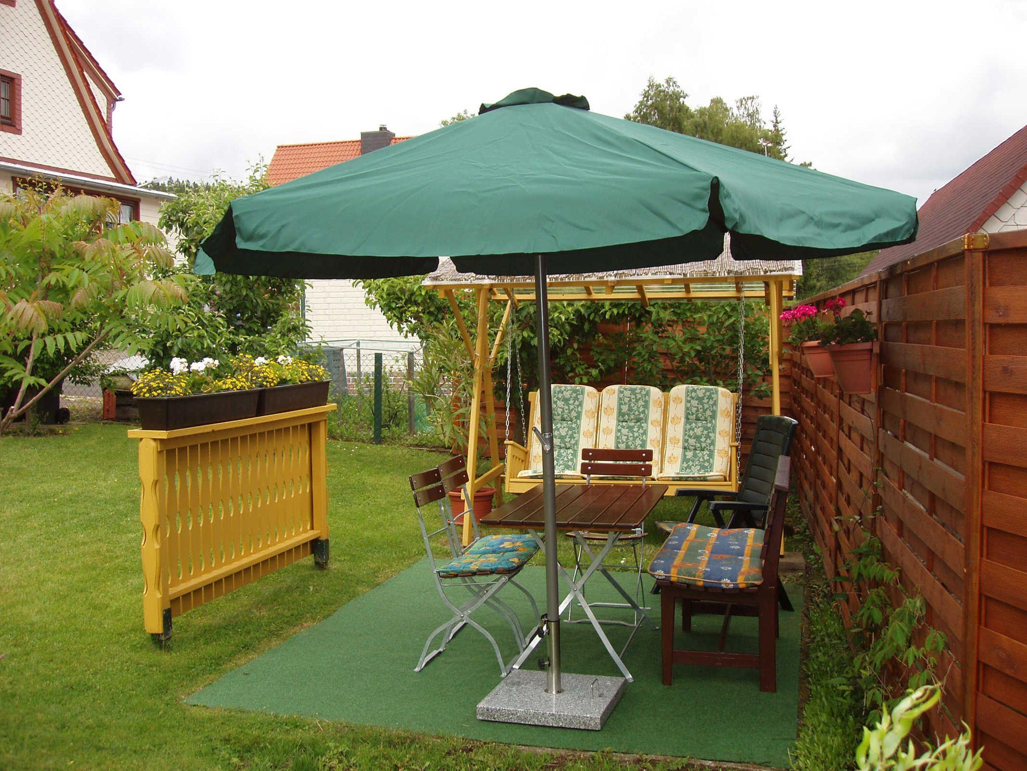 gemütliche Sitzecke im Garten (Hollywoodschaukel, Tisch und Stühle, Bank)
