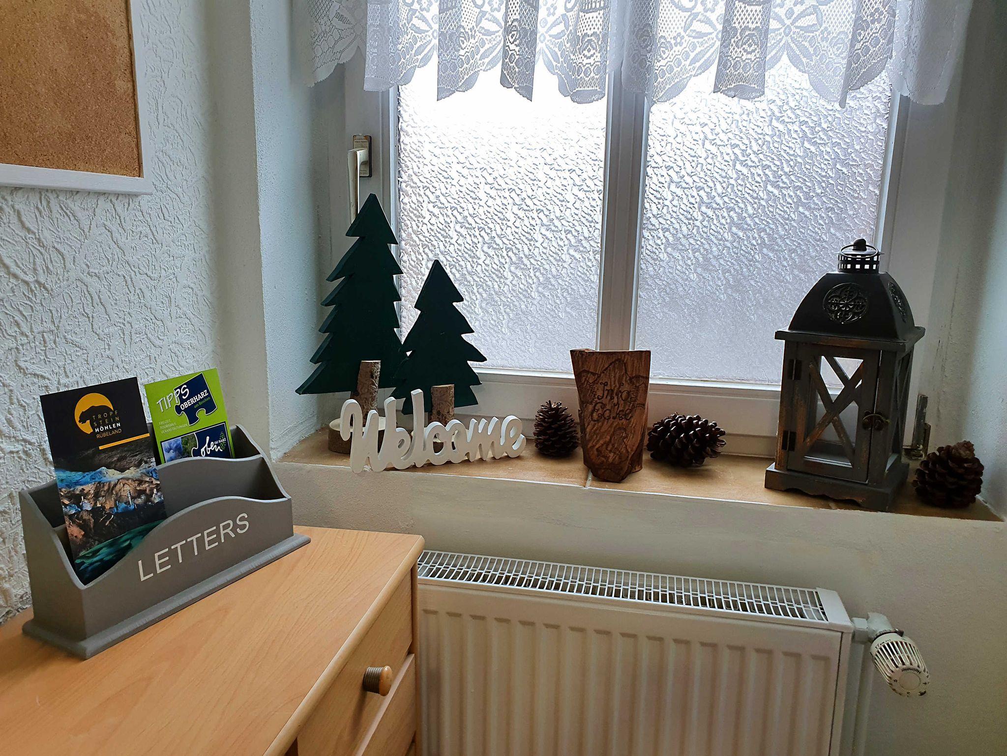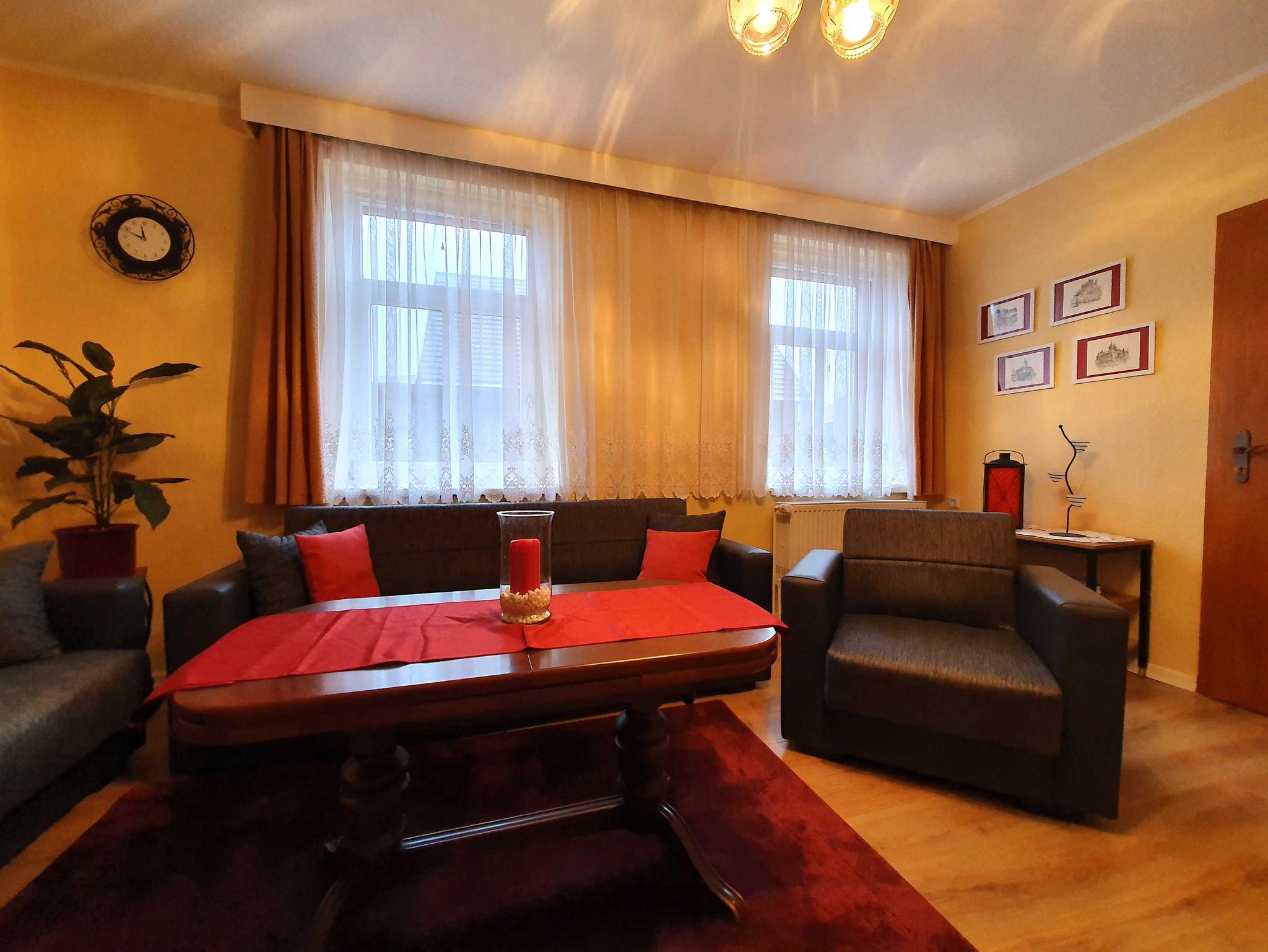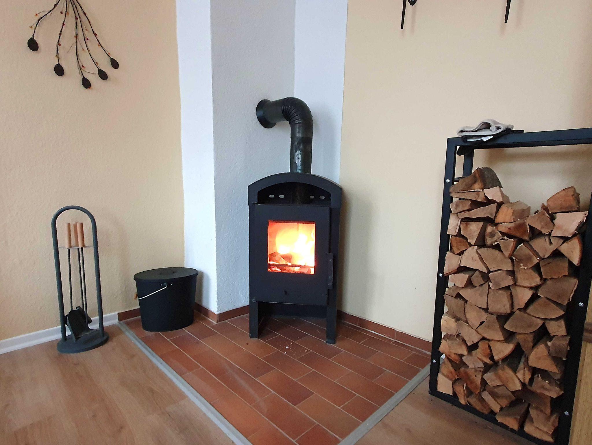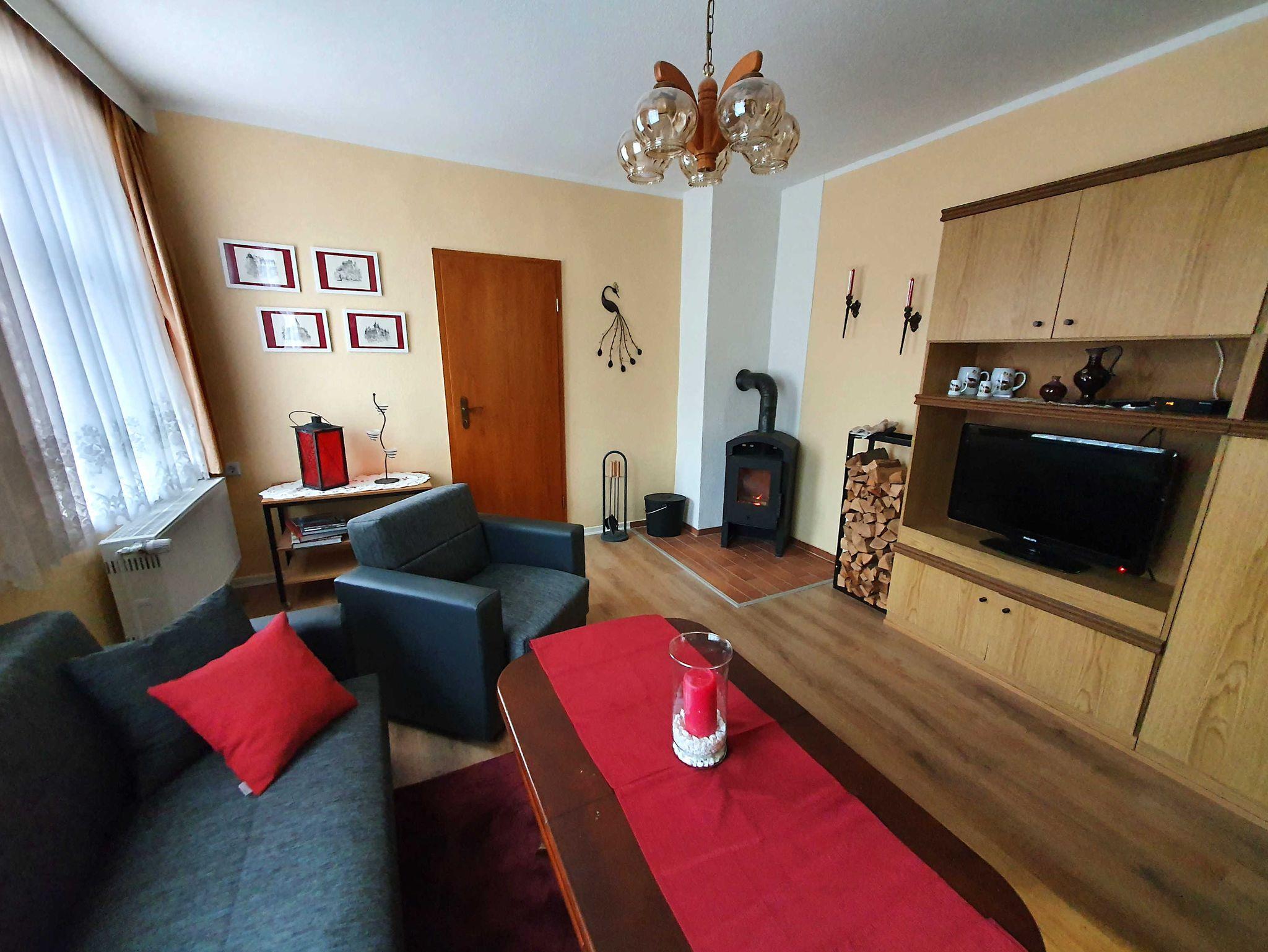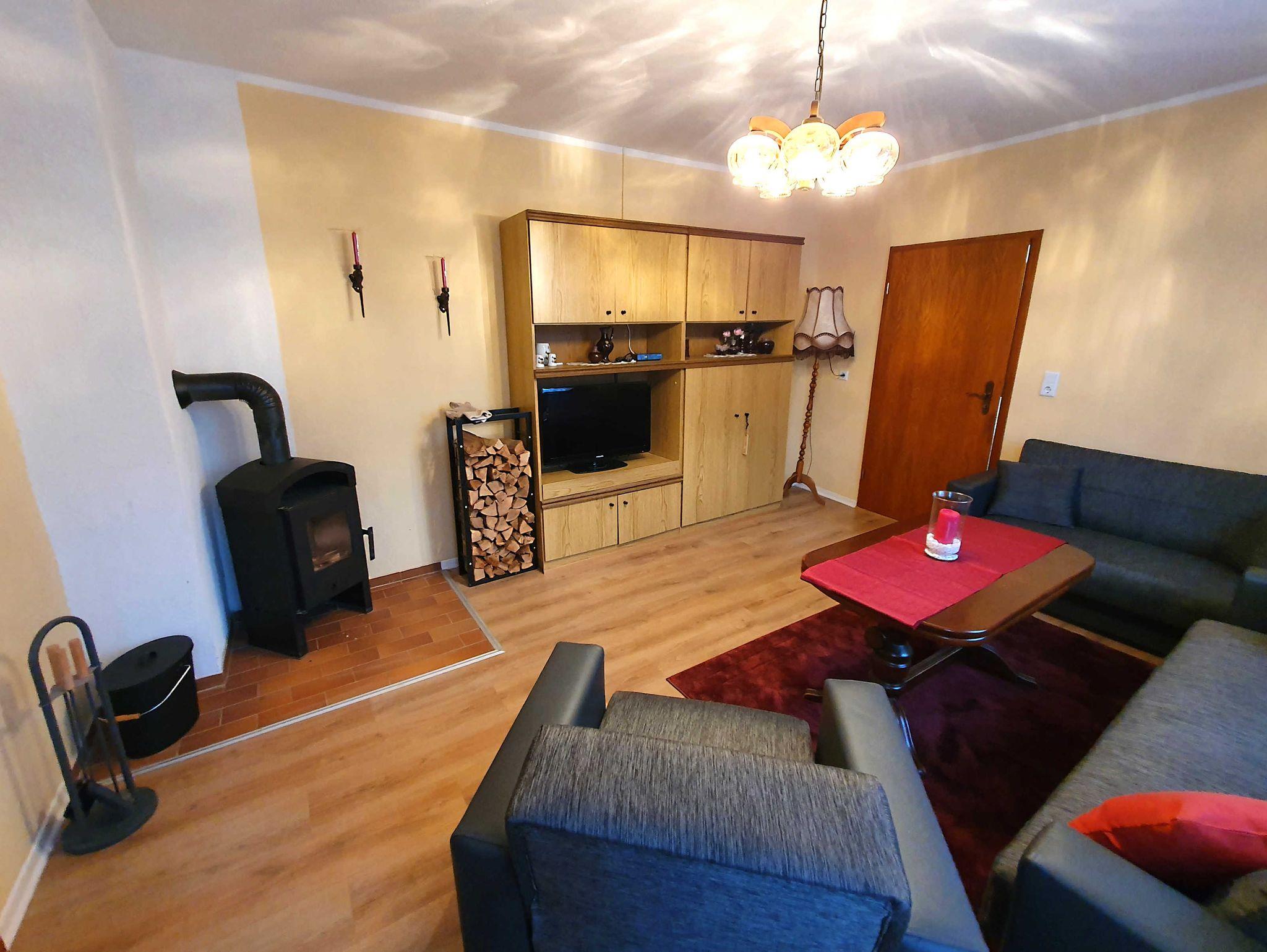 Lassen Sie den Abend entspannt vor dem Kaminofen in unserem gemütlichen Wohnzimmer ausklingen. Es bietet dank 1-, 2- und 3-Sitzer ausreichend Platz für die ganze Familie. Außerdem steht Ihnen ein Flachbildschirm mit Sat-Anlage sowie W-LAN zur Verfügung. Auch hier ist Laminatboden.