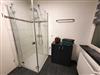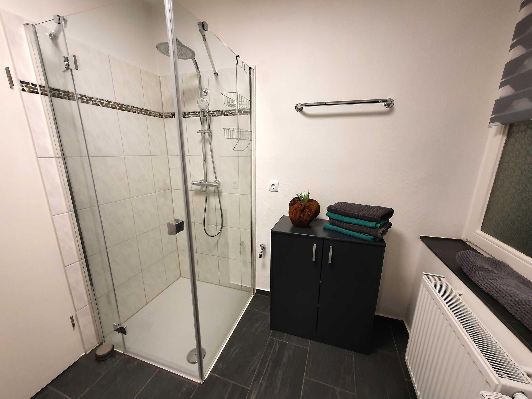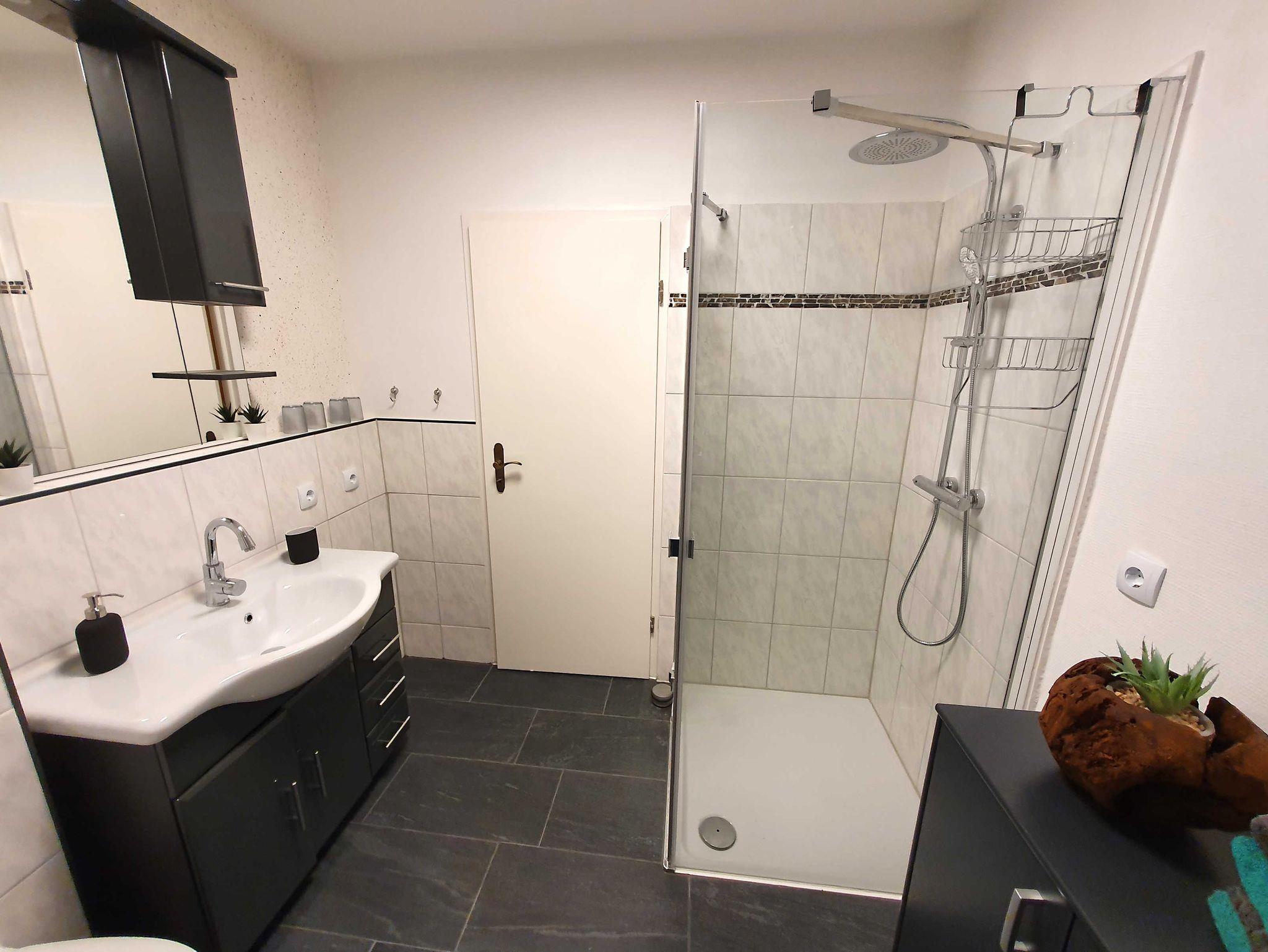 Im Bad mit Fliesenboden ist eine ebenerdige Dusche, ein WC und Waschtisch mit großem Spiegel, sowie einen Haartrockner vorhanden.