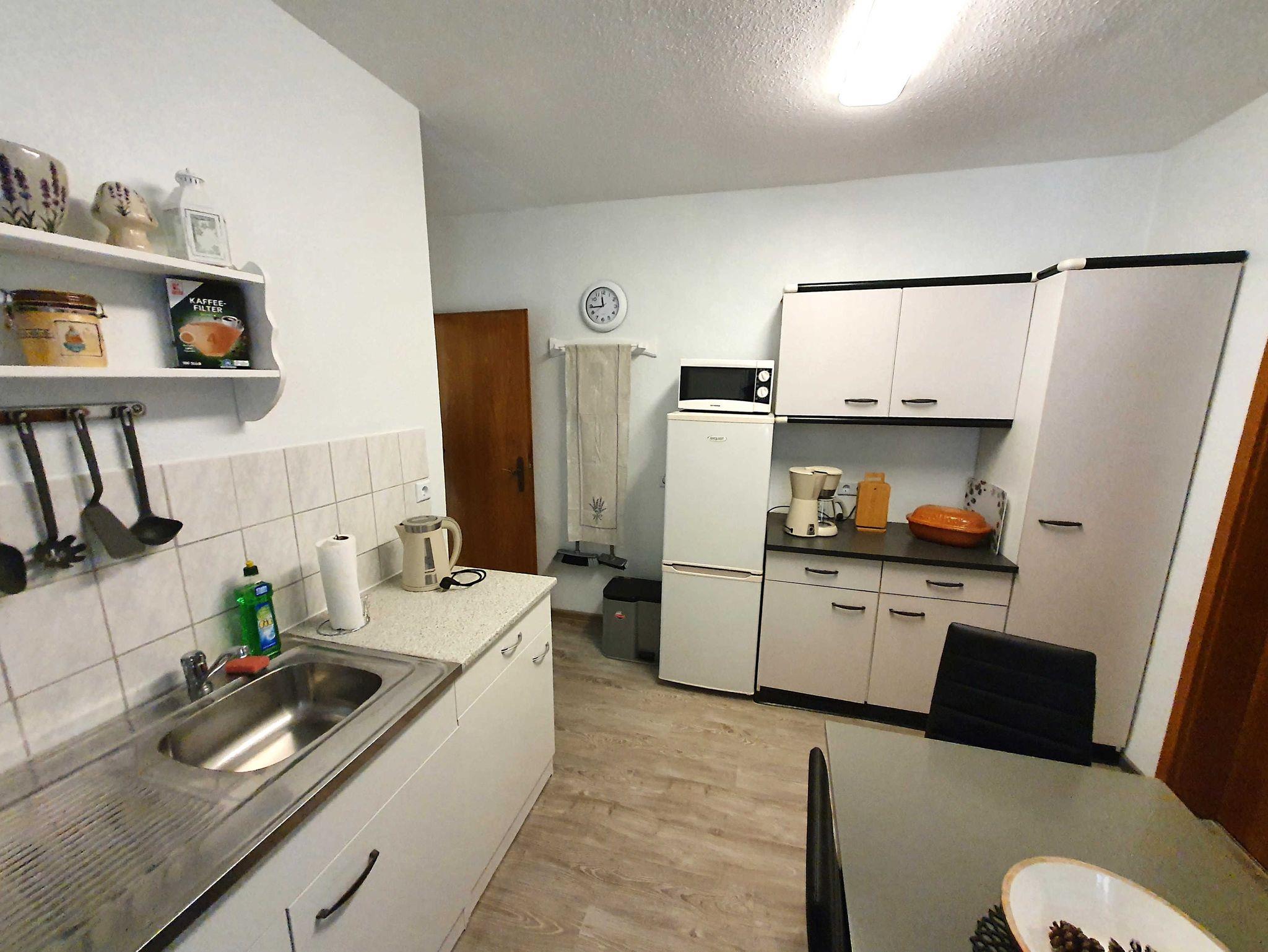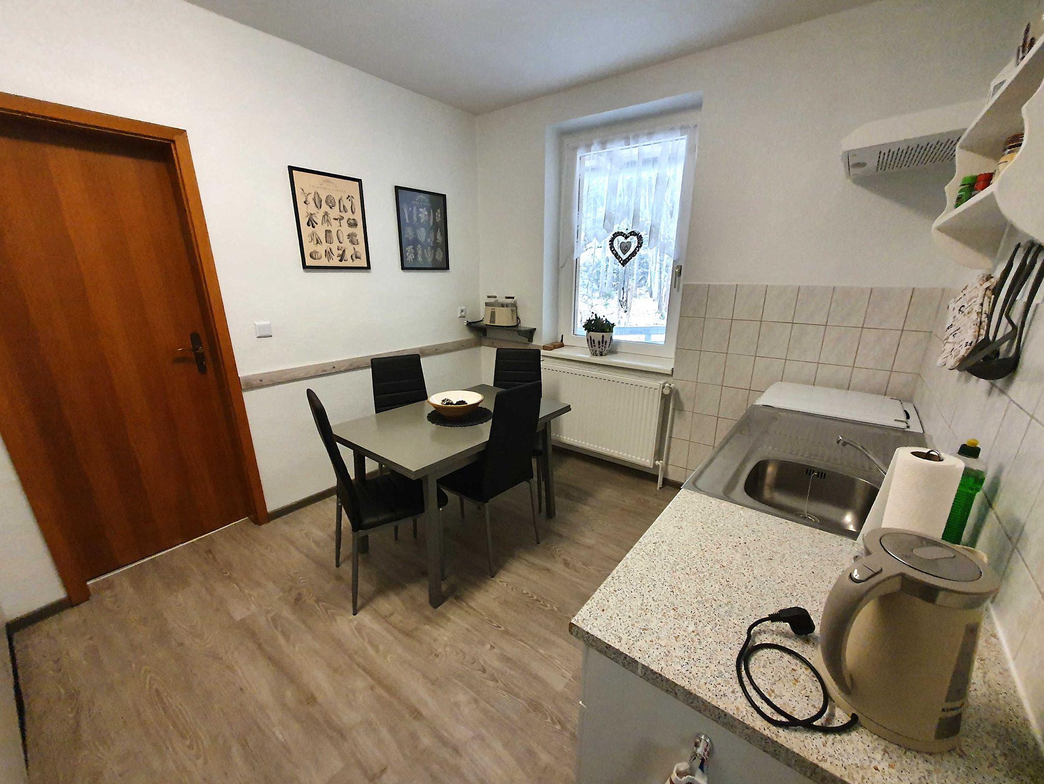 Unsere Küche mit Essbereich und Laminatboden ist voll ausgestattet mit einer Kühl-Gefrierkombination, E-Herd, Mikrowelle, Spüle sowie Kaffeemaschine, Toaster und Wasserkocher. Zudem stellen wir Ihnen Geschirrtücher, Putzmittel und Müllbeutel bereit.