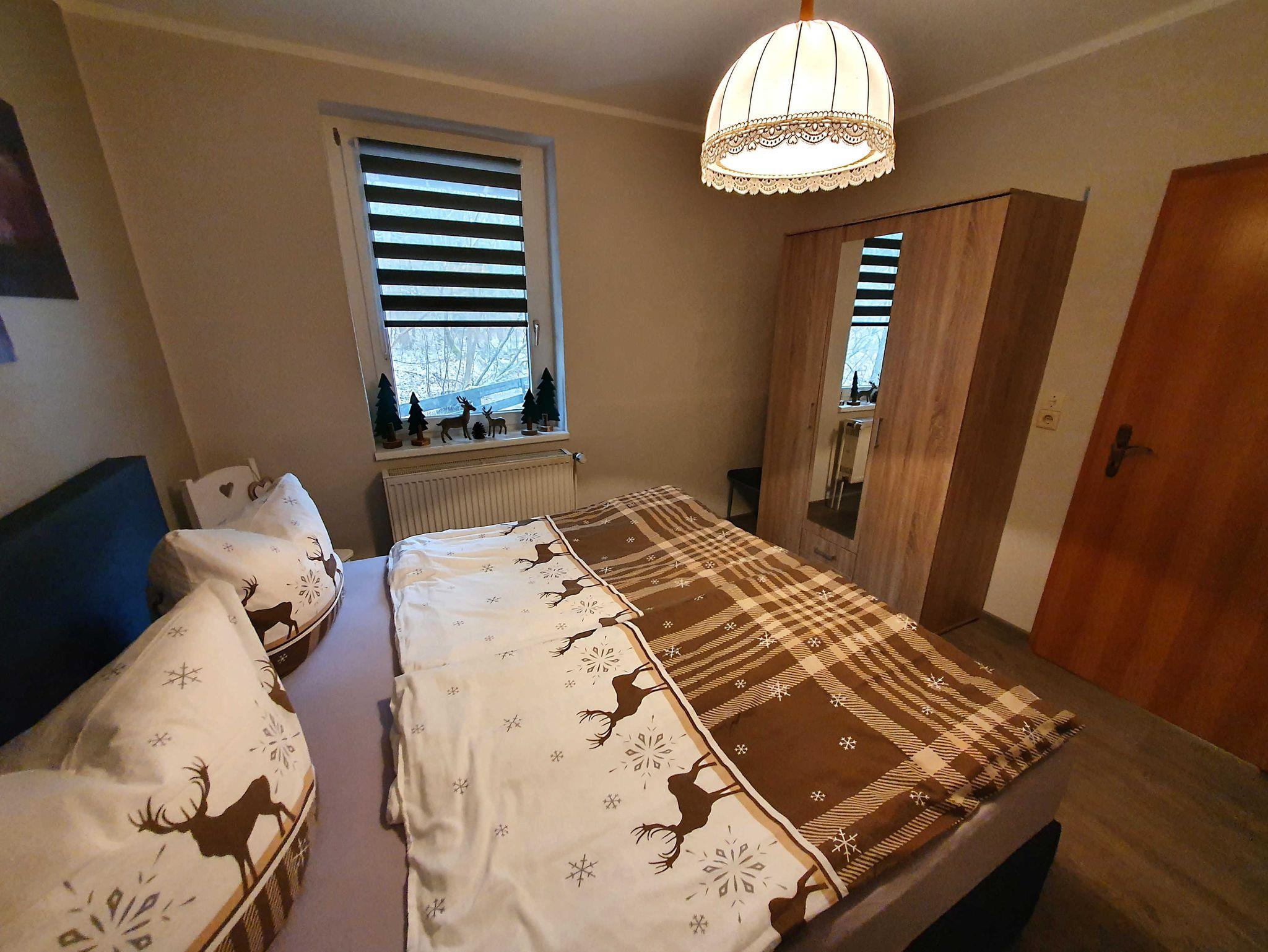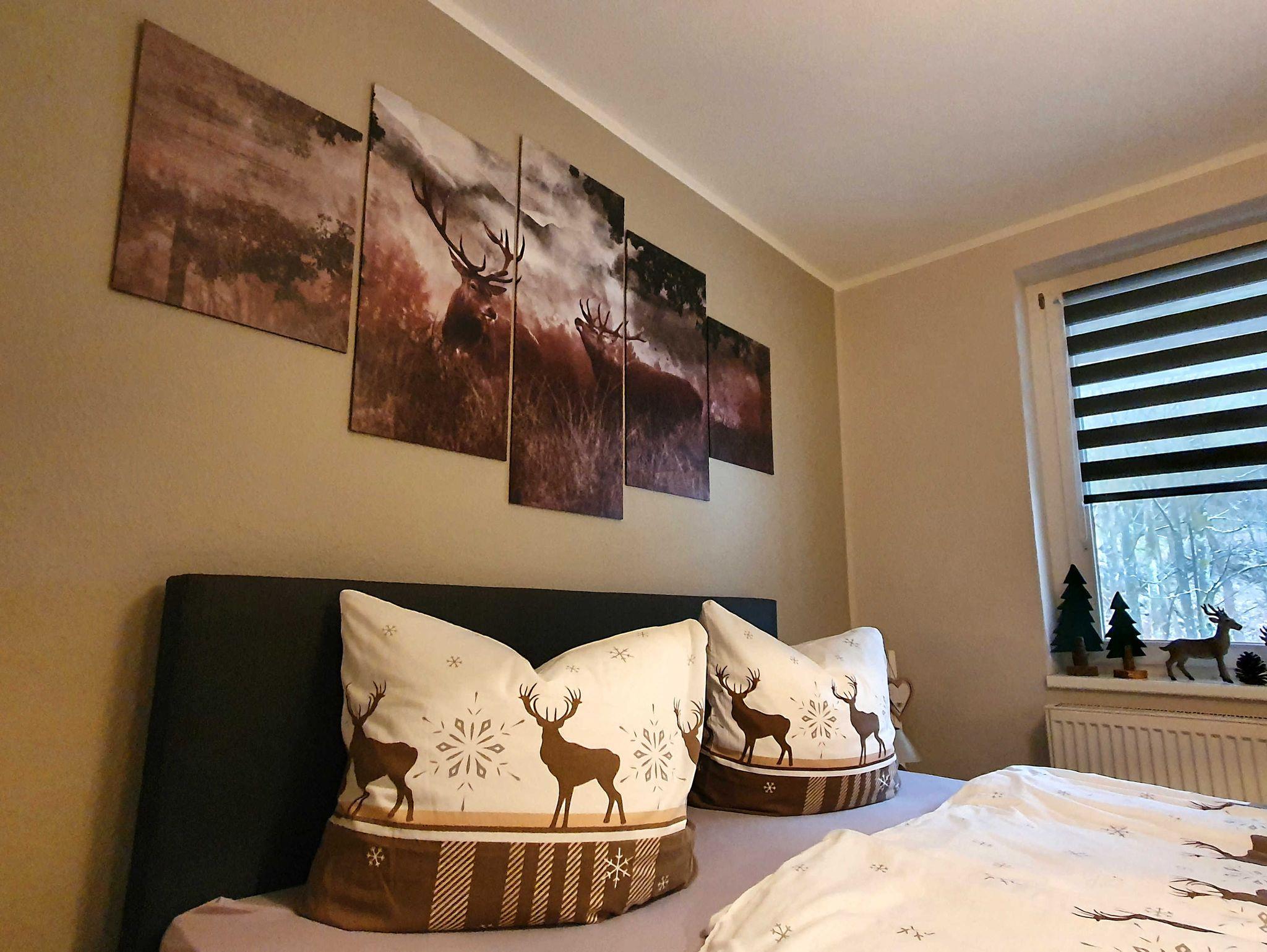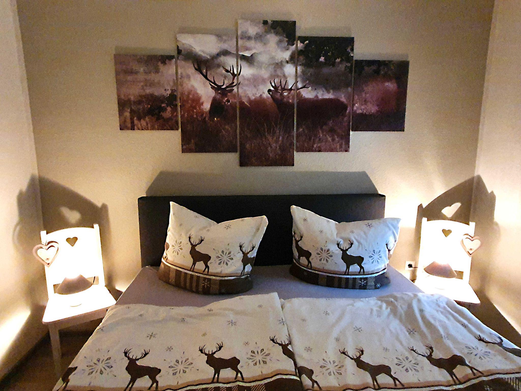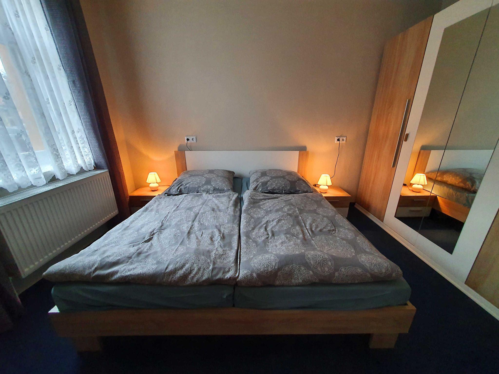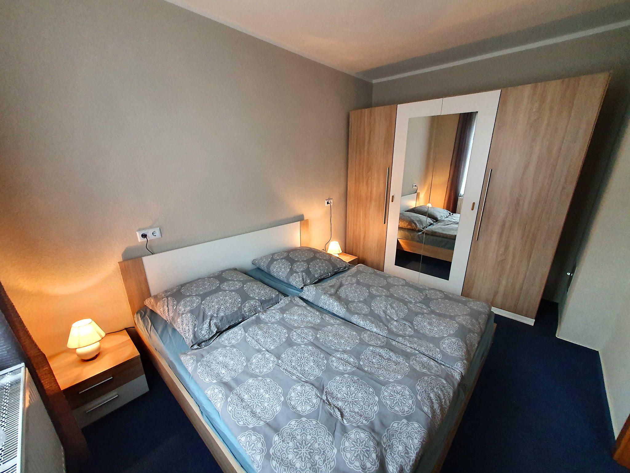Das große Schlafzimmer liegt zur Waldseite raus, mit Blick auf die Bode, es verfügt über ein Boxspringbett 180x200m mit Kleiderschrank sowie Laminatboden.