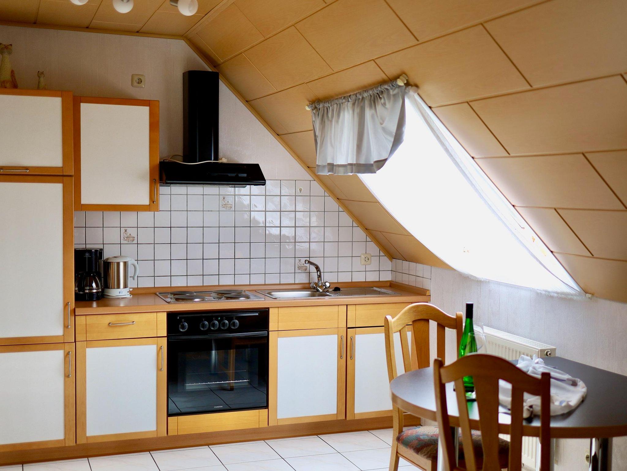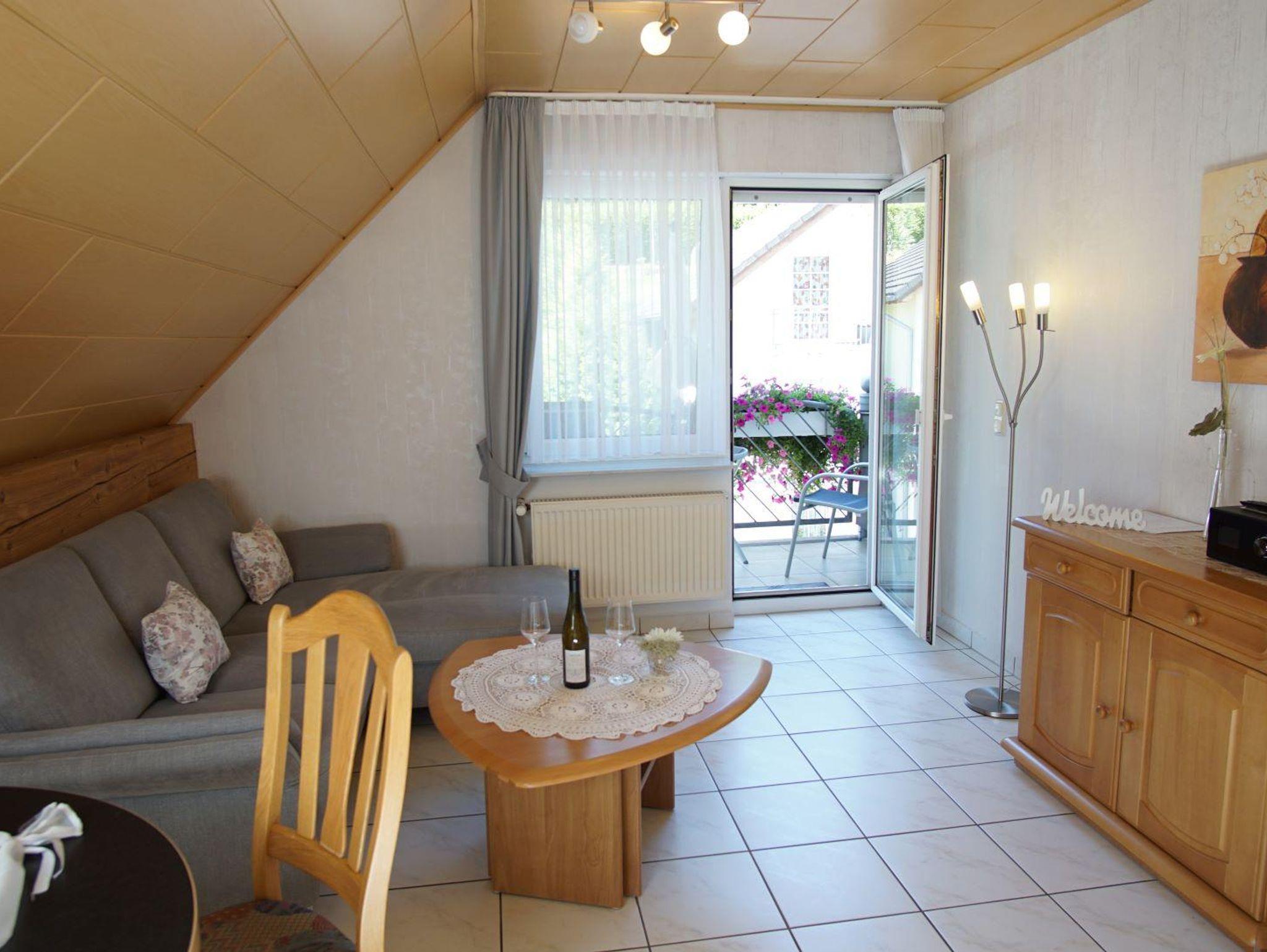 Unsere geschmackvoll in gehobenem Ambiente eingerichtete Ferienwohnung mit Balkon verfügt über eine schöne Wohnküche, Wohnzimmer, 1 Doppel-Schlafzimmer, Bad mit Dusche/WC,Fön, 50 qm, Telefon, SAT-TV, kostenneutrale WLAN-Nutzung. Bettwäsche und Handtücher sind vorhanden, Brötchenservice, Weinprobe.
