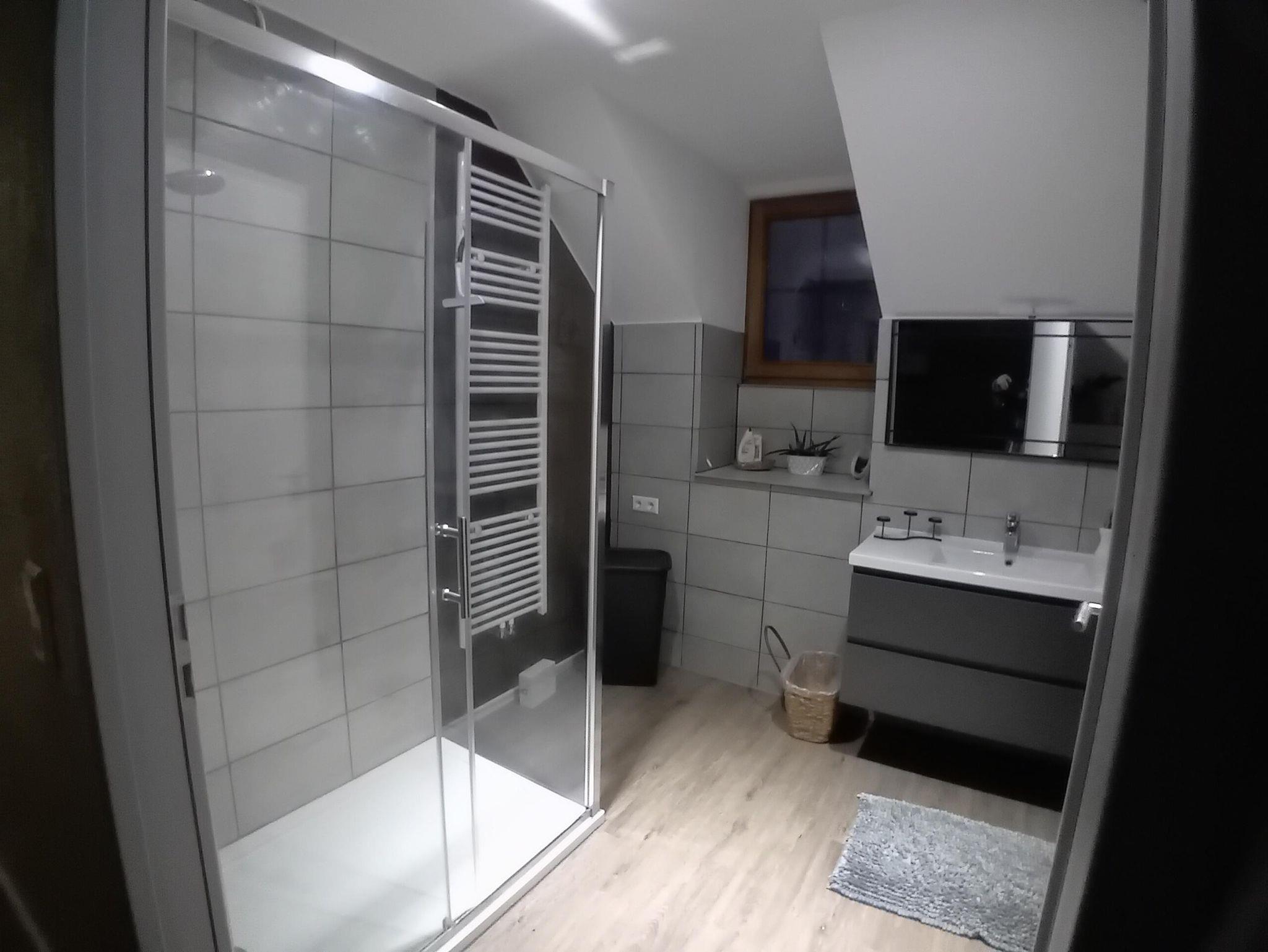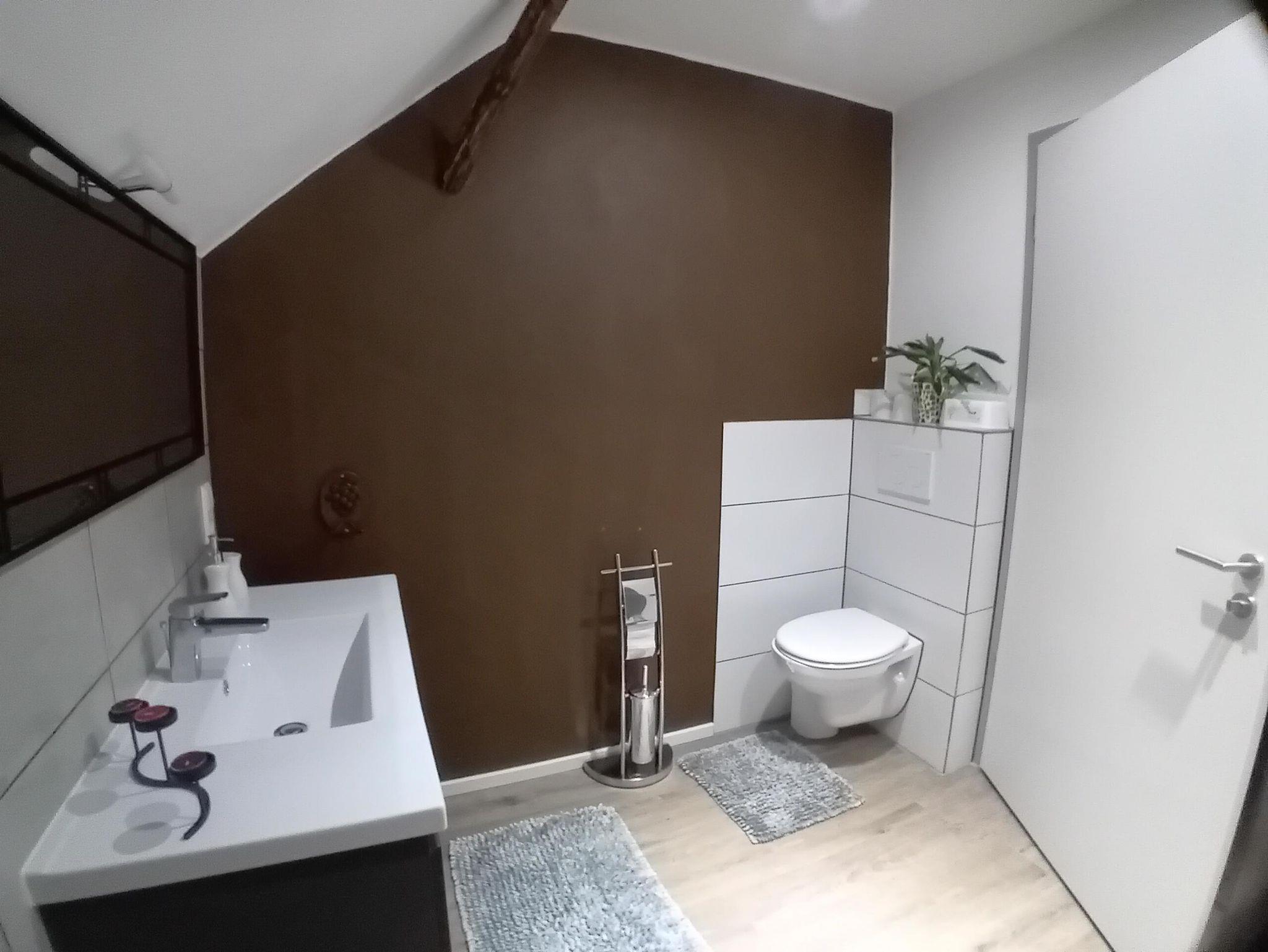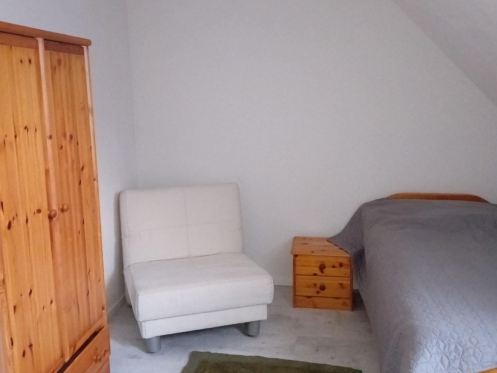 Die obere Ferienwohnung erstreckt sich über gesamtes Dachgeschoss und beträgt ca. 100qm. Dort befinden sich 3 Schlafzimmern mit zwei Doppelbetten und ein Zimmer mit einem Einzelbett und einem Schlafsessel, der schnell zu eine Einzelbett umfunktioniert werden kann. Ein großzügiges Bad mit Dusche, WC und Waschbecken ergänzt noch zusätzliches WC. Ein Wohn-/Küchenbereich verfügt ein großer Esstisch, der zum Verweilen mit Platz für 6 Personen anbietet, ebenso ist er ausgestattet mit einer Couchgarnitur, einem Fernseher und einem Bücher-Spielen-Regal.