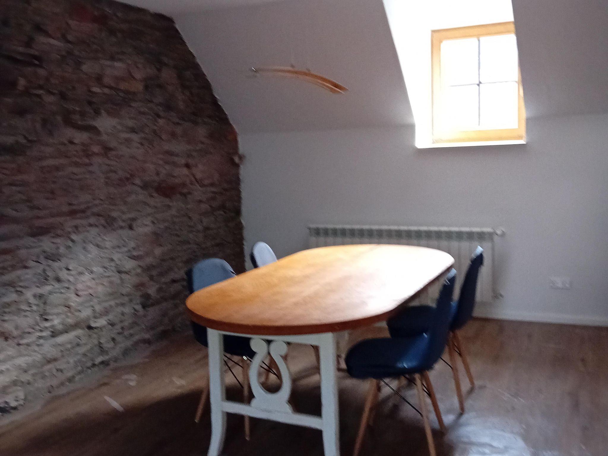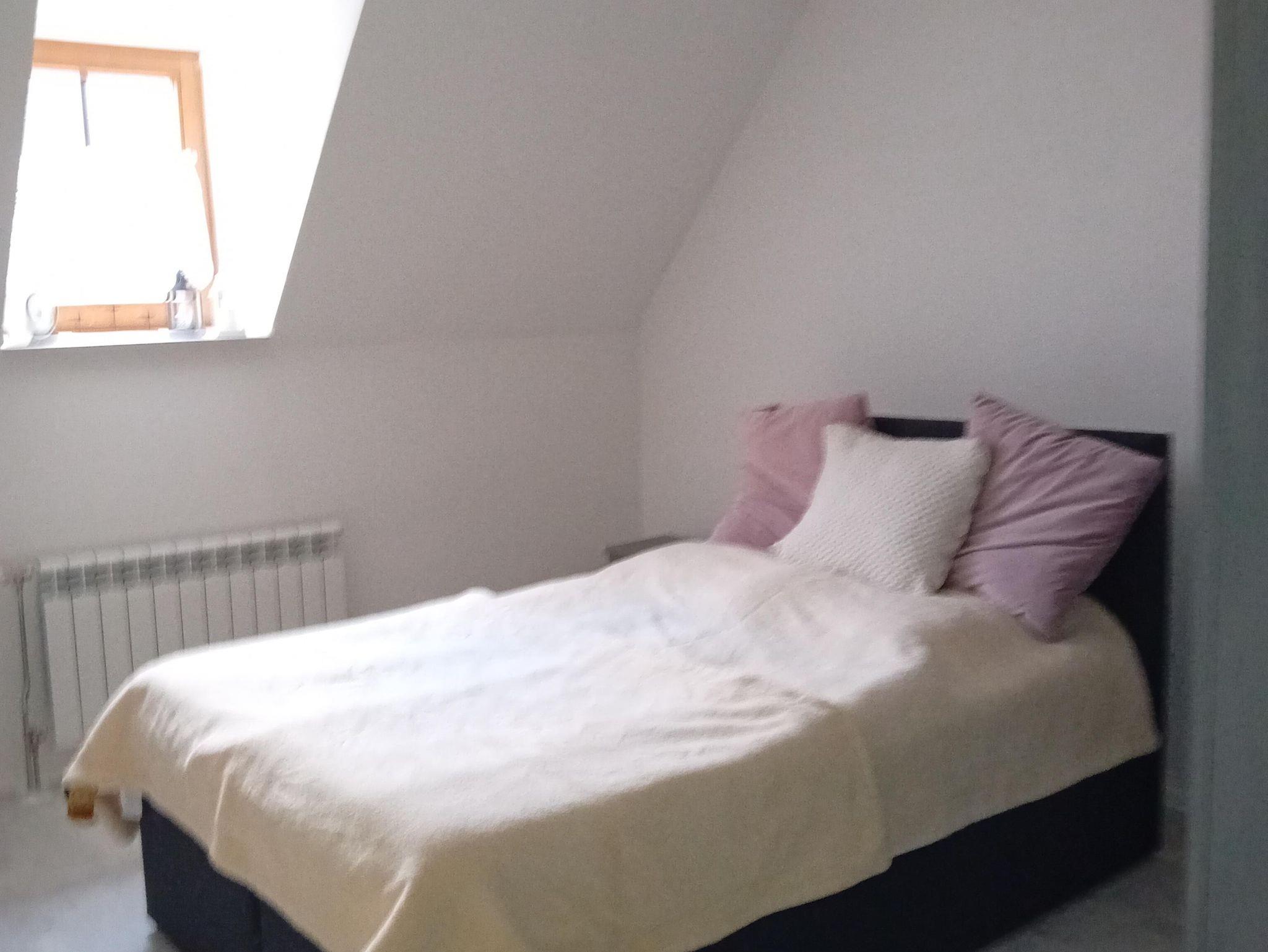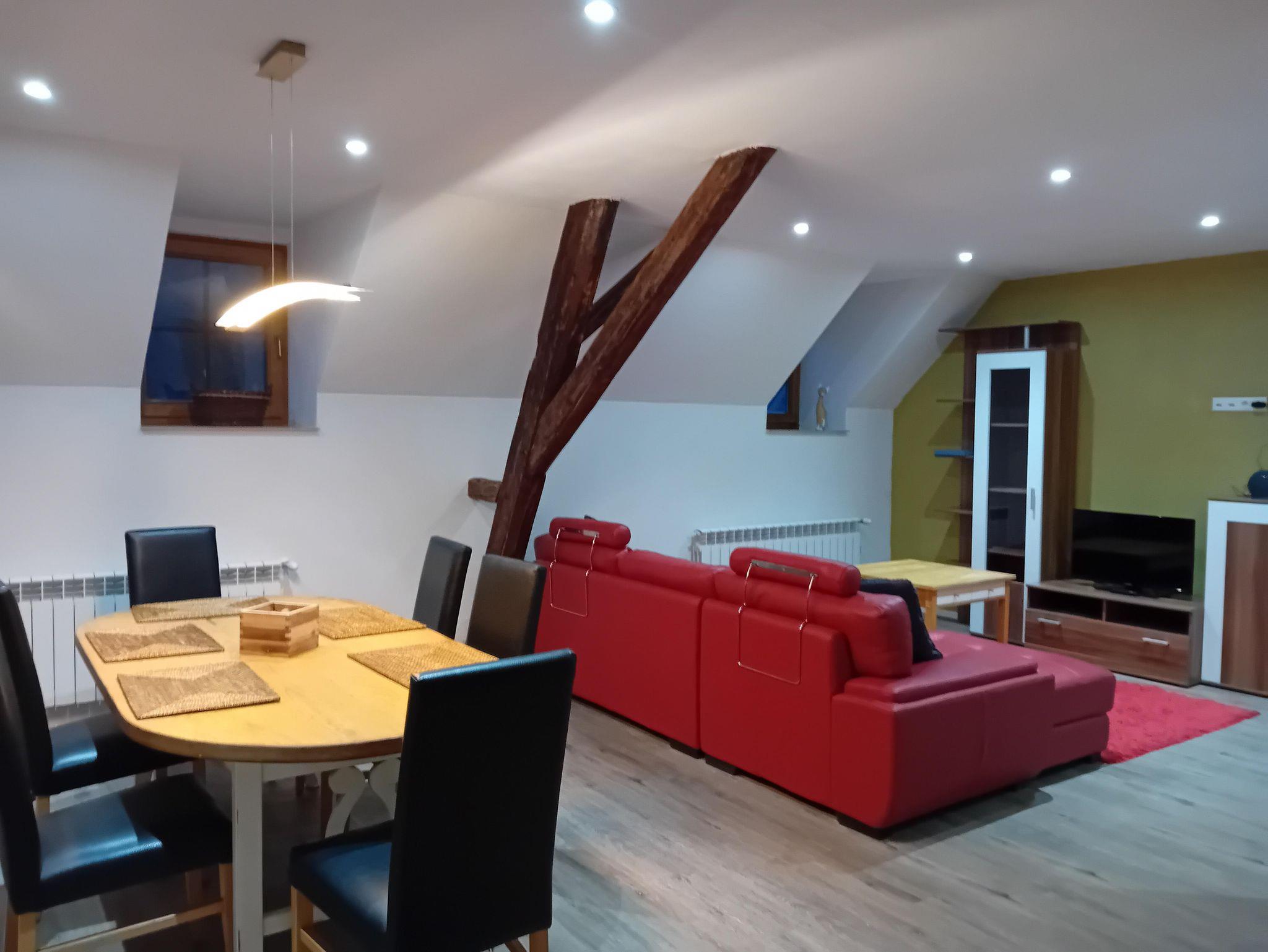 Die obere Ferienwohnung erstreckt sich über gesamtes Dachgeschoss und beträgt ca. 100qm. Dort befinden sich 3 Schlafzimmern mit zwei Doppelbetten und ein Zimmer mit einem Einzelbett und einem Schlafsessel, der schnell zu eine Einzelbett umfunktioniert werden kann. Ein großzügiges Bad mit Dusche, WC und Waschbecken ergänzt noch zusätzliches WC. Ein Wohn-/Küchenbereich verfügt ein großer Esstisch, der zum Verweilen mit Platz für 6 Personen anbietet, ebenso ist er ausgestattet mit einer Couchgarnitur, einem Fernseher und einem Bücher-Spielen-Regal.