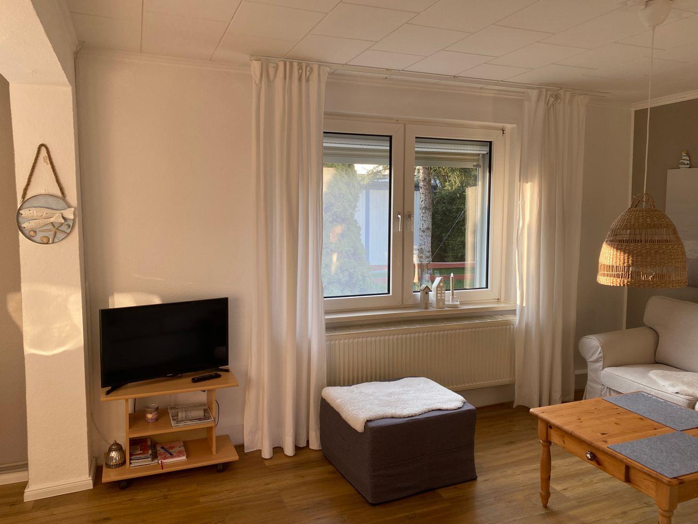 Dieses liebevoll eingerichtete 49 m² große Ferienhaus in Elmenhorst, ganz in der Nähe zu Warnemünde, ist der perfekte Ort für Paare oder Alleinreisende, die Komfort und Ruhe suchen. Über einen praktischen Vorflur mit Schuhschrank gelangen Sie in den gemütlichen Wohnbereich, der mit einem TV und einer kleinen Sitzecke zum Entspannen einlädt.