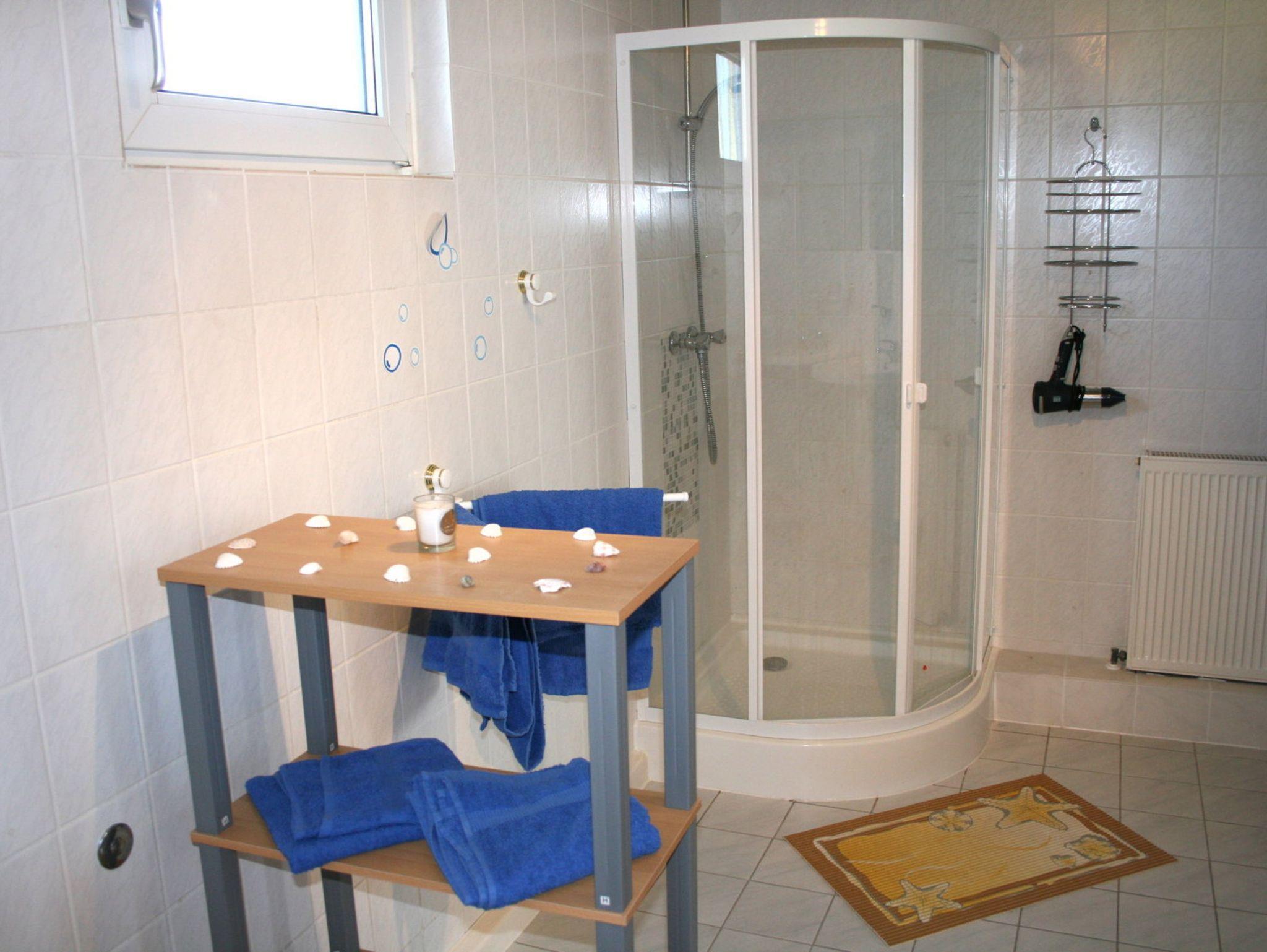 Das Bad verfügt über 2 Waschbecken, Dusche und WC.