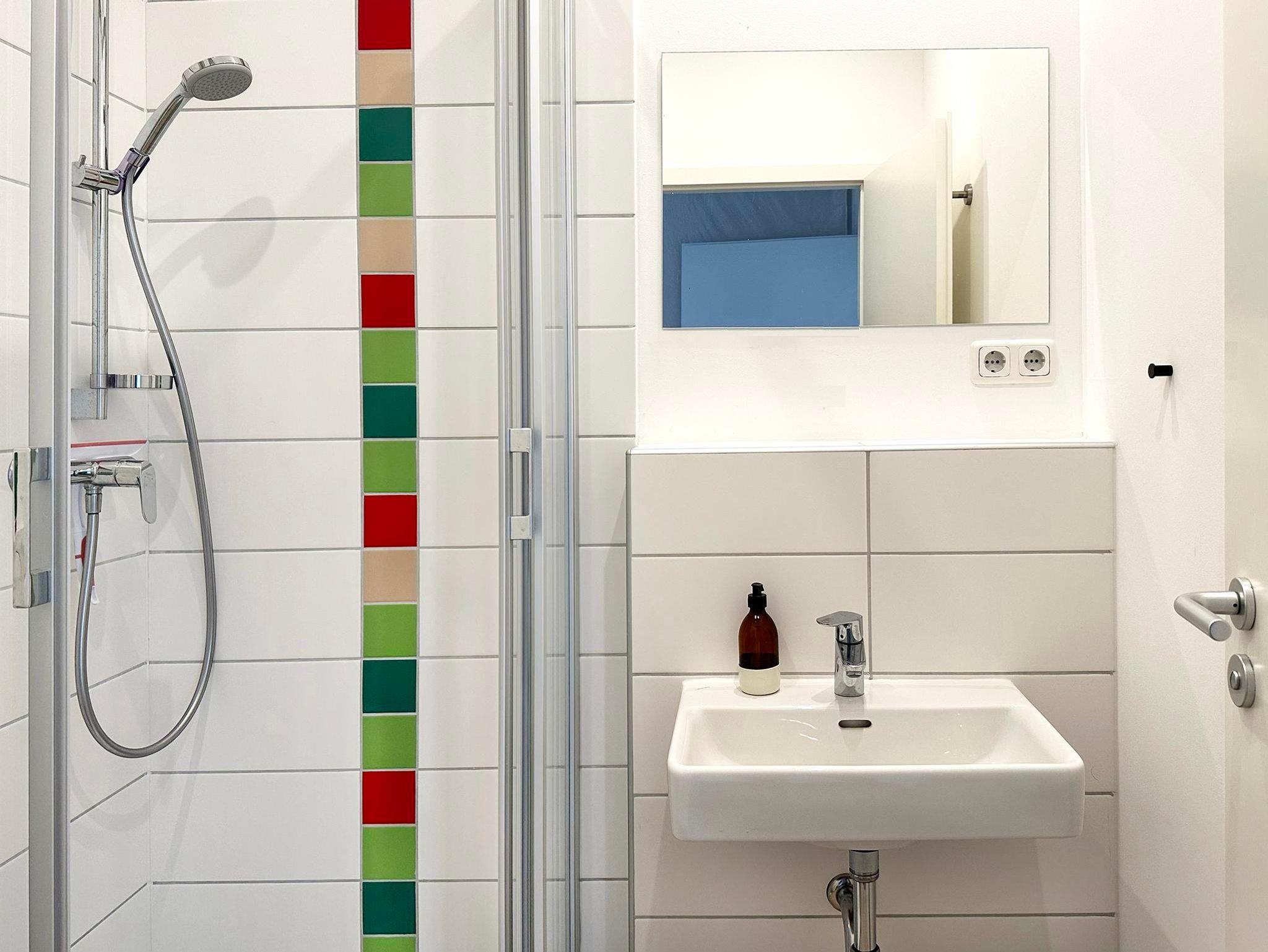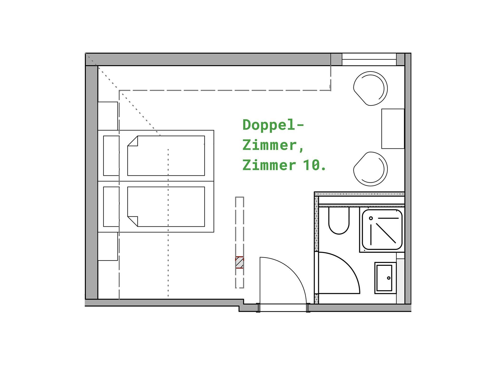 Das Doppelzimmer in der ersten Etage der Pension hat ein eigenes Duschbad mit WC und ist frisch renoviert. Es wirkt hell und freundlich und vermittelt durch das schöne Stäbchenpakett sowie die stylische Sitzecke eine besondere Atmosphäre – dieses Zimmer ähnelt Zimmer 11.