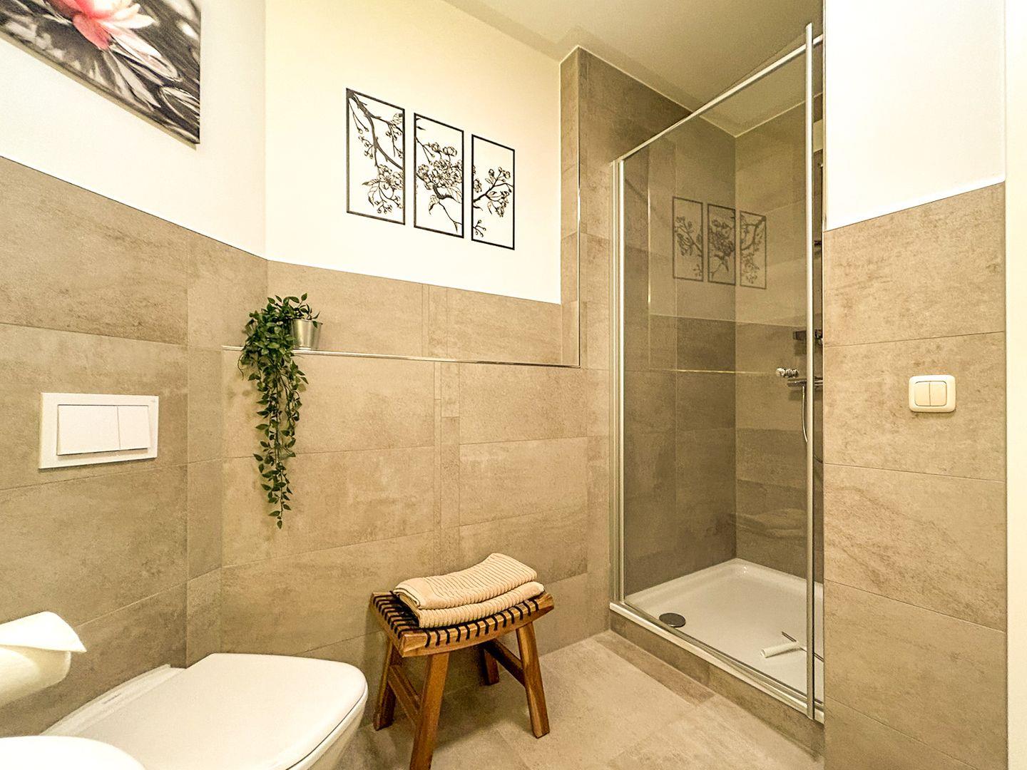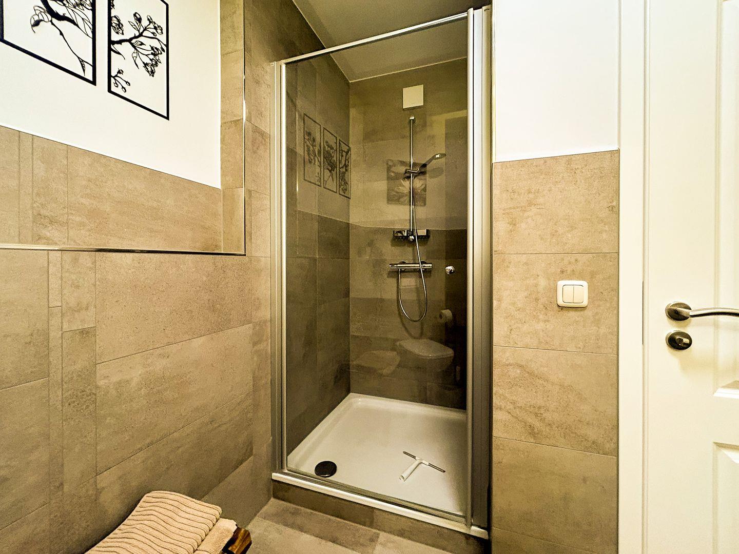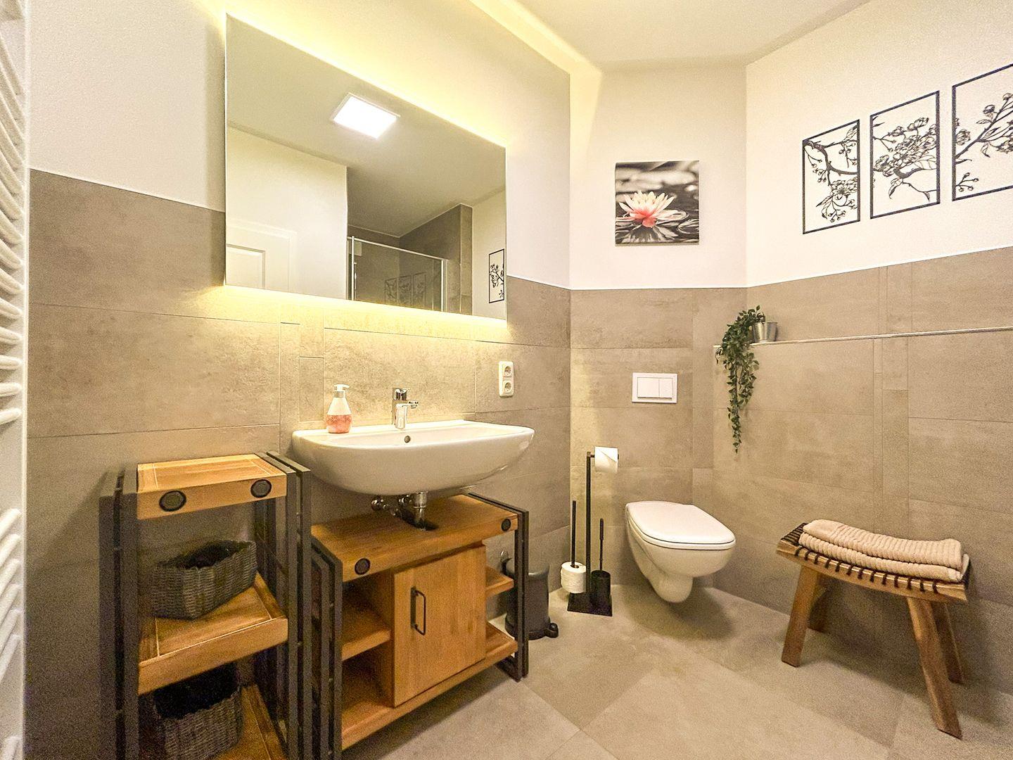 Im Erdgeschoss befindet sich zudem das modern eingerichtete Gäste-WC. Außerdem ist ein Abstellraum vorhanden, in dem ihr einen Staubsauger und weitere Reinigungsutensilien findet und in welchem ihr eure Koffer abstellen könnt.