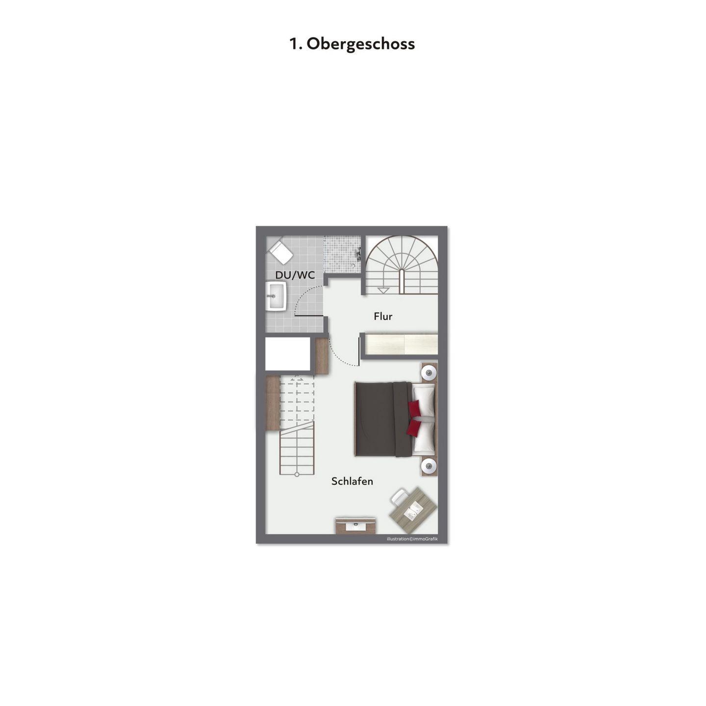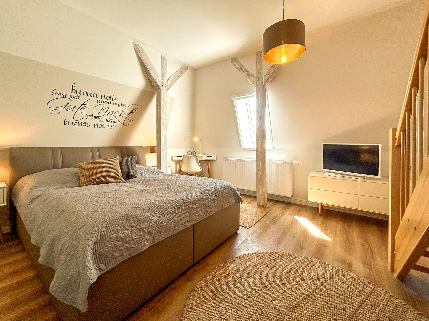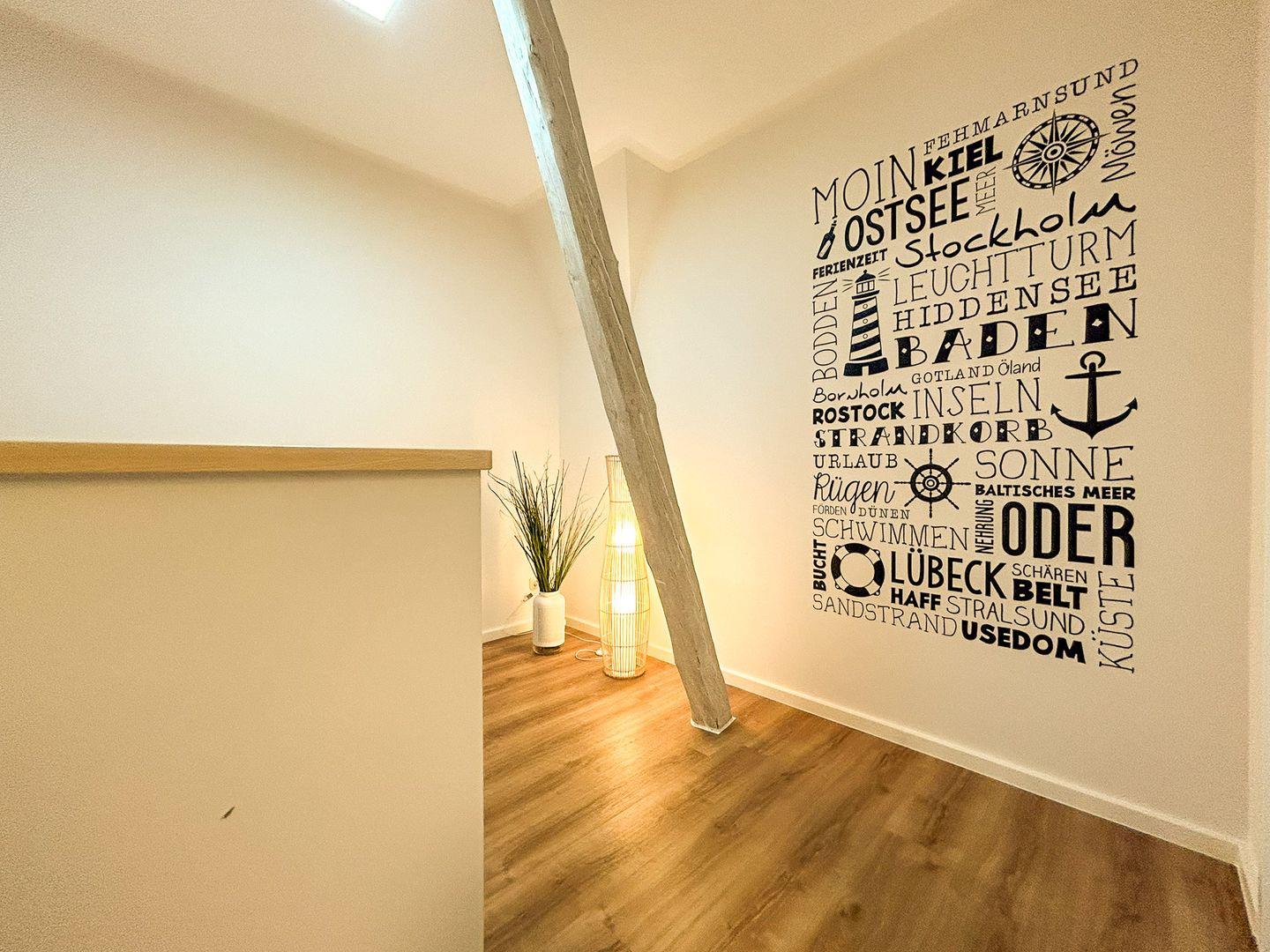 Über eine große Holztreppe gelangt ihr in den Flur des 1. Obergeschosses. Von hier aus könnt ihr das geräumige Duschbad oder das gemütliche Schlafzimmer (Doppelbett 160 x 200 cm) betreten. Dort ist ebenfalls ein TV verfügbar. Außerdem ist das Zimmer mit einem kleinen Schreibtisch möbliert, an dem ihr Postkarten über euren fantastischen Aufenthalt an der Ostseeküste schreiben könnt. In dem Kleiderschrank und einem offenen Regal habt ihr die Möglichkeit, eure Urlaubsgarderobe zu verstauen.