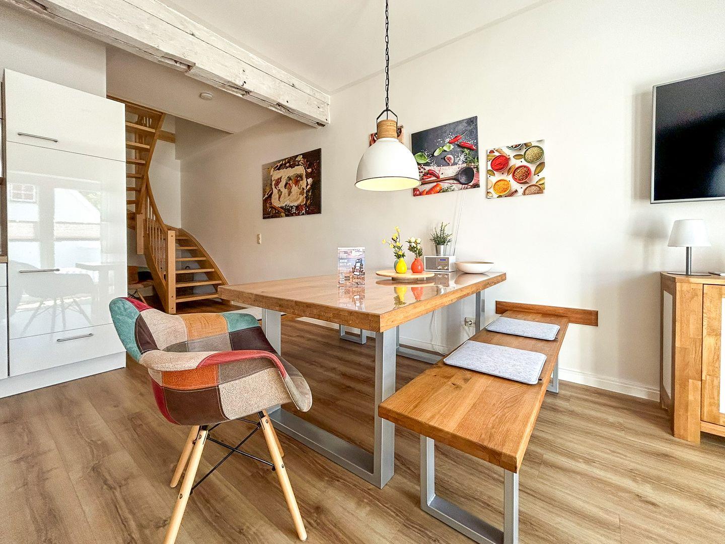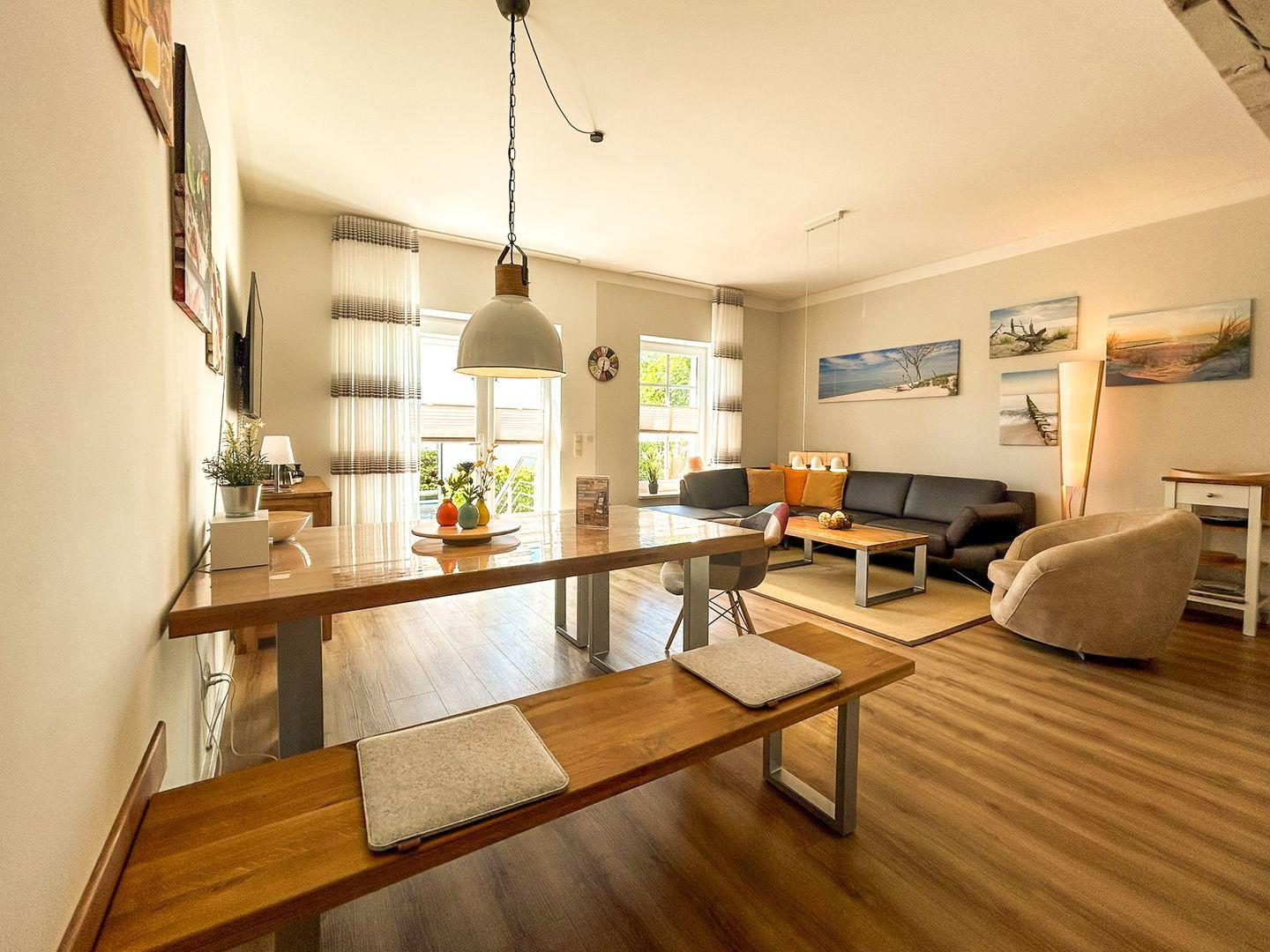 Die gesamte Wohnung ist schick und funktional eingerichtet und lädt augenblicklich zum Wohlfühlen ein. Im Wohnbereich steht euch ein 55-Zoll großer TV zur Verfügung. Der einladende Esstisch bietet ausreichend Platz für ausgedehnte Mahlzeiten mit der ganzen Familie.