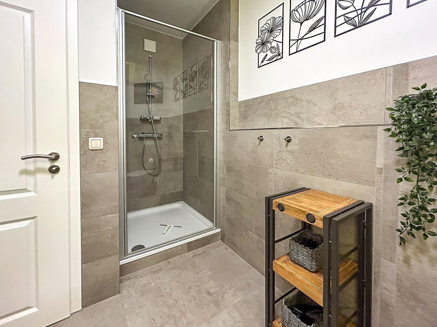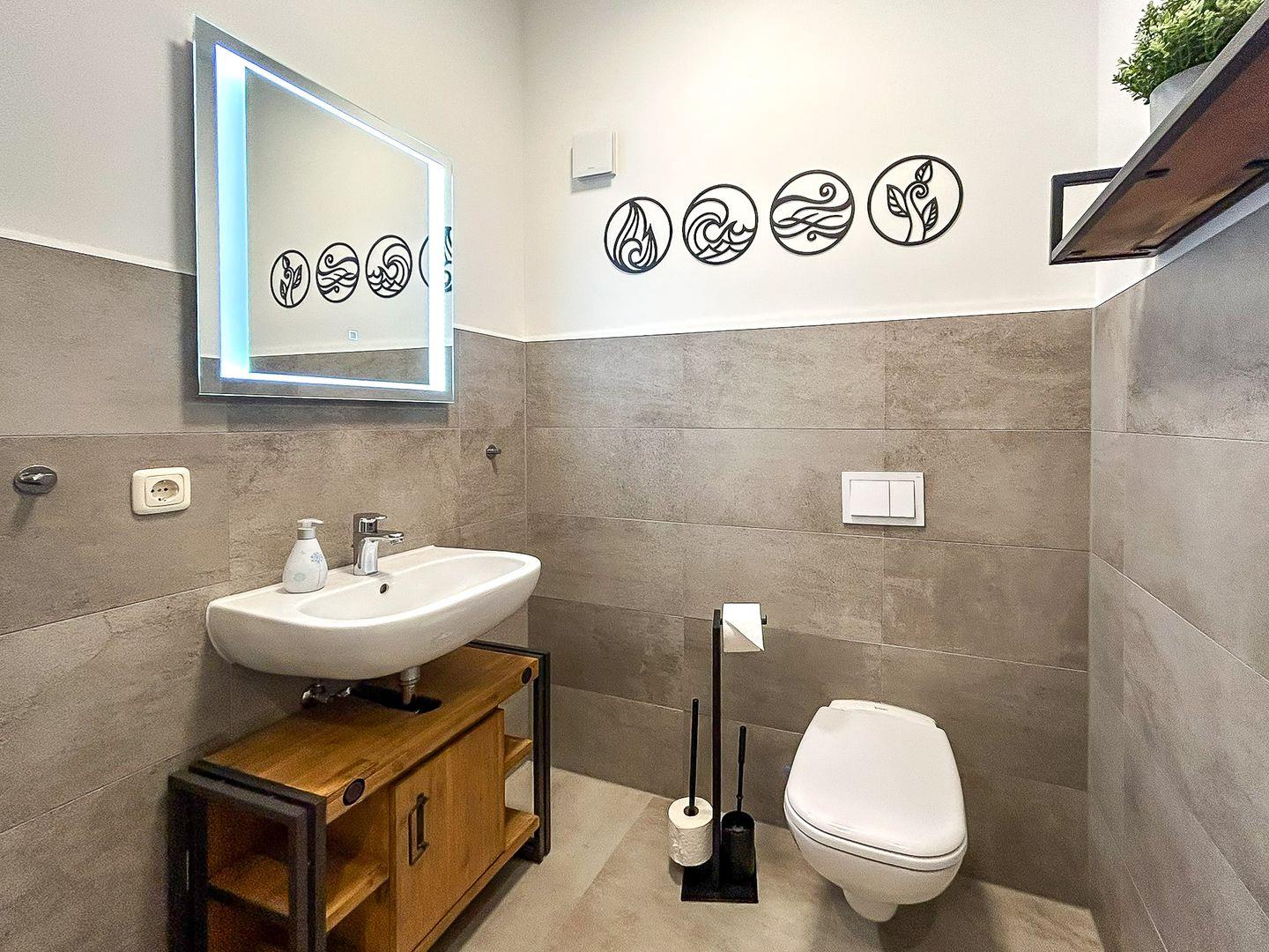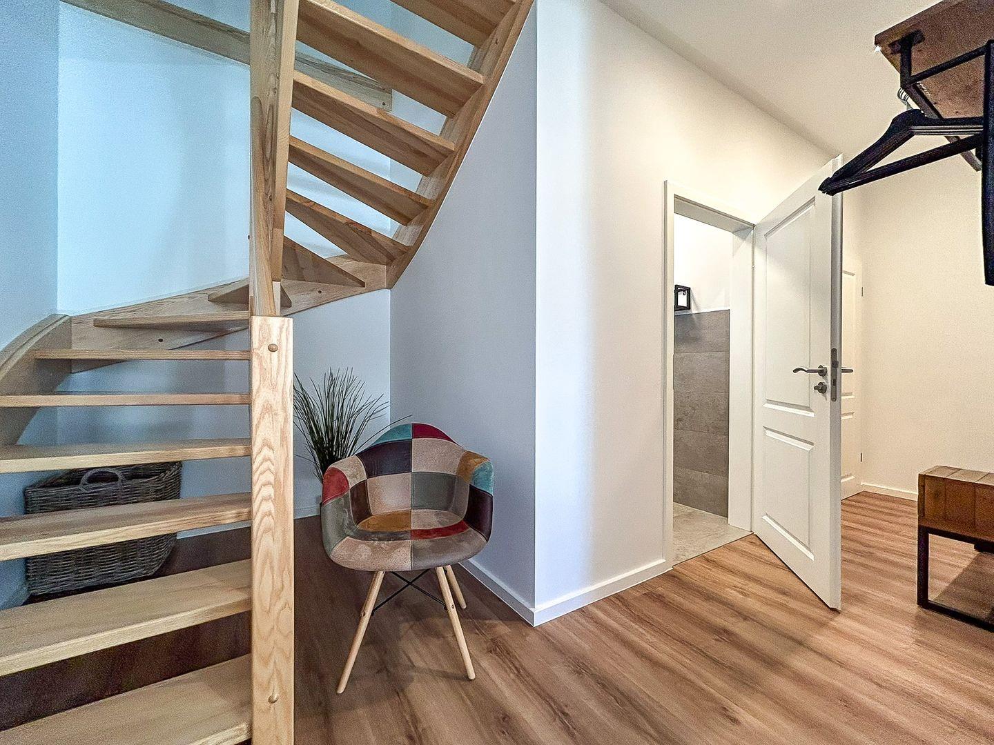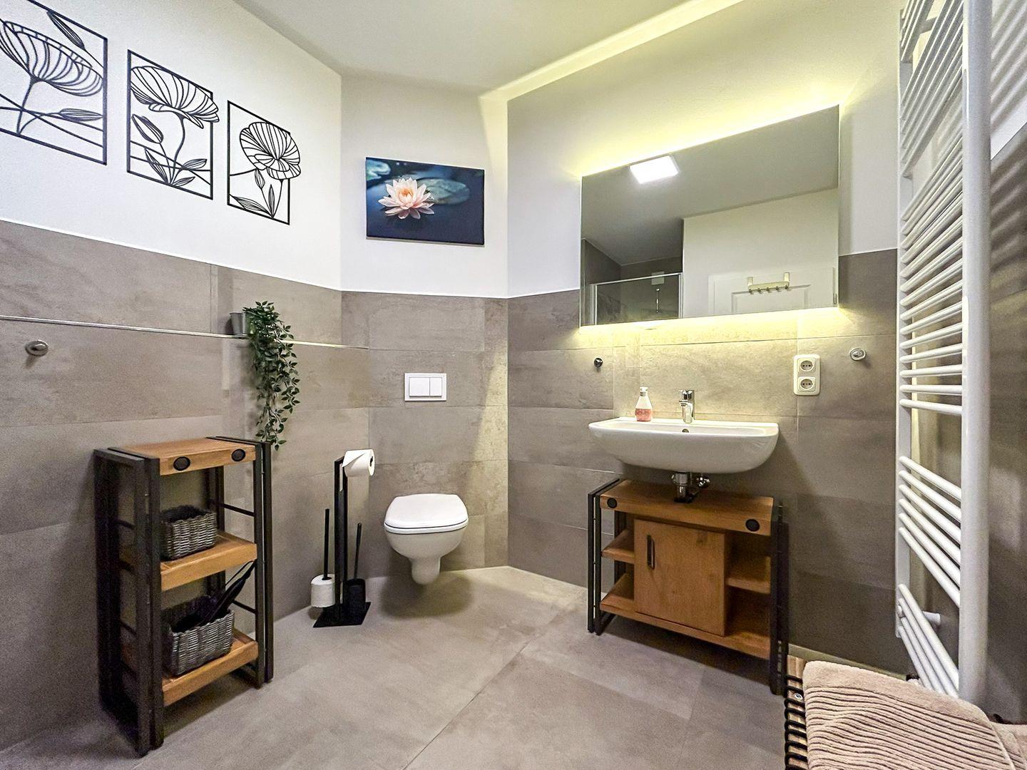 Im Erdgeschoss dieser mit individuellem Grundriss geschnittenen Ferienwohnung befindet sich weiterhin das modern eingerichtete Gäste-WC. Außerdem ist ein Abstellraum vorhanden, in dem sich ein Staubsauger und weitere Utensilien finden lassen und in welchem du deine Koffer abstellen kannst.