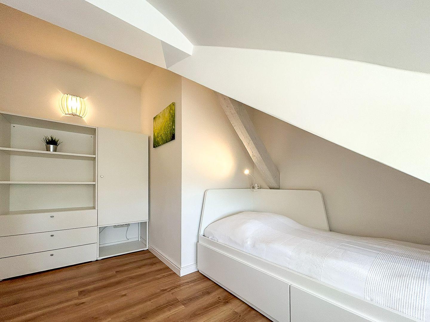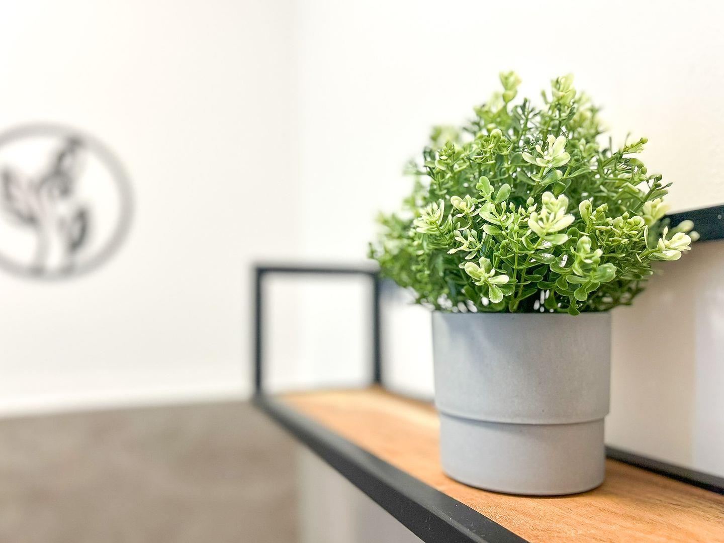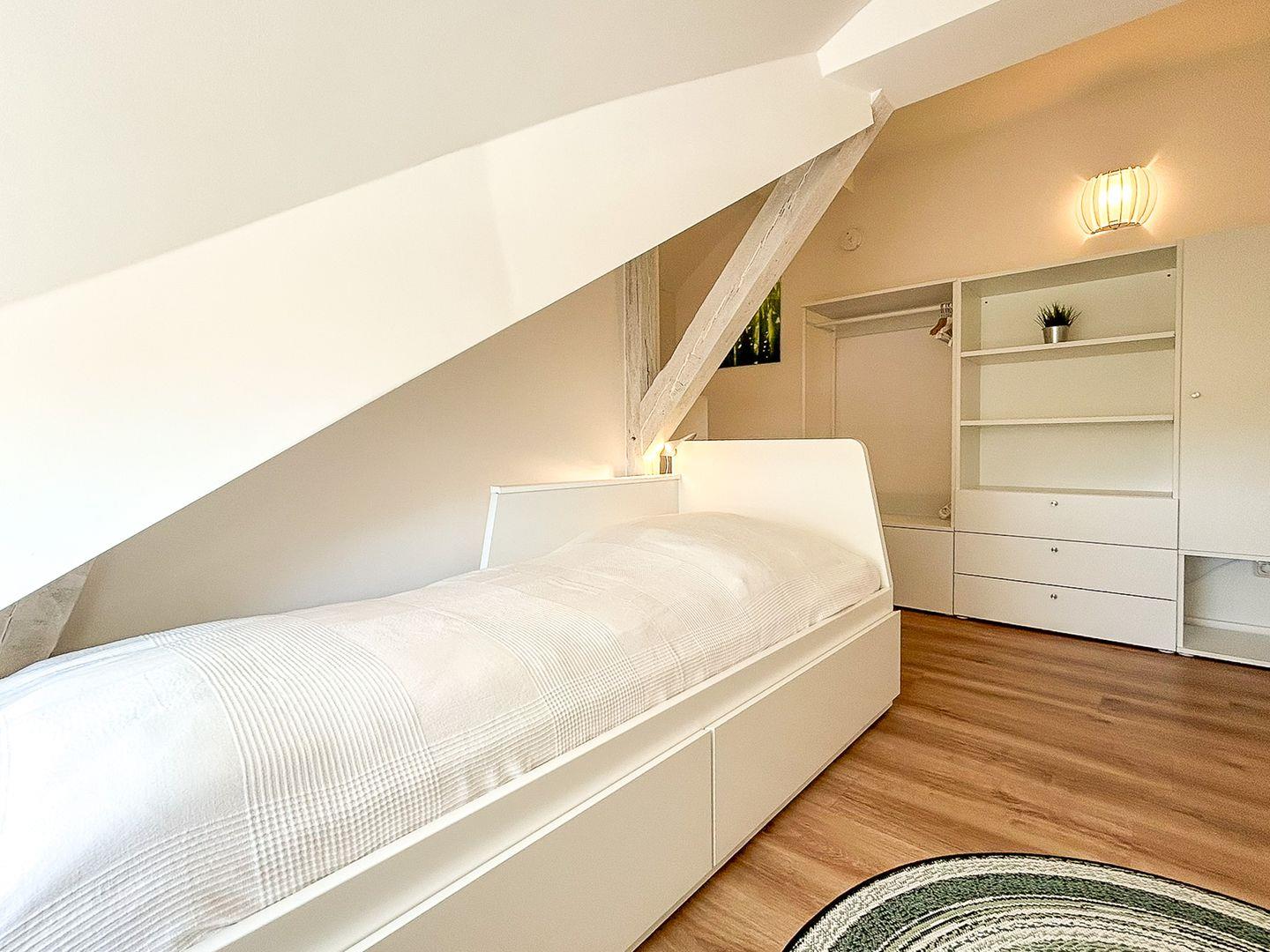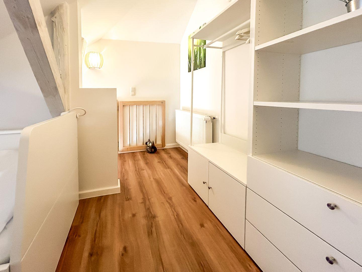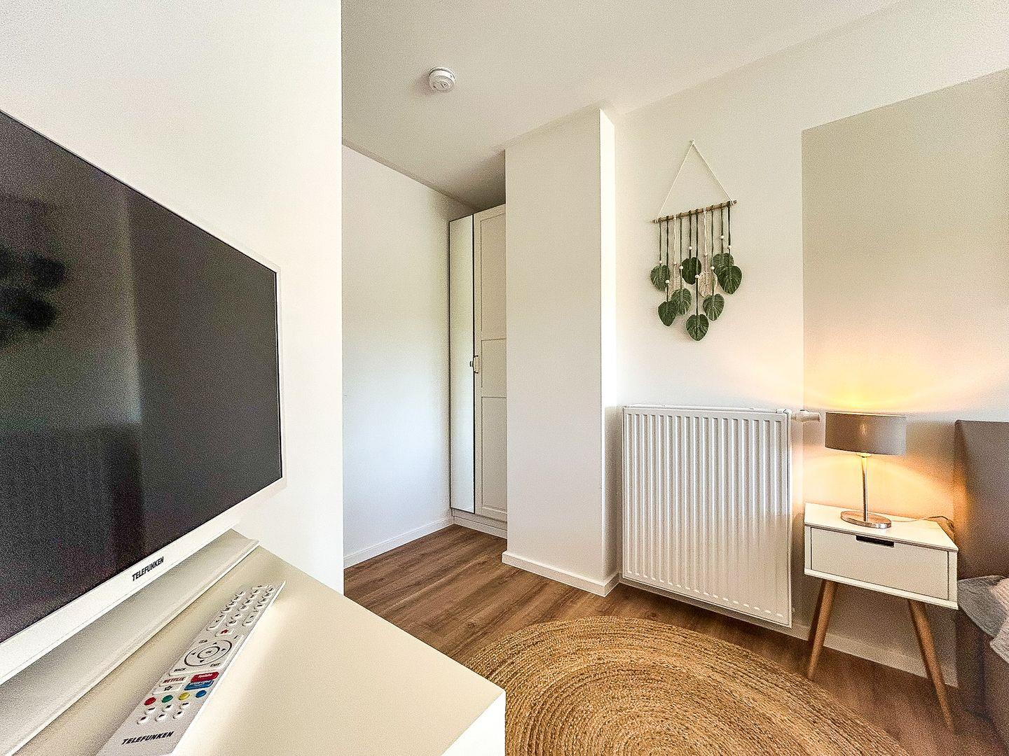 Im Erdgeschoss dieser mit individuellem Grundriss geschnittenen Ferienwohnung befindet sich weiterhin das modern eingerichtete Gäste-WC. Außerdem ist ein Abstellraum vorhanden, in dem sich ein Staubsauger und weitere Utensilien finden lassen und in welchem du deine Koffer abstellen kannst.