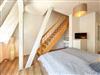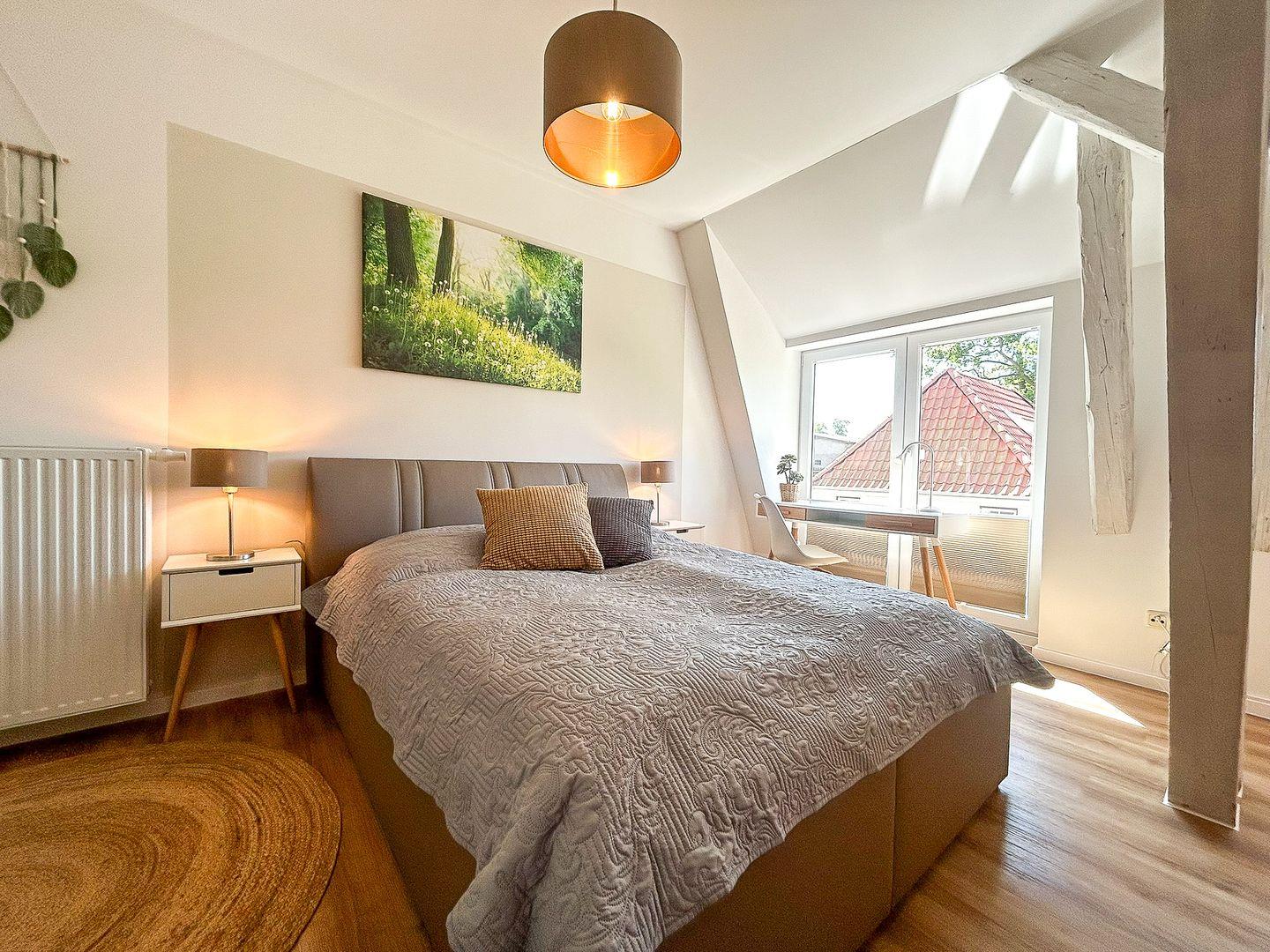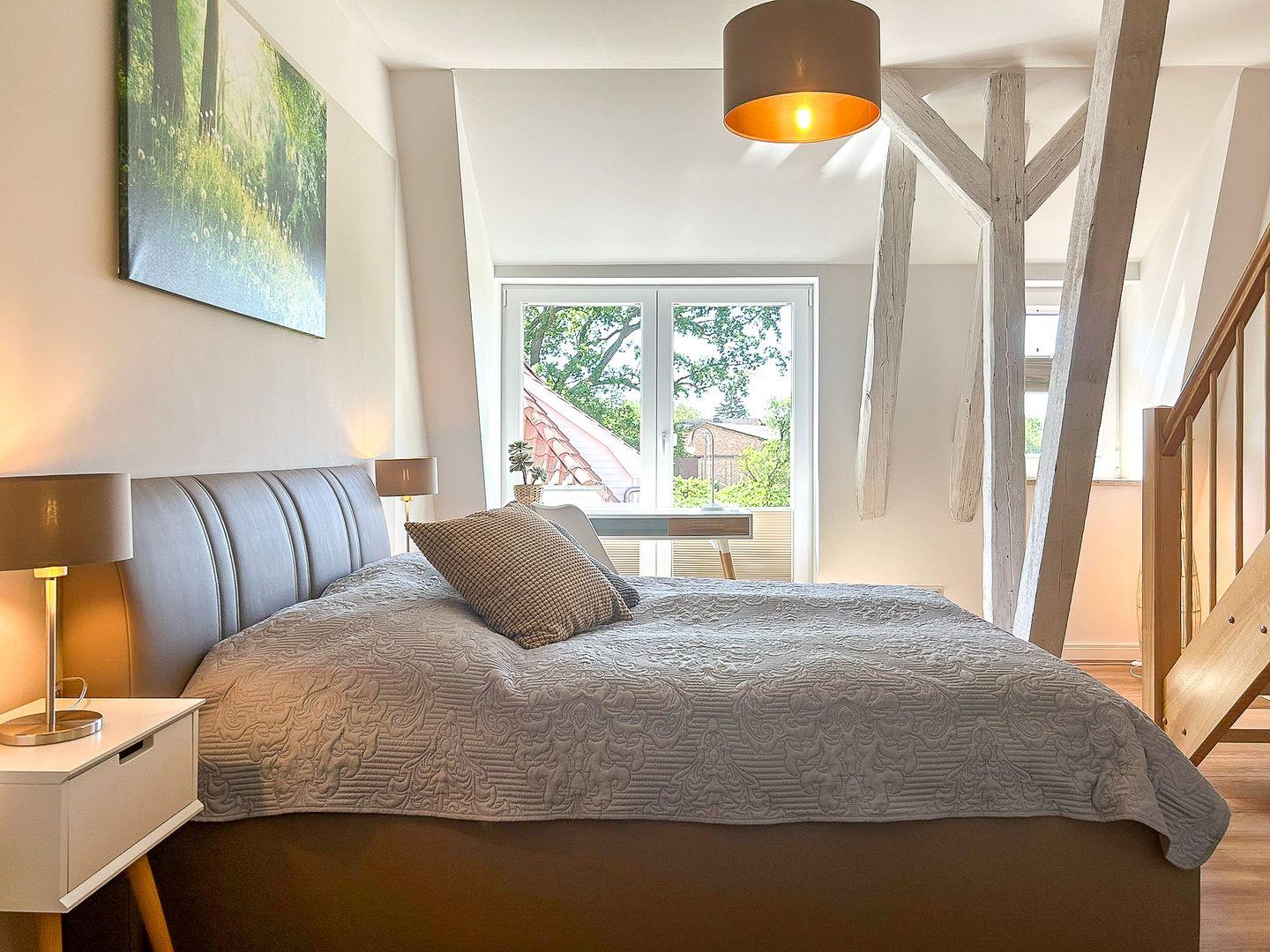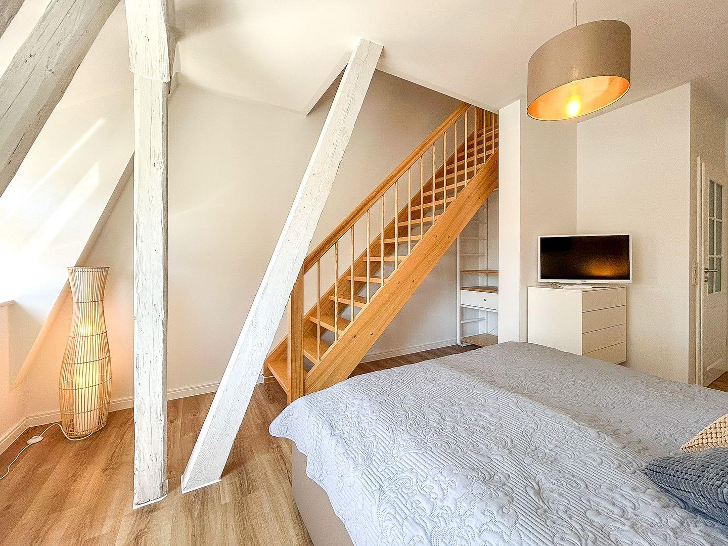 Über eine große Holztreppe gelangt man in den Flur des 1. Obergeschosses. Von hier aus kannst du das geräumige Duschbad mit Dusche oder das gemütliche Schlafzimmer (Doppelbett 160 x 200 cm) betreten. Hier steht dir ebenfalls ein TV zur Verfügung. Außerdem ist das Zimmer mit einem Schreibtisch versehen, an dem du Postkarten über deinen fantastischen Aufenthalt an der Ostseeküste schreiben kannst. In dem Kleiderschrank und einem offenen Regal hast du Gelegenheit, deine Urlaubsgarderobe zu verstauen.