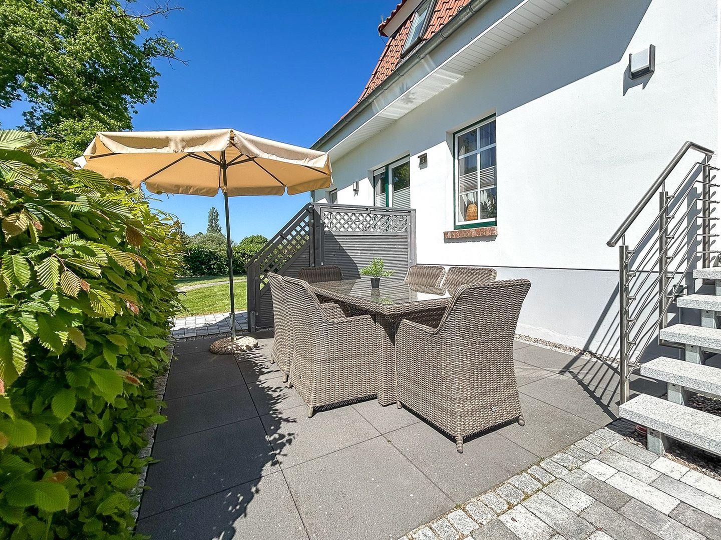 Die überdachte Holzterrasse des angrenzenden Gebäudes ist für alle Gäste frei nutzbar. Von hier aus kannst du auch prima die untergehende Sonne genießen.